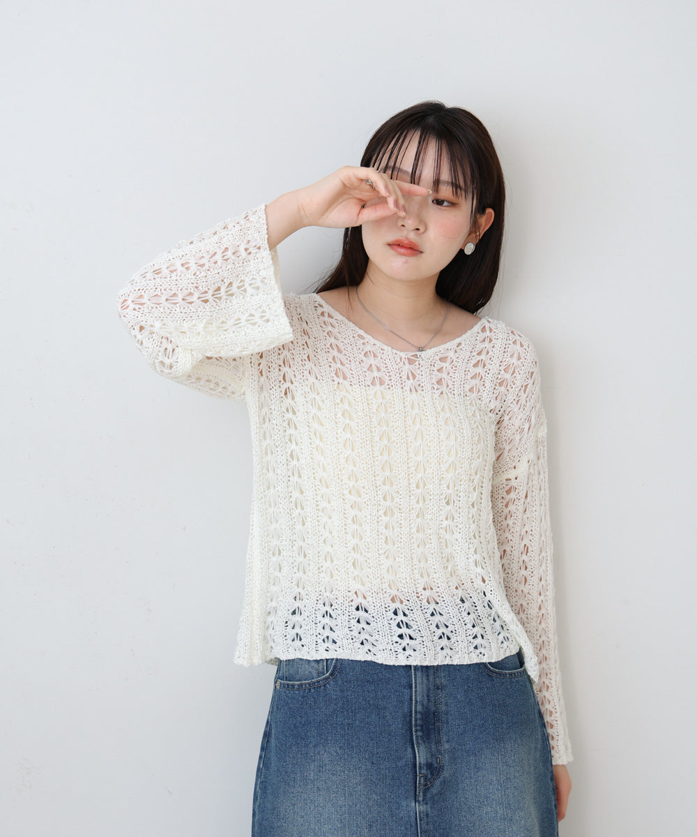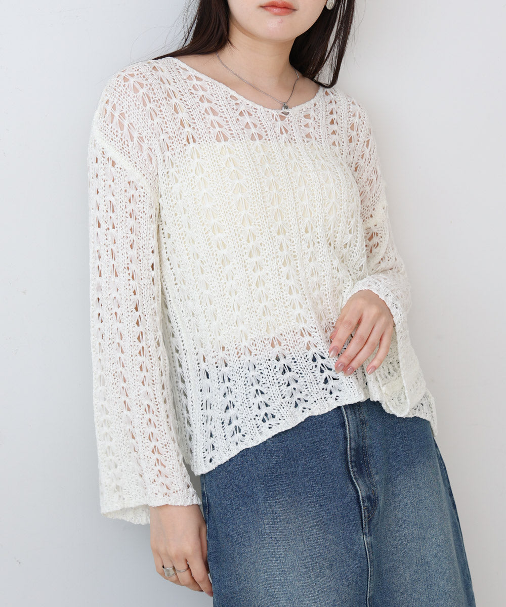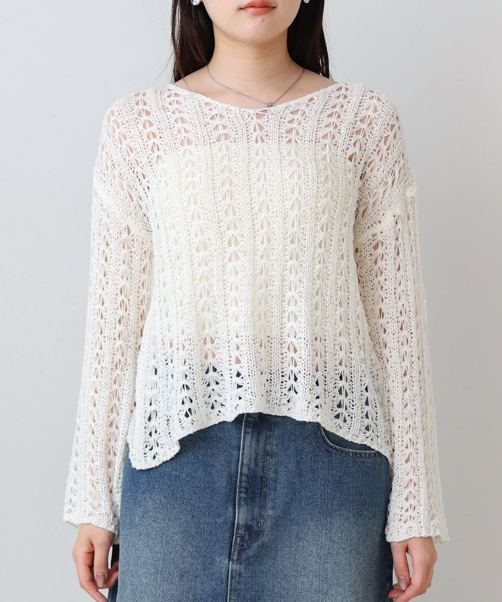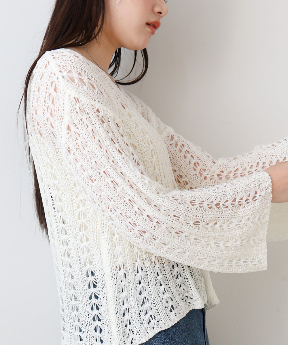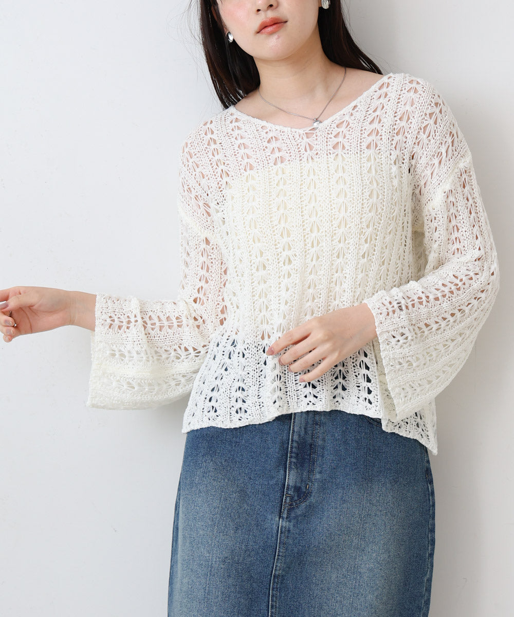 フラワー模様が可愛いレースニットトップスの登場です!網目が縦ラインに沿って入っているので華奢見えして見えるのもうれしいポイントです。フラワー模様のフェミニンさと網目の空き具合の抜け感が絶妙にマッチして、上品さもありながらどこかカジュアル感もそなえたトップスに仕上がっています。さらにストレッチ性があるので着やすくなっています。