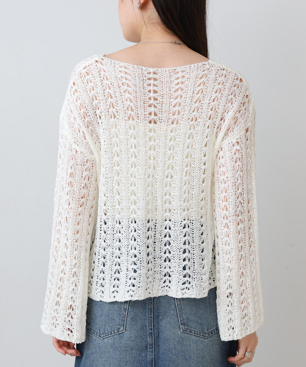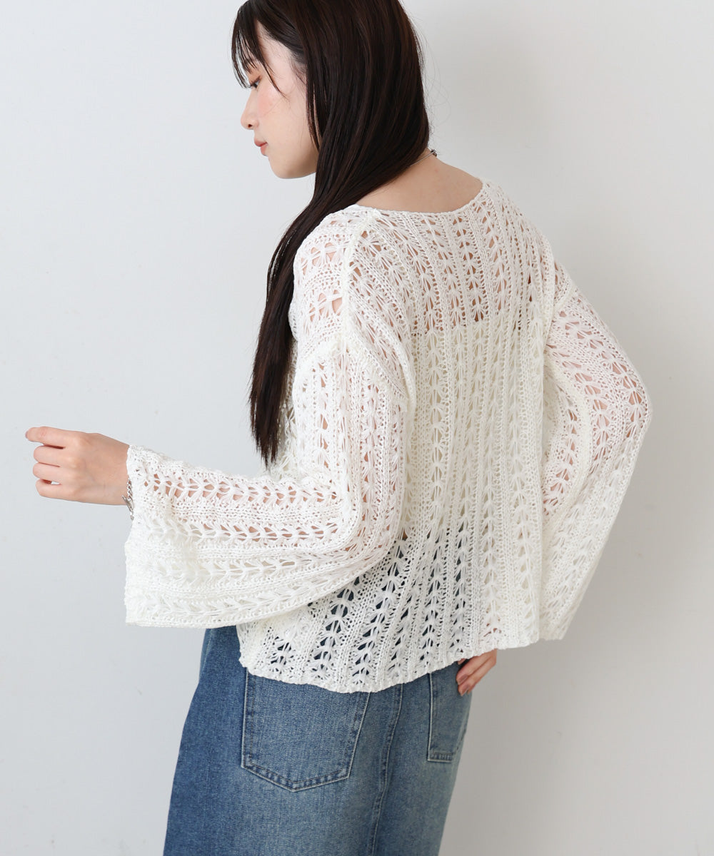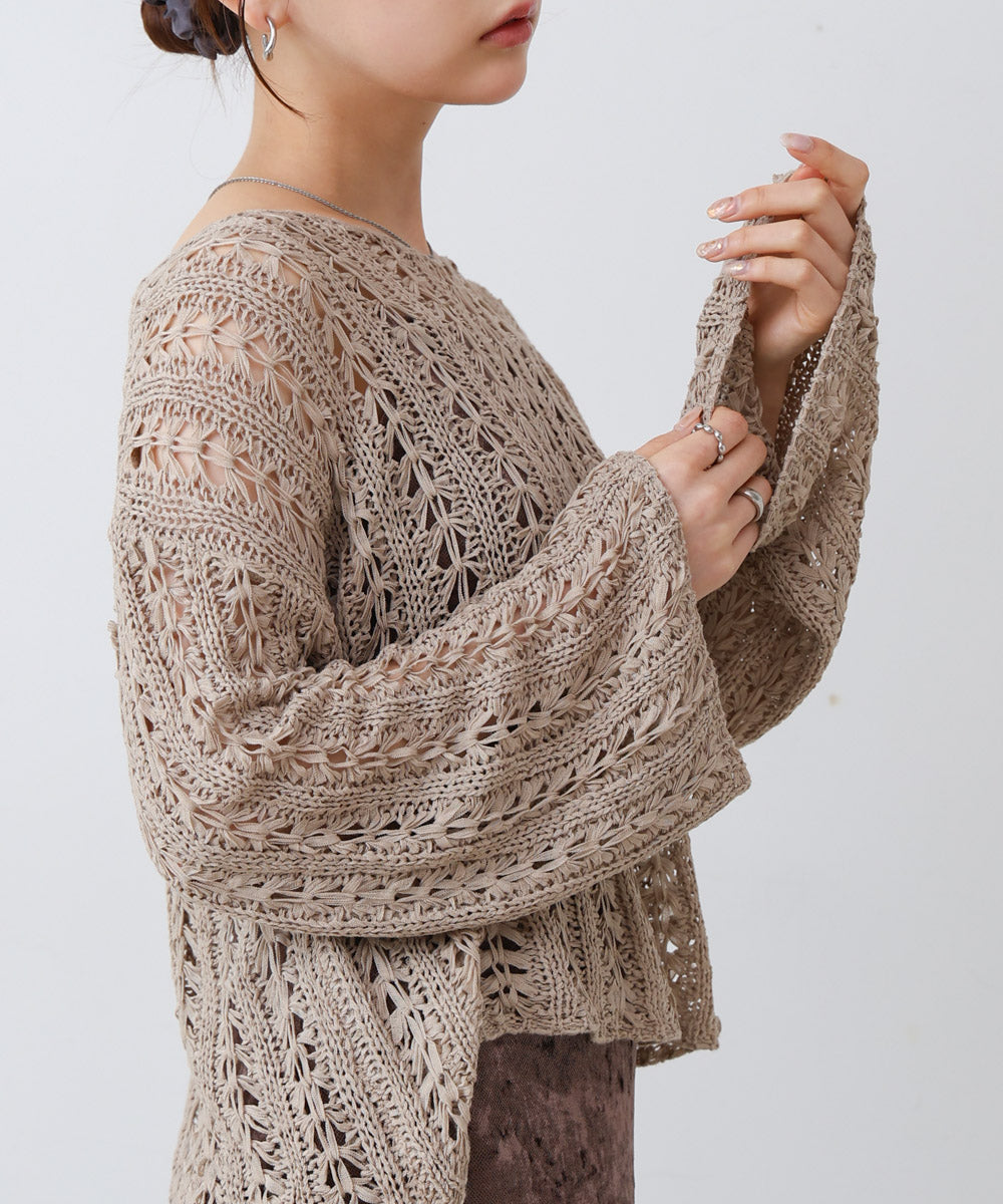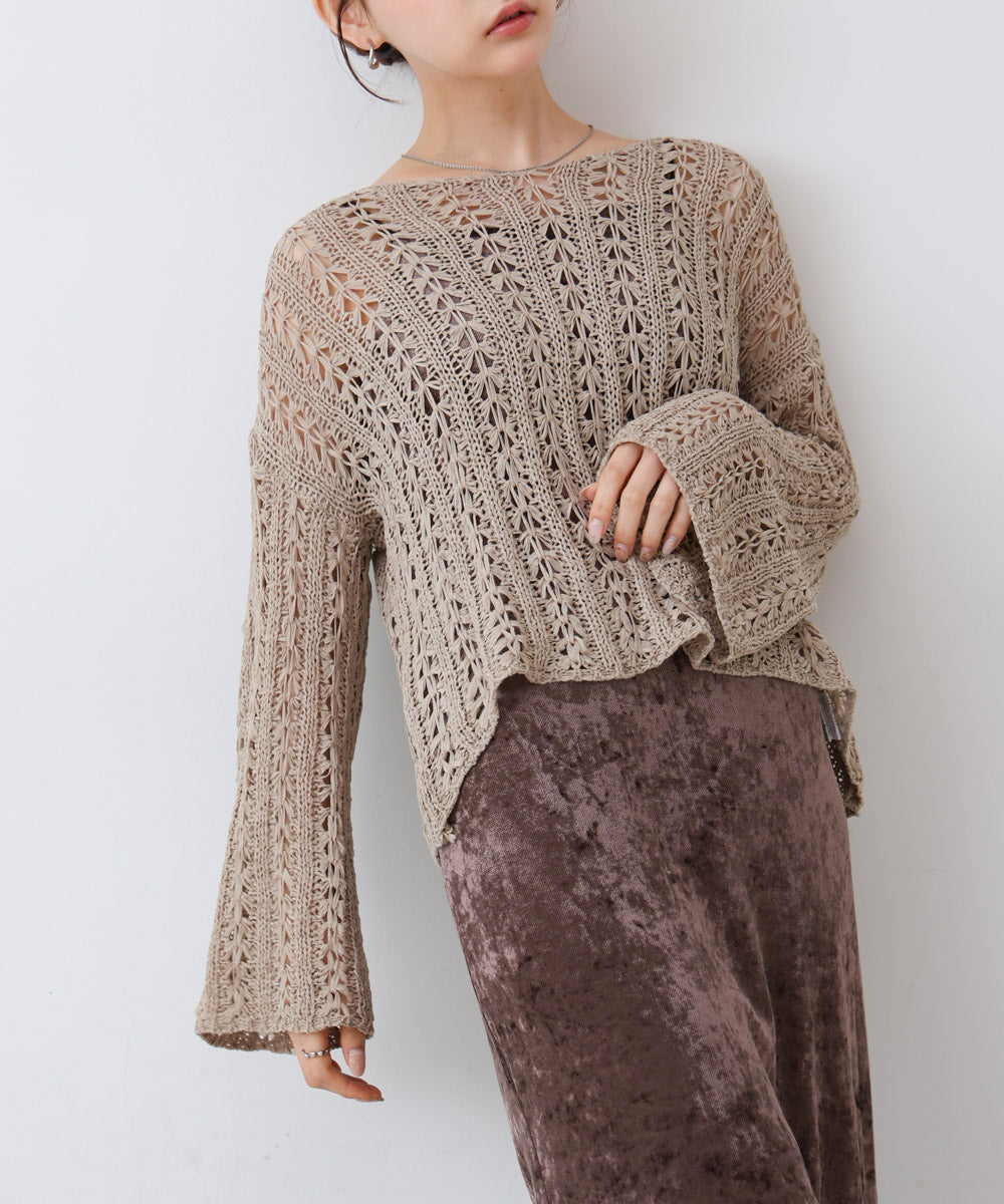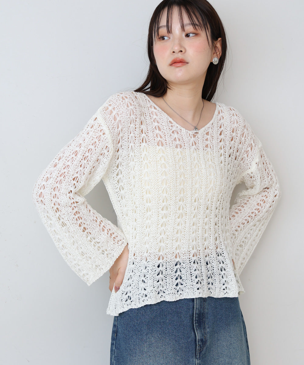 フラワー模様が可愛いレースニットトップスの登場です!網目が縦ラインに沿って入っているので華奢見えして見えるのもうれしいポイントです。フラワー模様のフェミニンさと網目の空き具合の抜け感が絶妙にマッチして、上品さもありながらどこかカジュアル感もそなえたトップスに仕上がっています。さらにストレッチ性があるので着やすくなっています。