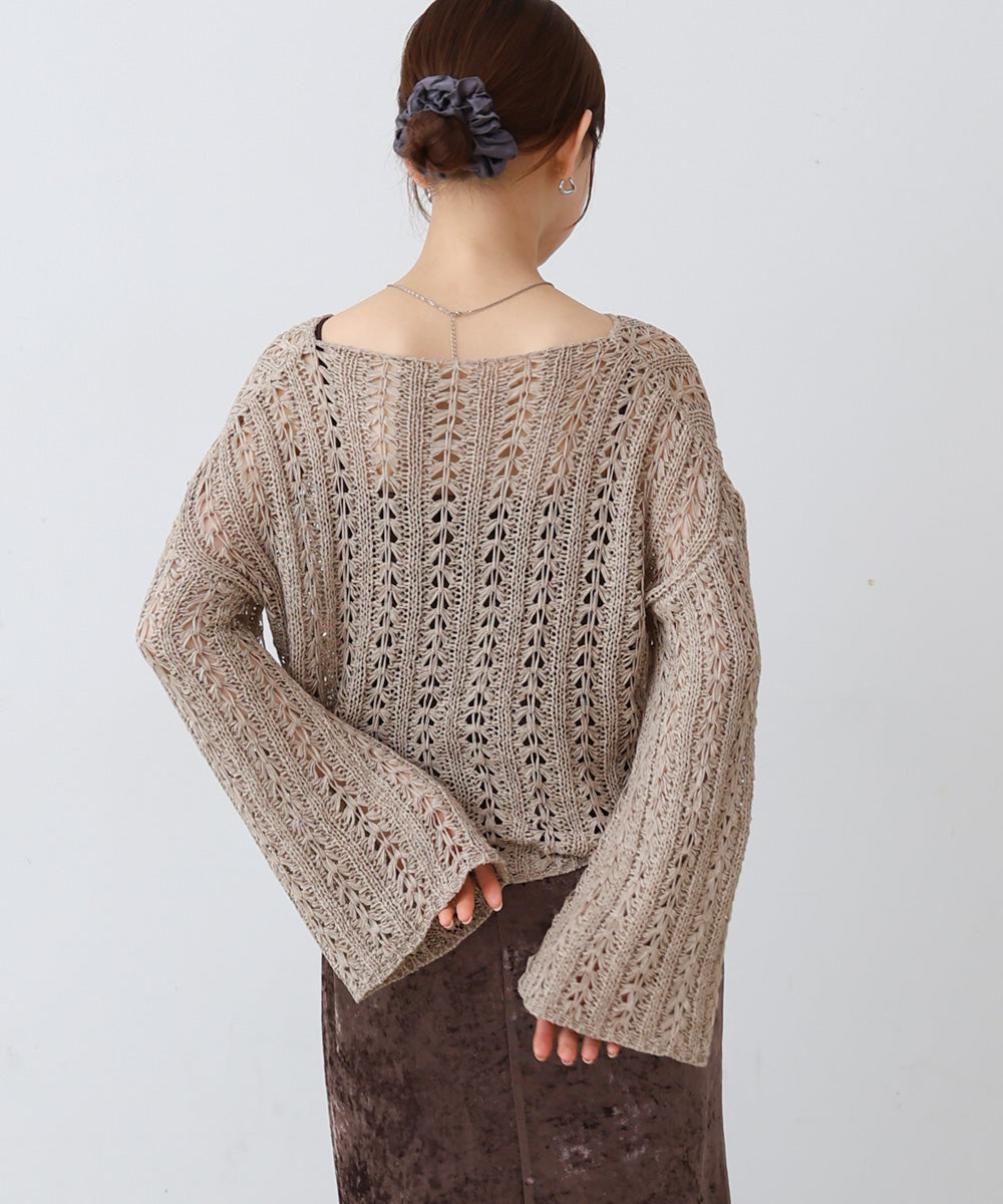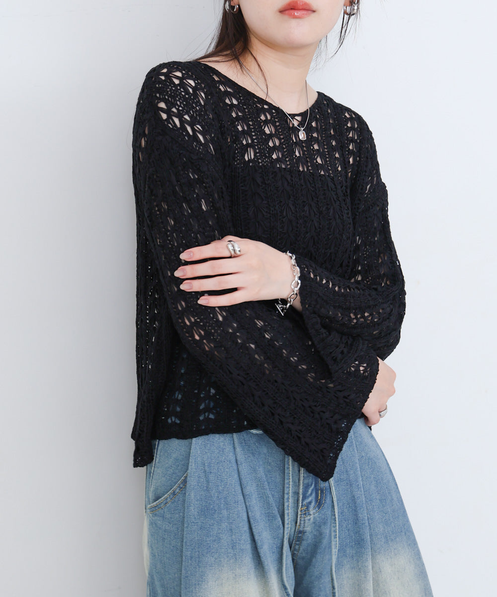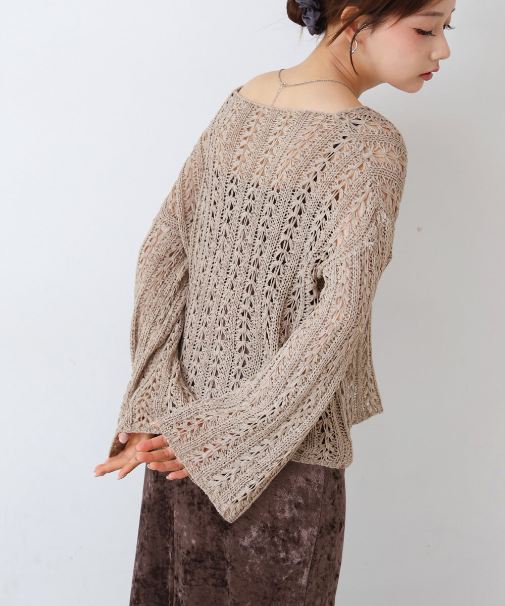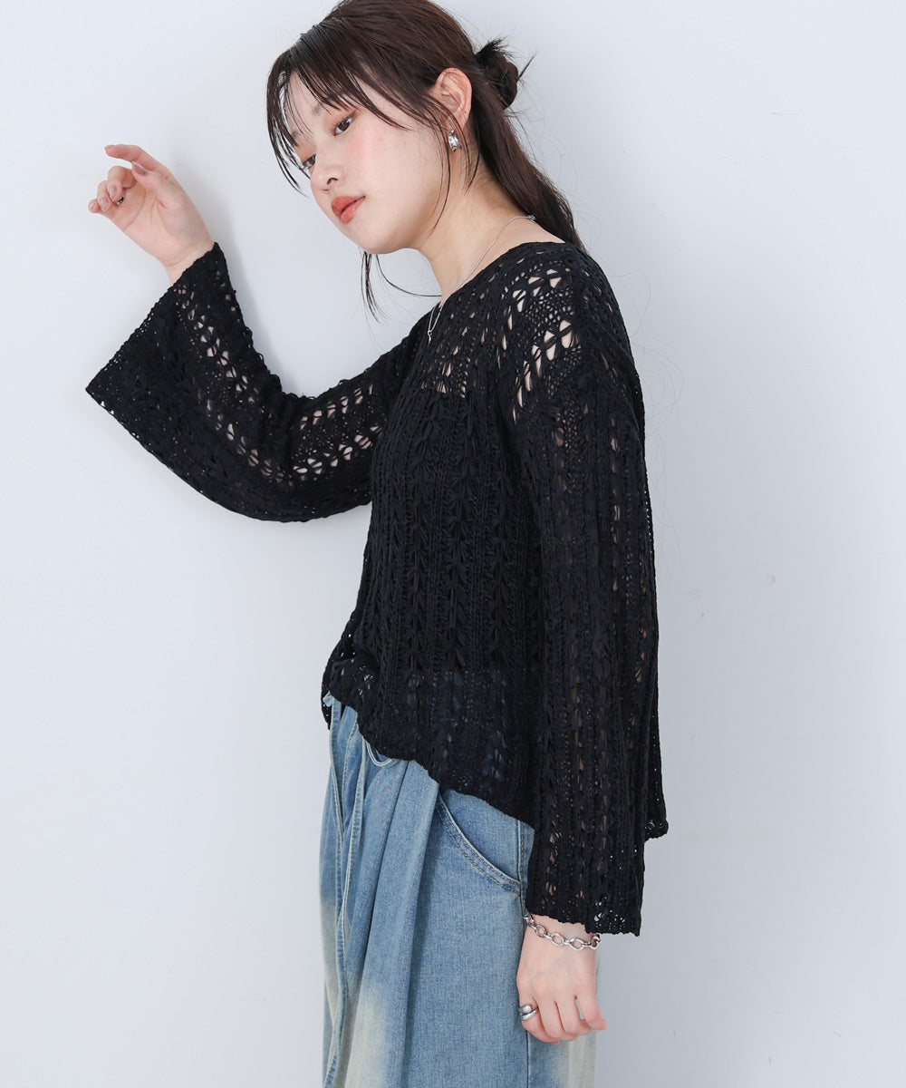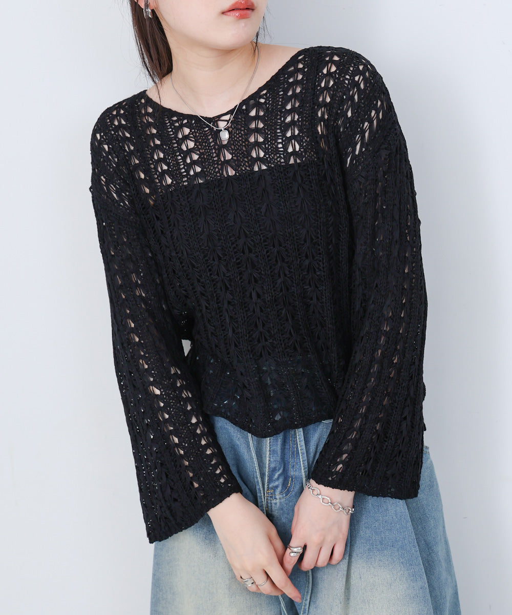 フラワー模様が可愛いレースニットトップスの登場です!網目が縦ラインに沿って入っているので華奢見えして見えるのもうれしいポイントです。フラワー模様のフェミニンさと網目の空き具合の抜け感が絶妙にマッチして、上品さもありながらどこかカジュアル感もそなえたトップスに仕上がっています。さらにストレッチ性があるので着やすくなっています。