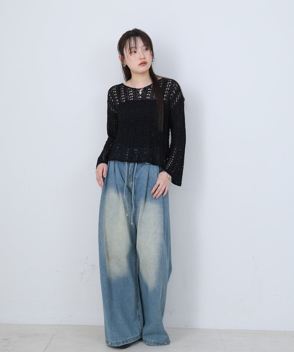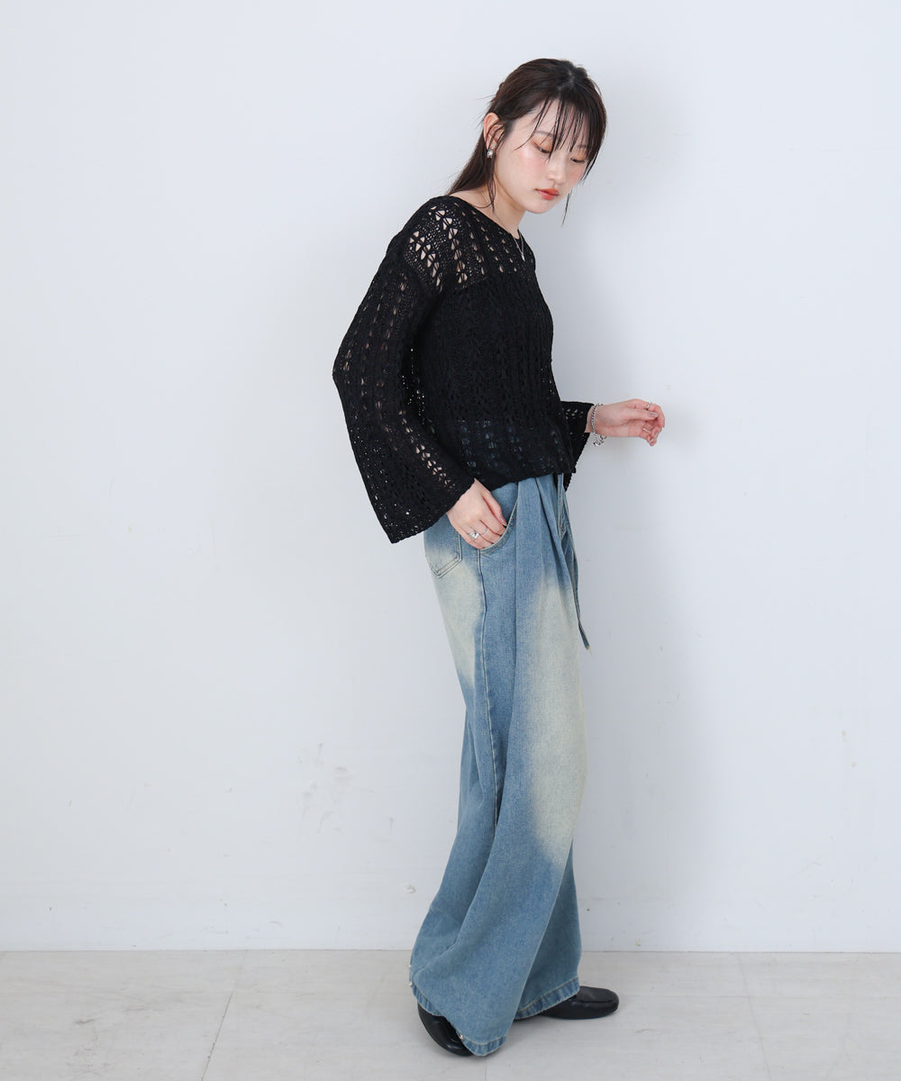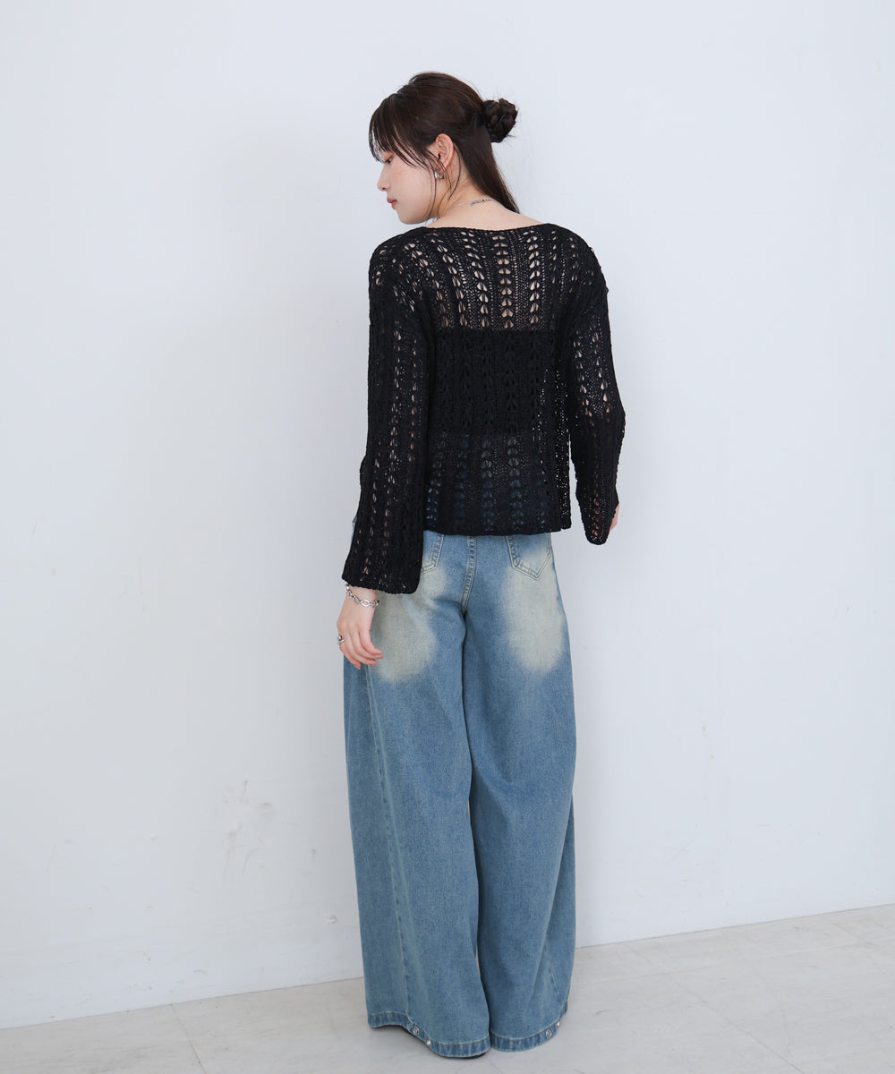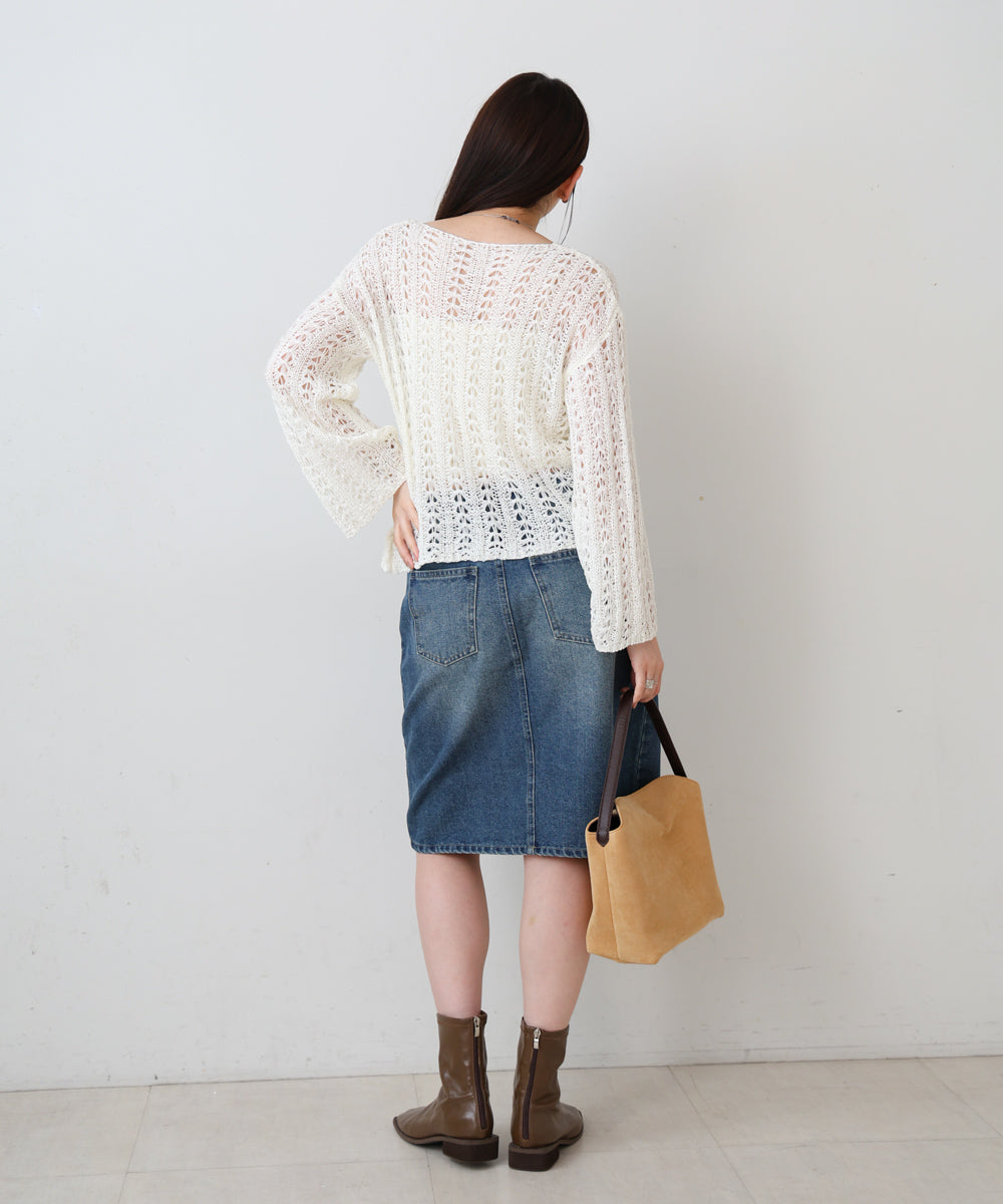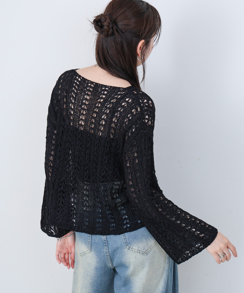 フラワー模様が可愛いレースニットトップスの登場です!網目が縦ラインに沿って入っているので華奢見えして見えるのもうれしいポイントです。フラワー模様のフェミニンさと網目の空き具合の抜け感が絶妙にマッチして、上品さもありながらどこかカジュアル感もそなえたトップスに仕上がっています。さらにストレッチ性があるので着やすくなっています。