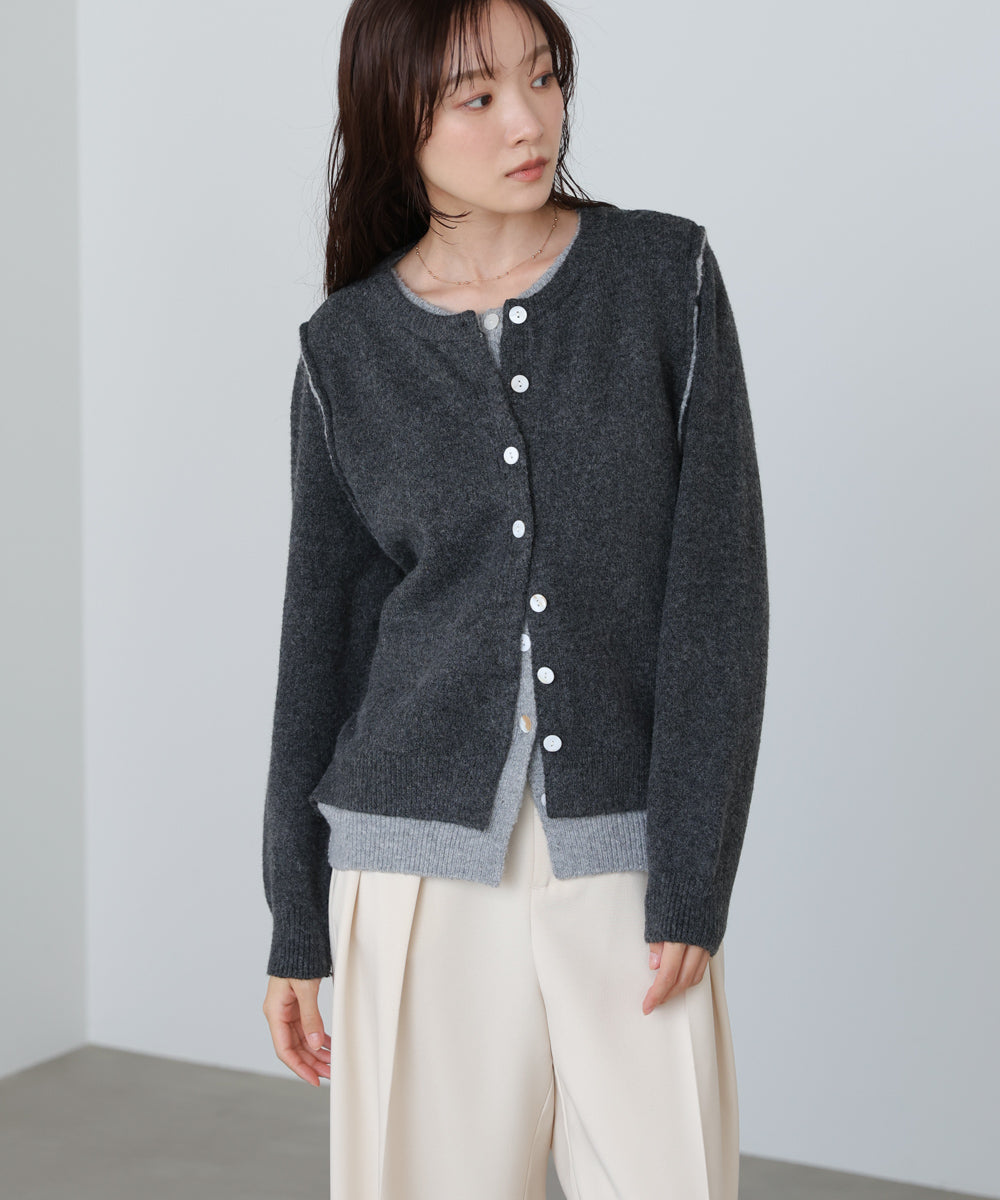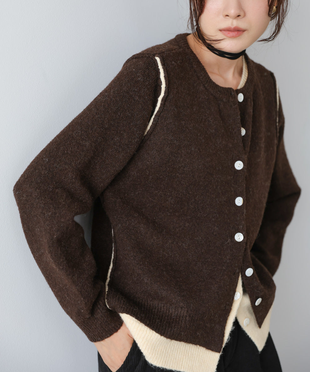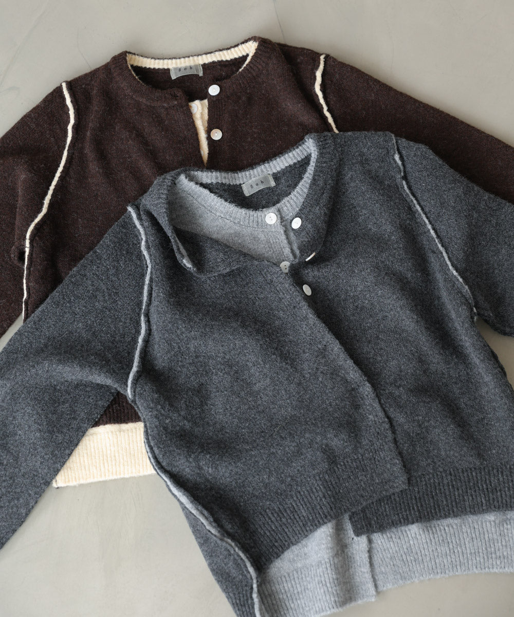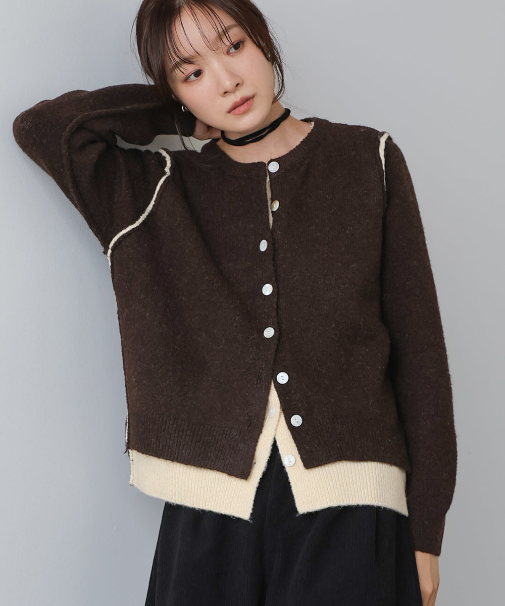 一見レイヤードしているように見える、デザイン性の高いニットカーディガン。ラインと裾の配色がアクセントになり、シンプルながらも洒落感のある印象に仕上げます。ブラウンはホワイトのコントラストがやさしく、グレーは淡いトーンの配色で上品な雰囲気。別々に見えるのに実は一枚で完成するデザインが魅力で、さっと着るだけで大人かわいいスタイルが叶います。