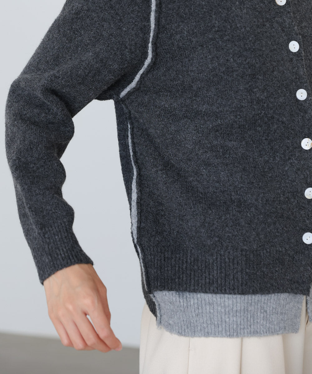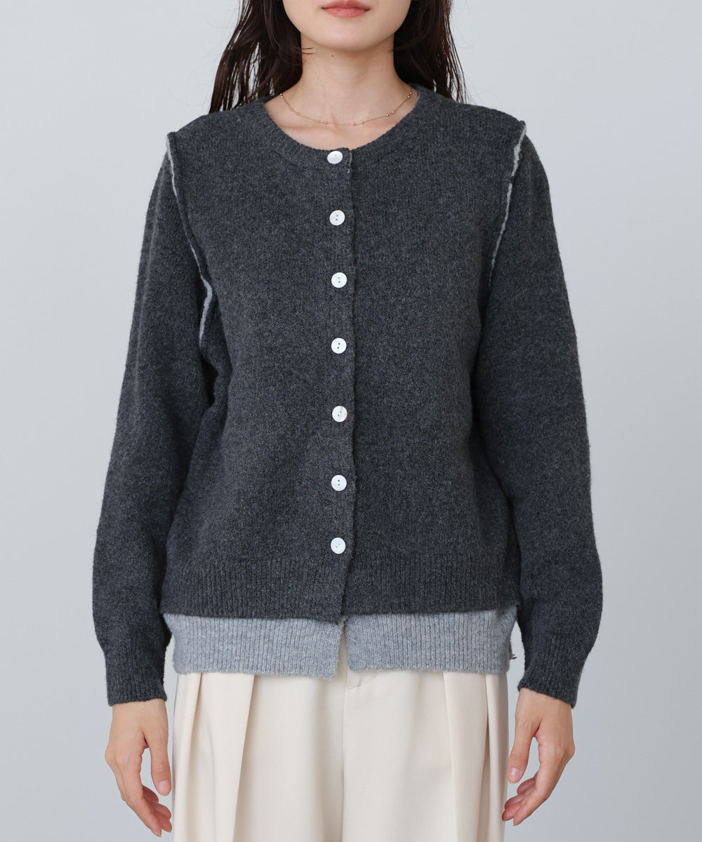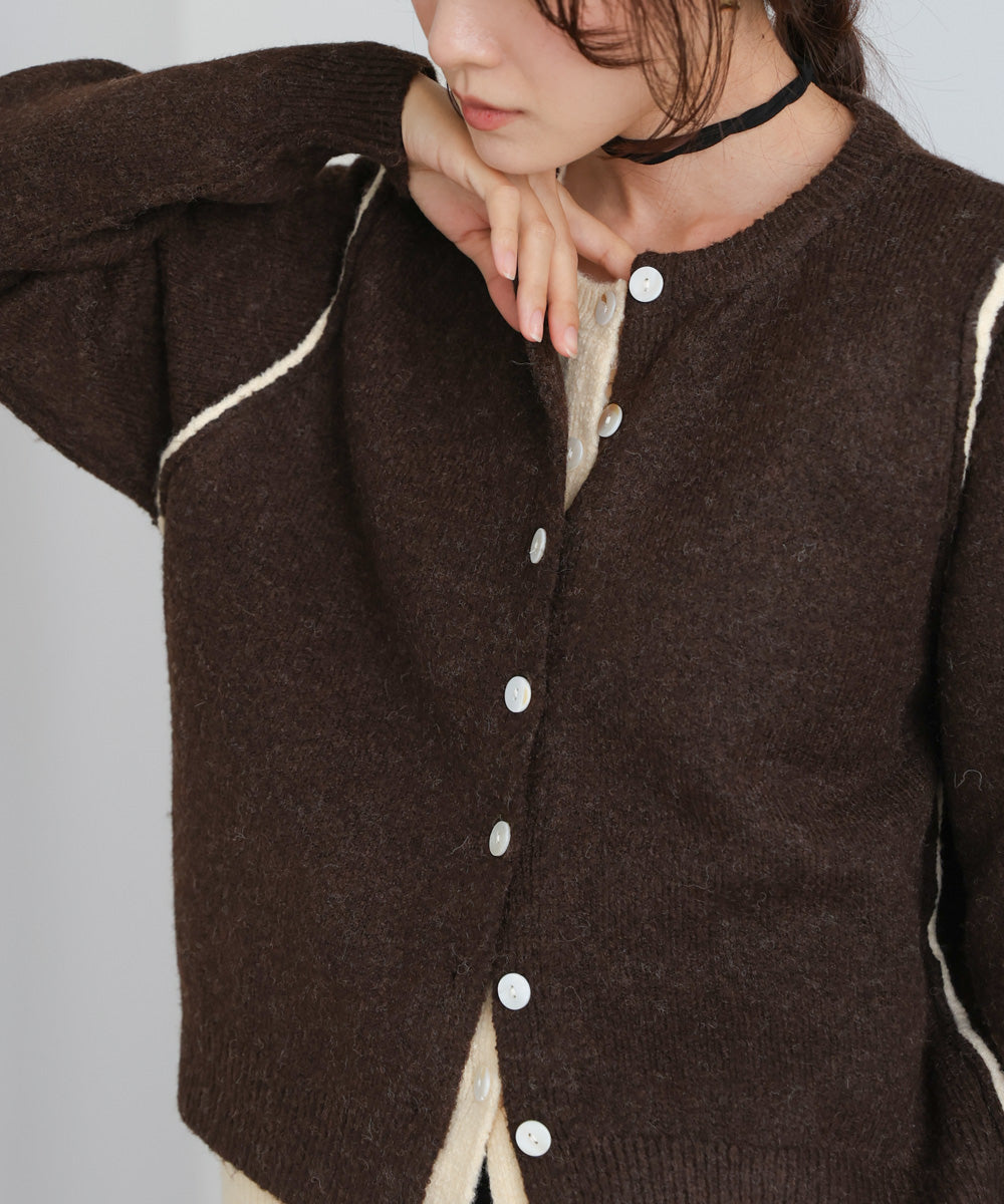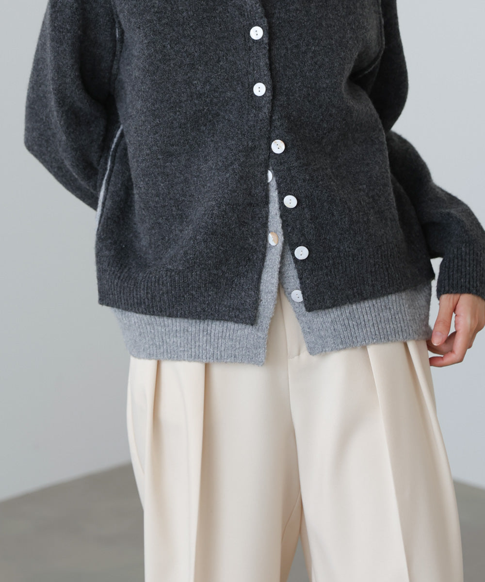 一見レイヤードしているように見える、デザイン性の高いニットカーディガン。ラインと裾の配色がアクセントになり、シンプルながらも洒落感のある印象に仕上げます。ブラウンはホワイトのコントラストがやさしく、グレーは淡いトーンの配色で上品な雰囲気。別々に見えるのに実は一枚で完成するデザインが魅力で、さっと着るだけで大人かわいいスタイルが叶います。