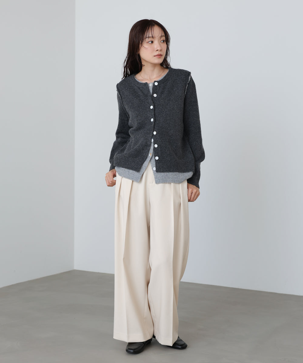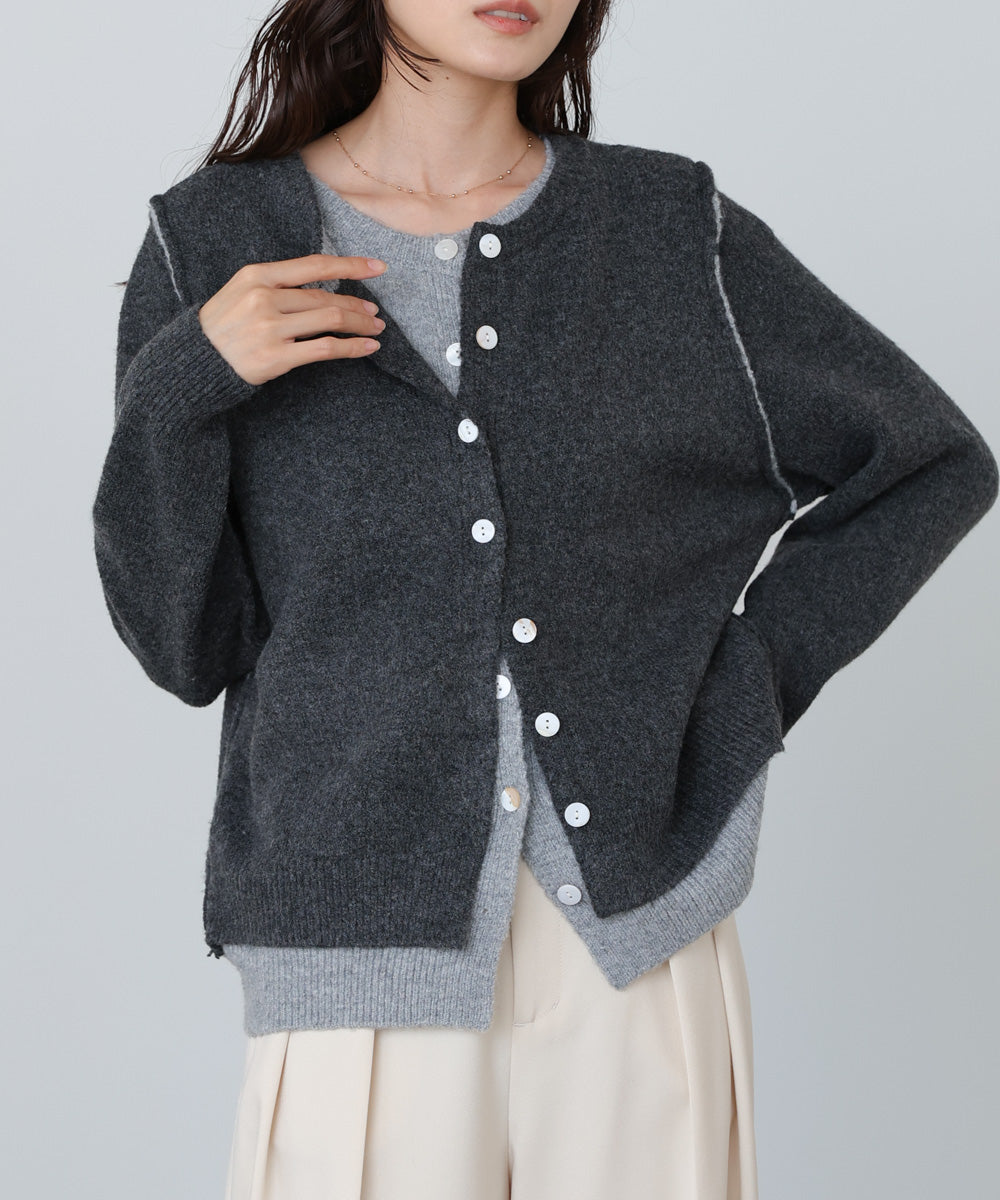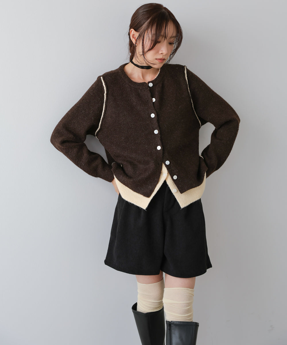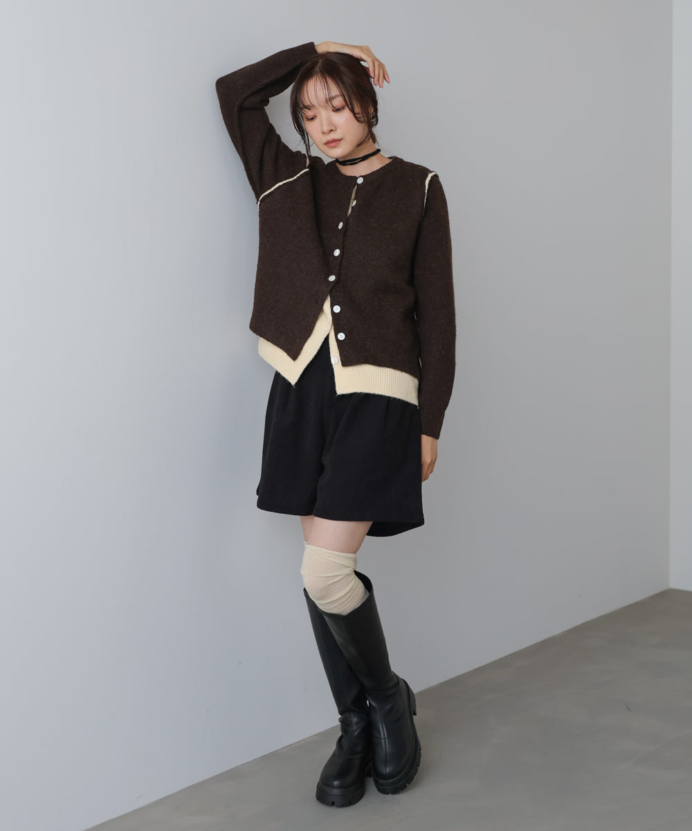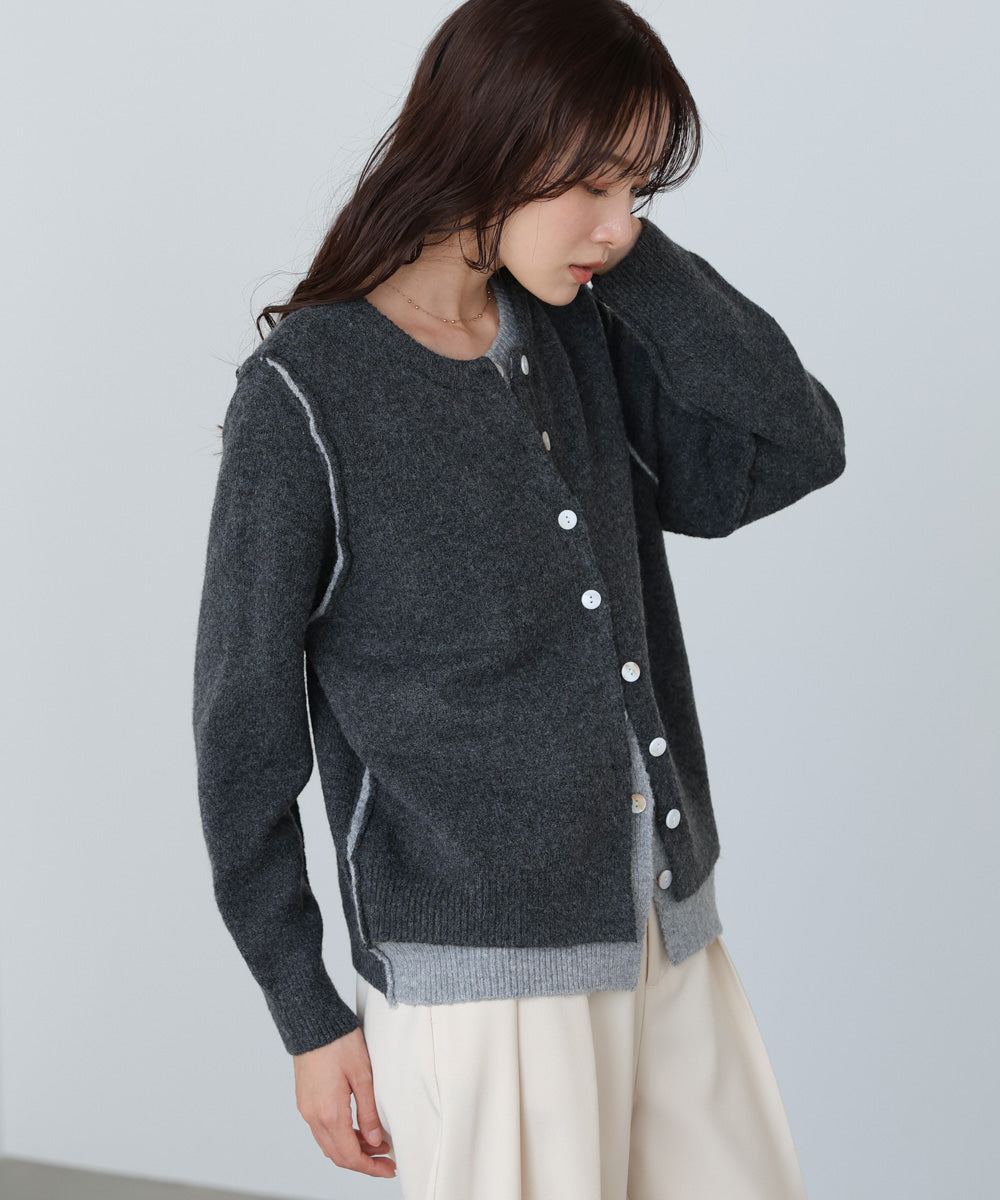 一見レイヤードしているように見える、デザイン性の高いニットカーディガン。ラインと裾の配色がアクセントになり、シンプルながらも洒落感のある印象に仕上げます。ブラウンはホワイトのコントラストがやさしく、グレーは淡いトーンの配色で上品な雰囲気。別々に見えるのに実は一枚で完成するデザインが魅力で、さっと着るだけで大人かわいいスタイルが叶います。