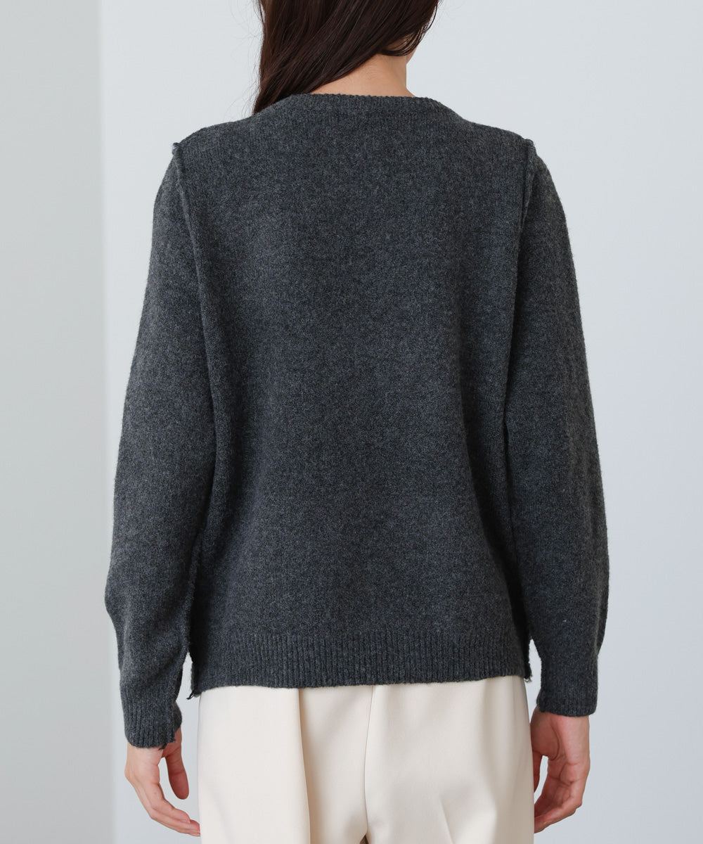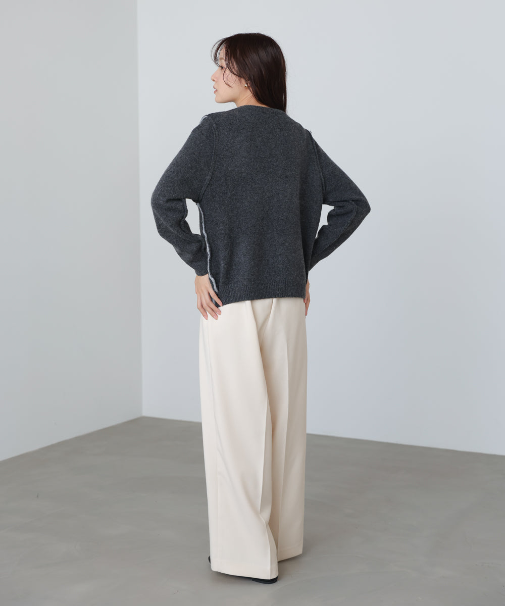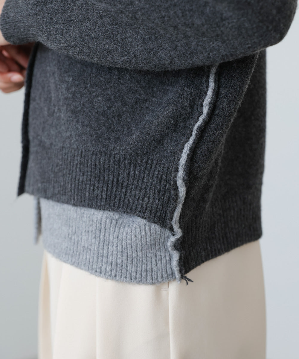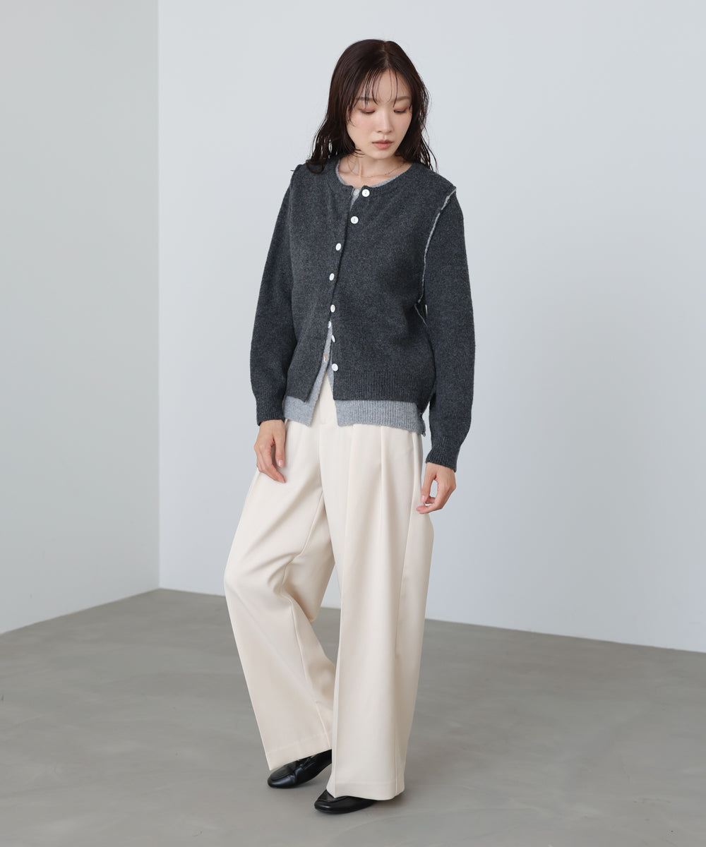 一見レイヤードしているように見える、デザイン性の高いニットカーディガン。ラインと裾の配色がアクセントになり、シンプルながらも洒落感のある印象に仕上げます。ブラウンはホワイトのコントラストがやさしく、グレーは淡いトーンの配色で上品な雰囲気。別々に見えるのに実は一枚で完成するデザインが魅力で、さっと着るだけで大人かわいいスタイルが叶います。