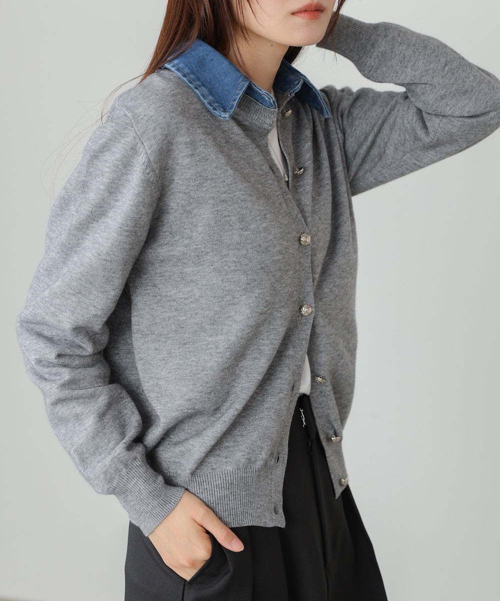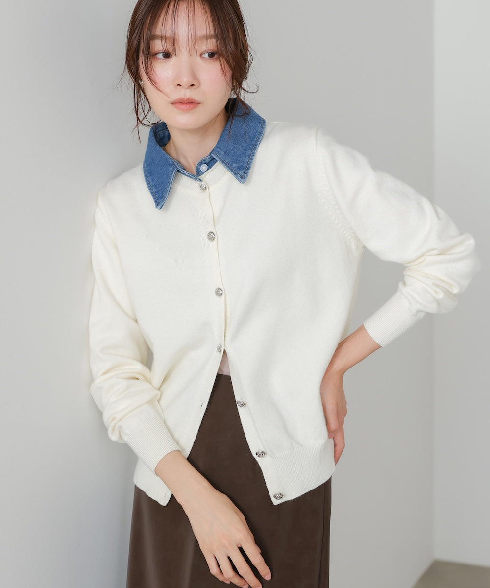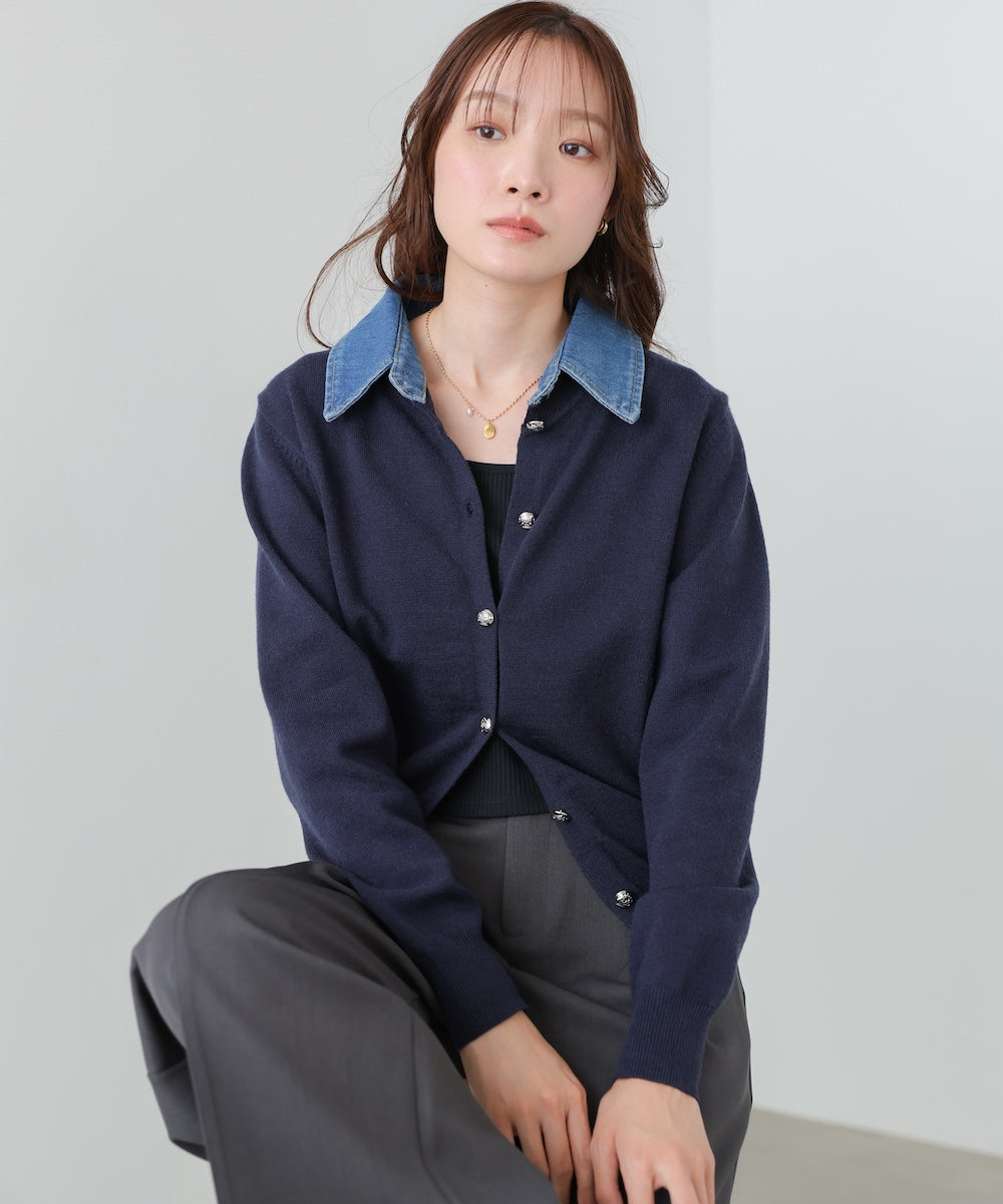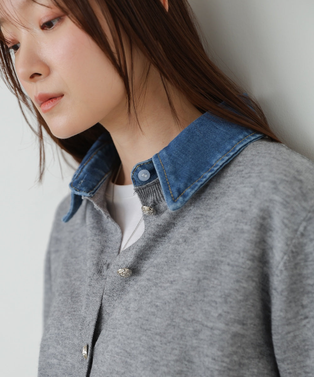デニム衿をポイントにした、旬のムード漂うドッキングデザインのニットカーディガン。衿のカジュアルさと、シルバーボタンの上品さが絶妙に調和し、1枚できれいめカジュアルが完成します。もちもちとした柔らかなニットが、着心地のよさと女性らしい雰囲気を両立。シンプルなシルエットながら、衿の存在感がスタイリングをぐっとこなれた印象に見せてくれる主役級アイテムです。アイボリー・グレー・ネイビーの3色展開で、どれもコーデに取り入れやすい落ち着いたカラーになっています。