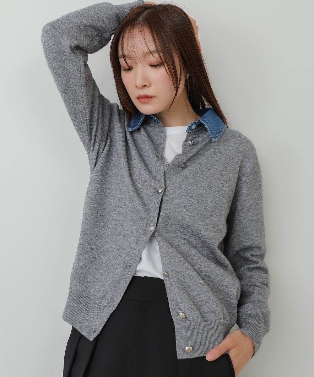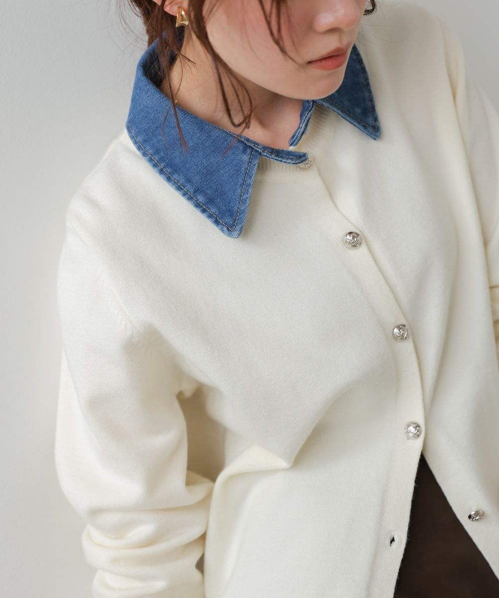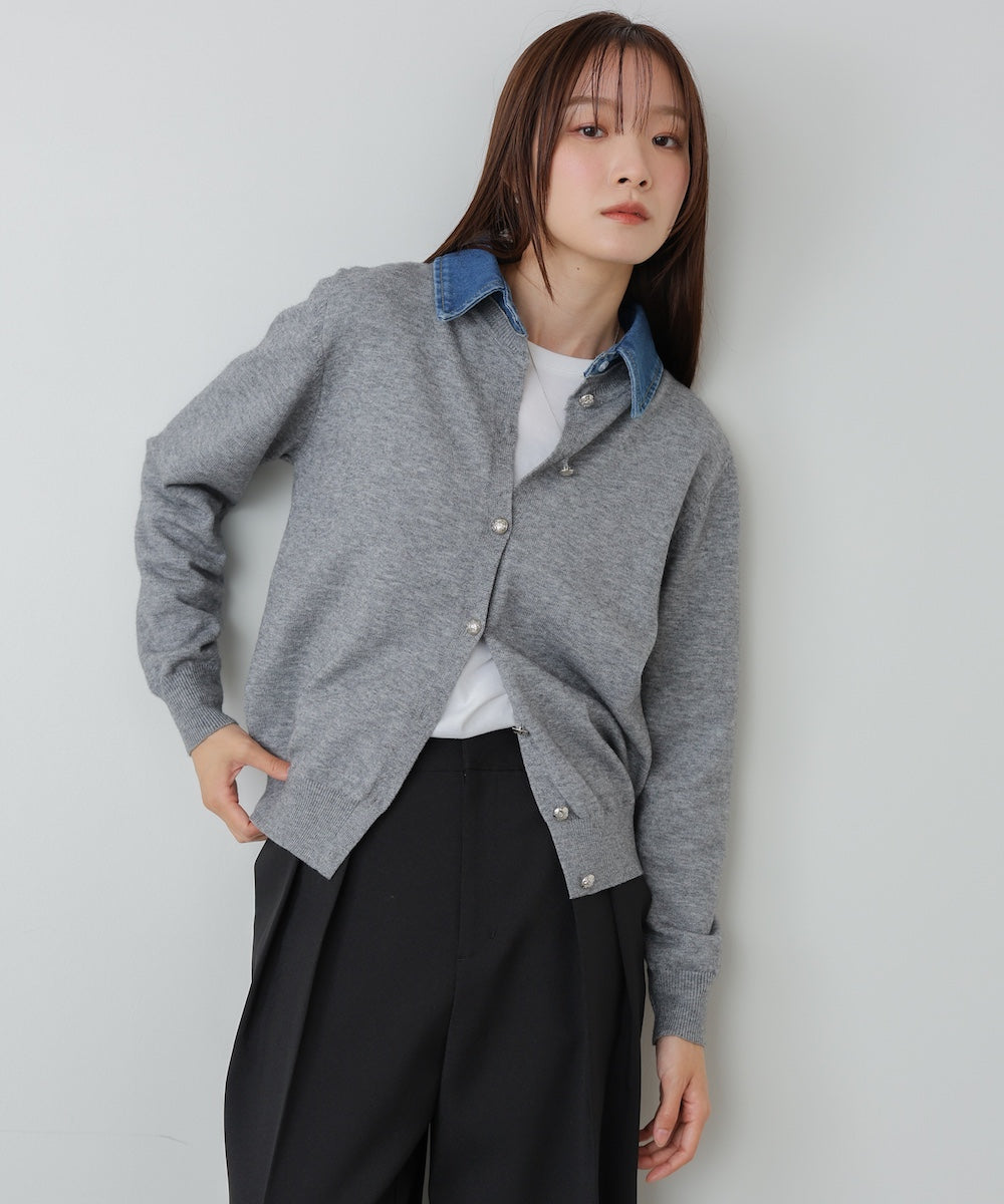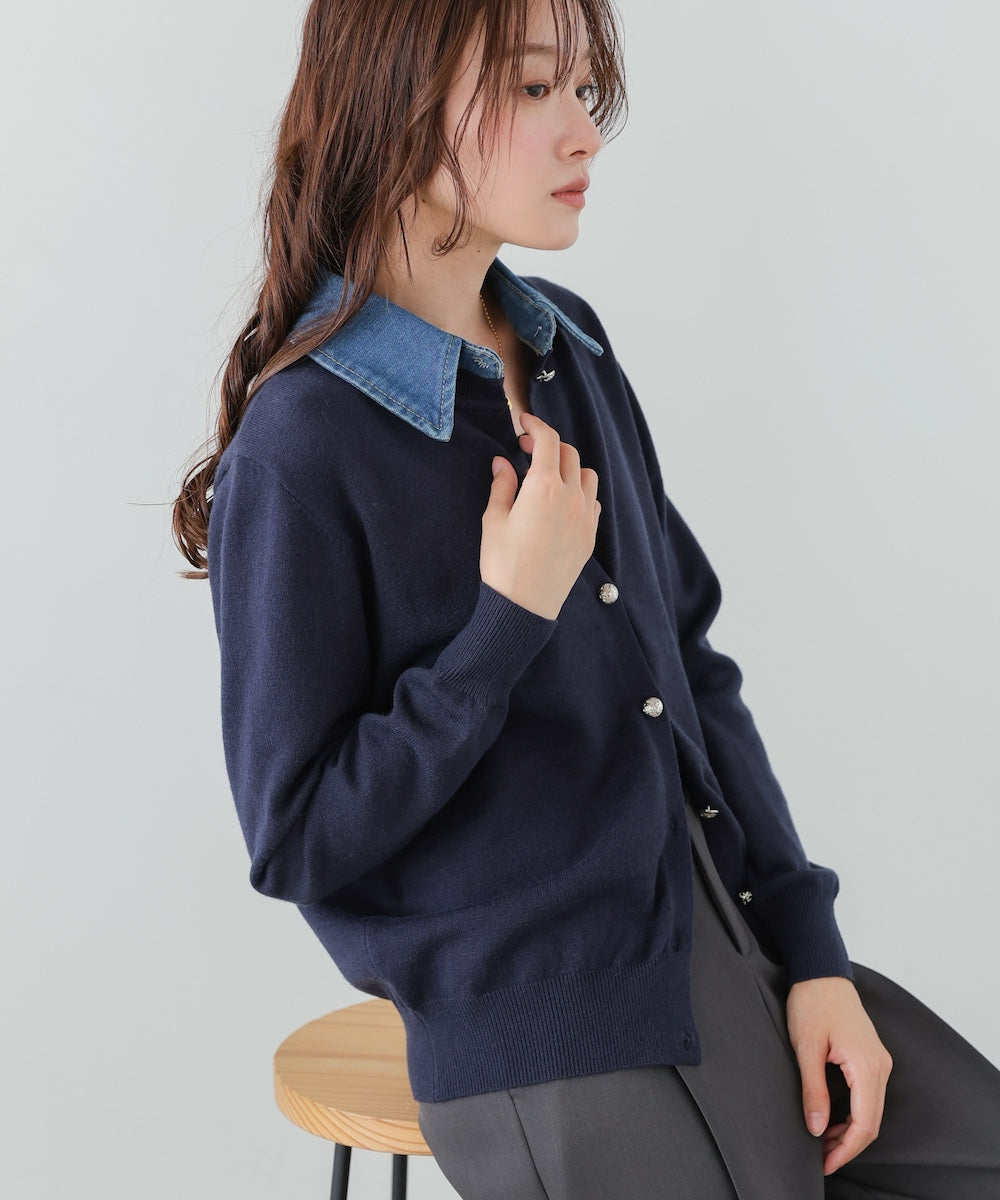 デニム衿をポイントにした、旬のムード漂うドッキングデザインのニットカーディガン。衿のカジュアルさと、シルバーボタンの上品さが絶妙に調和し、1枚できれいめカジュアルが完成します。もちもちとした柔らかなニットが、着心地のよさと女性らしい雰囲気を両立。シンプルなシルエットながら、衿の存在感がスタイリングをぐっとこなれた印象に見せてくれる主役級アイテムです。アイボリー・グレー・ネイビーの3色展開で、どれもコーデに取り入れやすい落ち着いたカラーになっています。