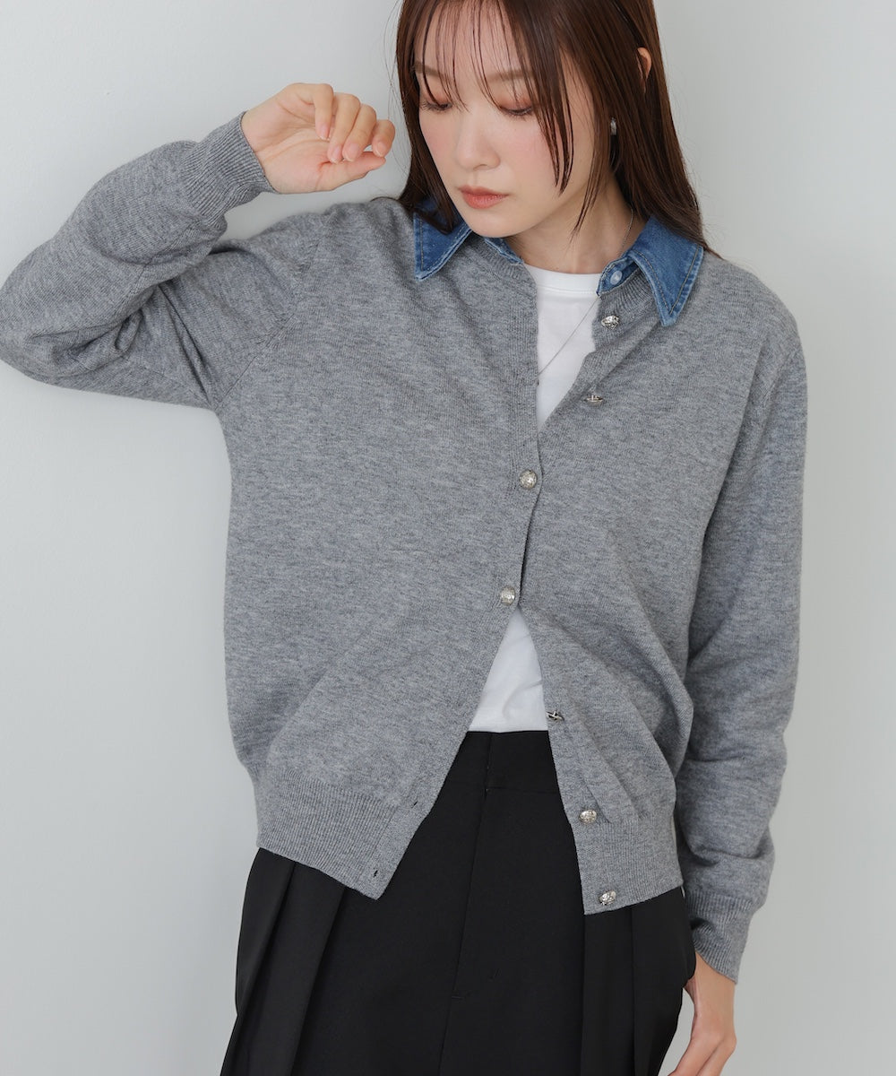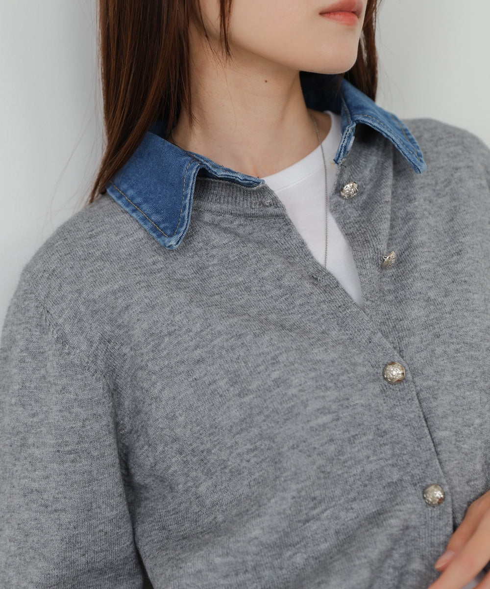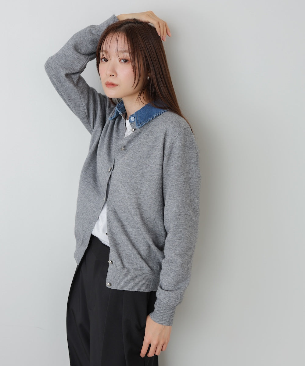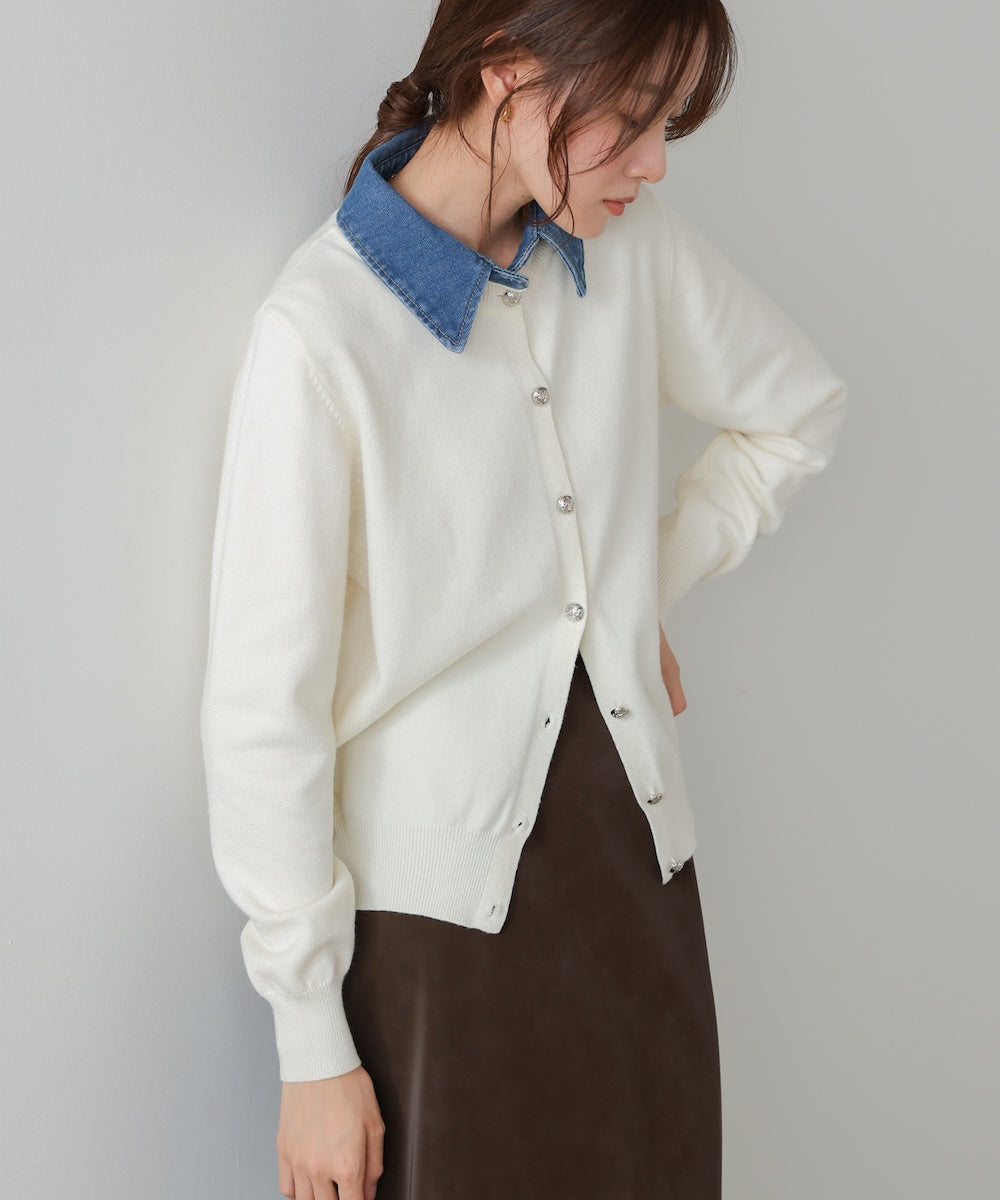デニム衿をポイントにした、旬のムード漂うドッキングデザインのニットカーディガン。衿のカジュアルさと、シルバーボタンの上品さが絶妙に調和し、1枚できれいめカジュアルが完成します。もちもちとした柔らかなニットが、着心地のよさと女性らしい雰囲気を両立。シンプルなシルエットながら、衿の存在感がスタイリングをぐっとこなれた印象に見せてくれる主役級アイテムです。アイボリー・グレー・ネイビーの3色展開で、どれもコーデに取り入れやすい落ち着いたカラーになっています。