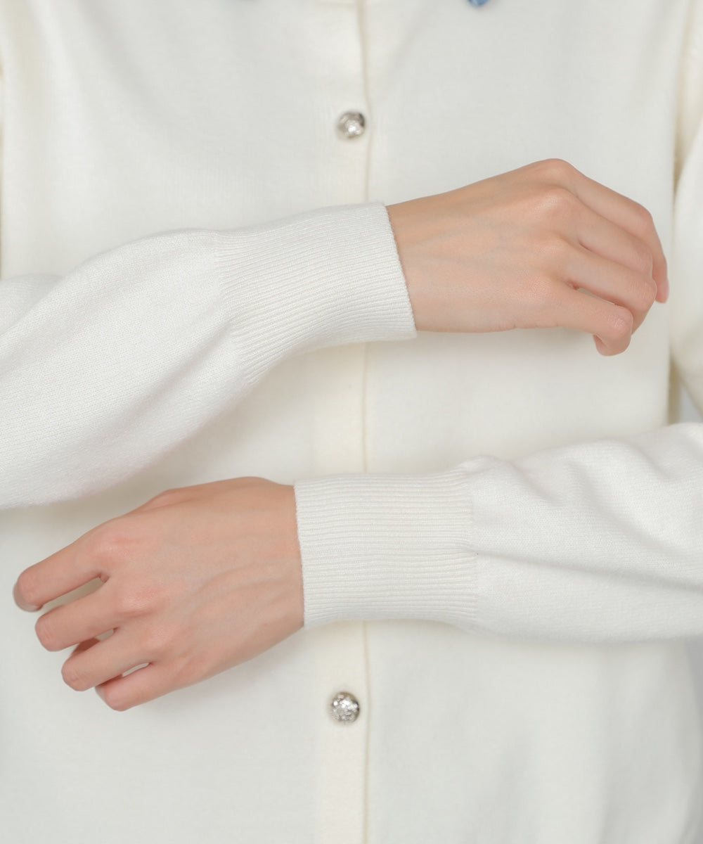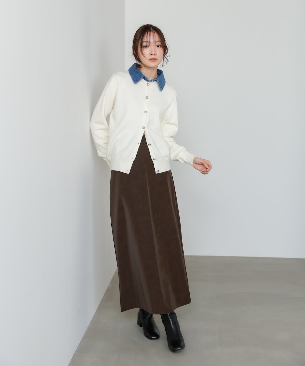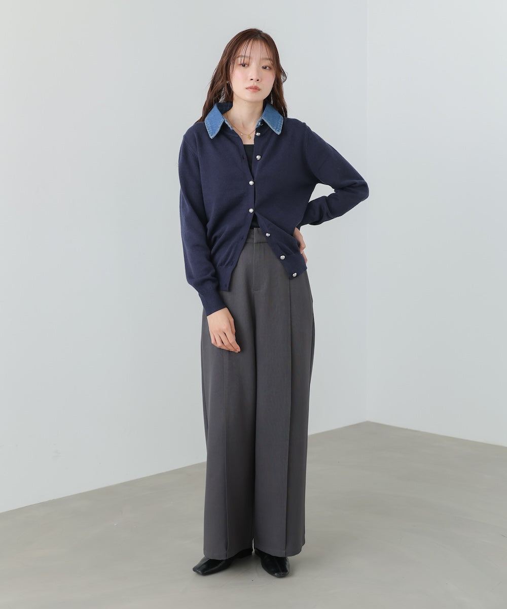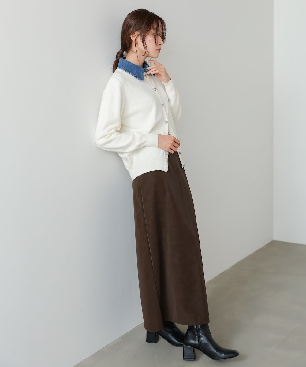 デニム衿をポイントにした、旬のムード漂うドッキングデザインのニットカーディガン。衿のカジュアルさと、シルバーボタンの上品さが絶妙に調和し、1枚できれいめカジュアルが完成します。もちもちとした柔らかなニットが、着心地のよさと女性らしい雰囲気を両立。シンプルなシルエットながら、衿の存在感がスタイリングをぐっとこなれた印象に見せてくれる主役級アイテムです。アイボリー・グレー・ネイビーの3色展開で、どれもコーデに取り入れやすい落ち着いたカラーになっています。
