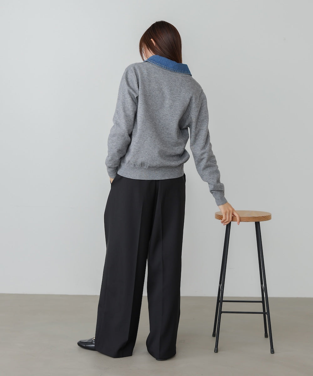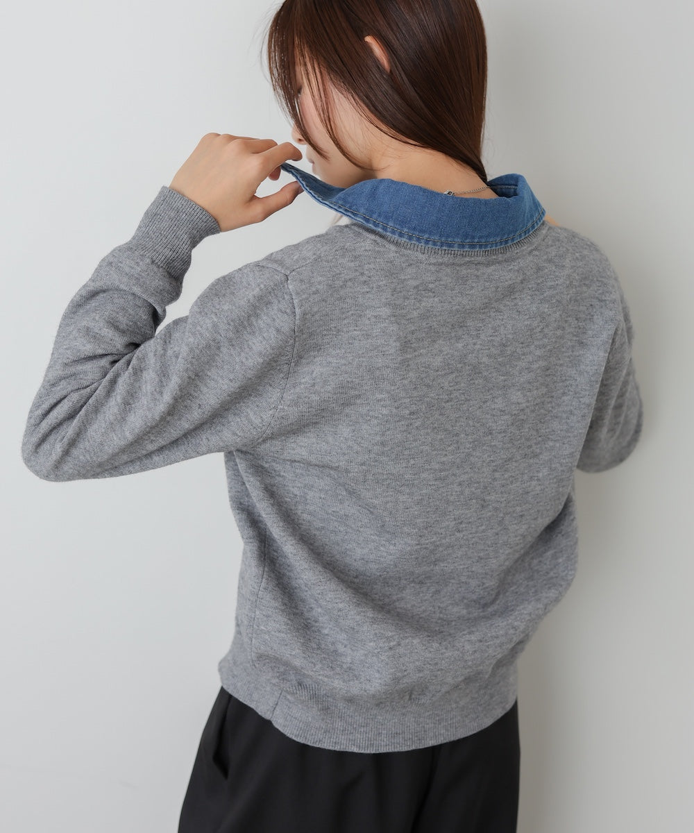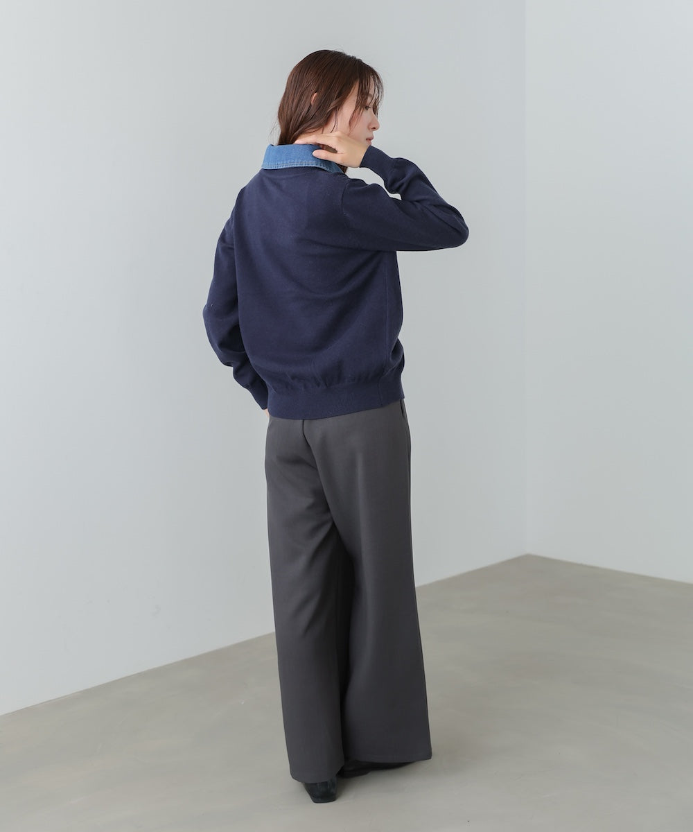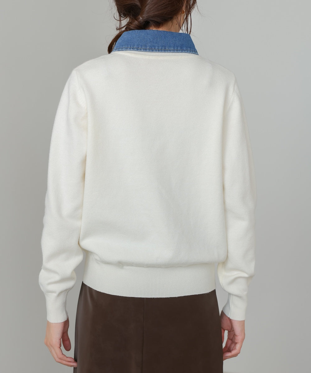 ニット部分は、ポリエステル・アクリル・レーヨン・ナイロンをバランスよくブレンドし、もっちりとした弾力とやわらかな肌あたりが魅力。別地の衿は綿97%にポリウレタンを加え、ほどよいハリと柔軟性を持たせたデニム生地です。異素材の組み合わせでも軽く仕上がっており、長時間の着用でもストレスなく過ごせます。