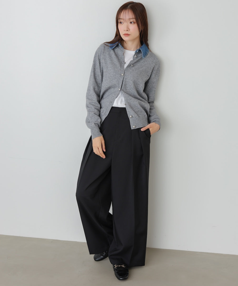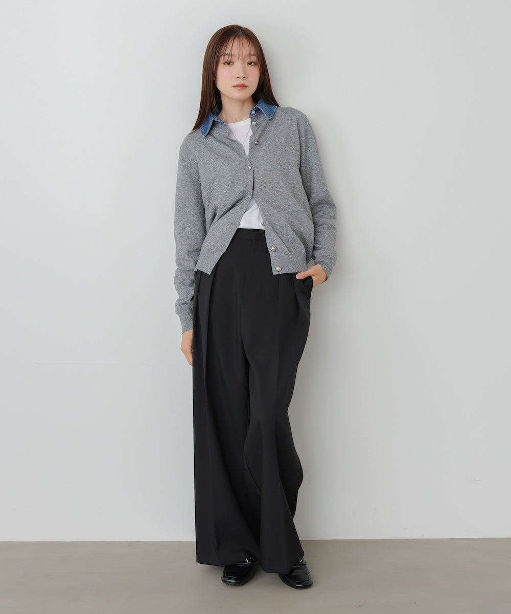 スラックスやタイトスカートと合わせれば、オフィスでも浮かないきれいめカジュアルが完成します。デニム衿が効いているので、無地のパンツやプリーツスカートと合わせるだけでこなれ感UPです。アイボリーはやわらかい女性らしい印象に、グレーは落ち着きのあるニュアンスカラーとして、ネイビーはより上品シックにまとまります。ボタンを閉じてプルオーバー風に着ても、開けてTシャツを覗かせてもサマになる万能デザインになっています。