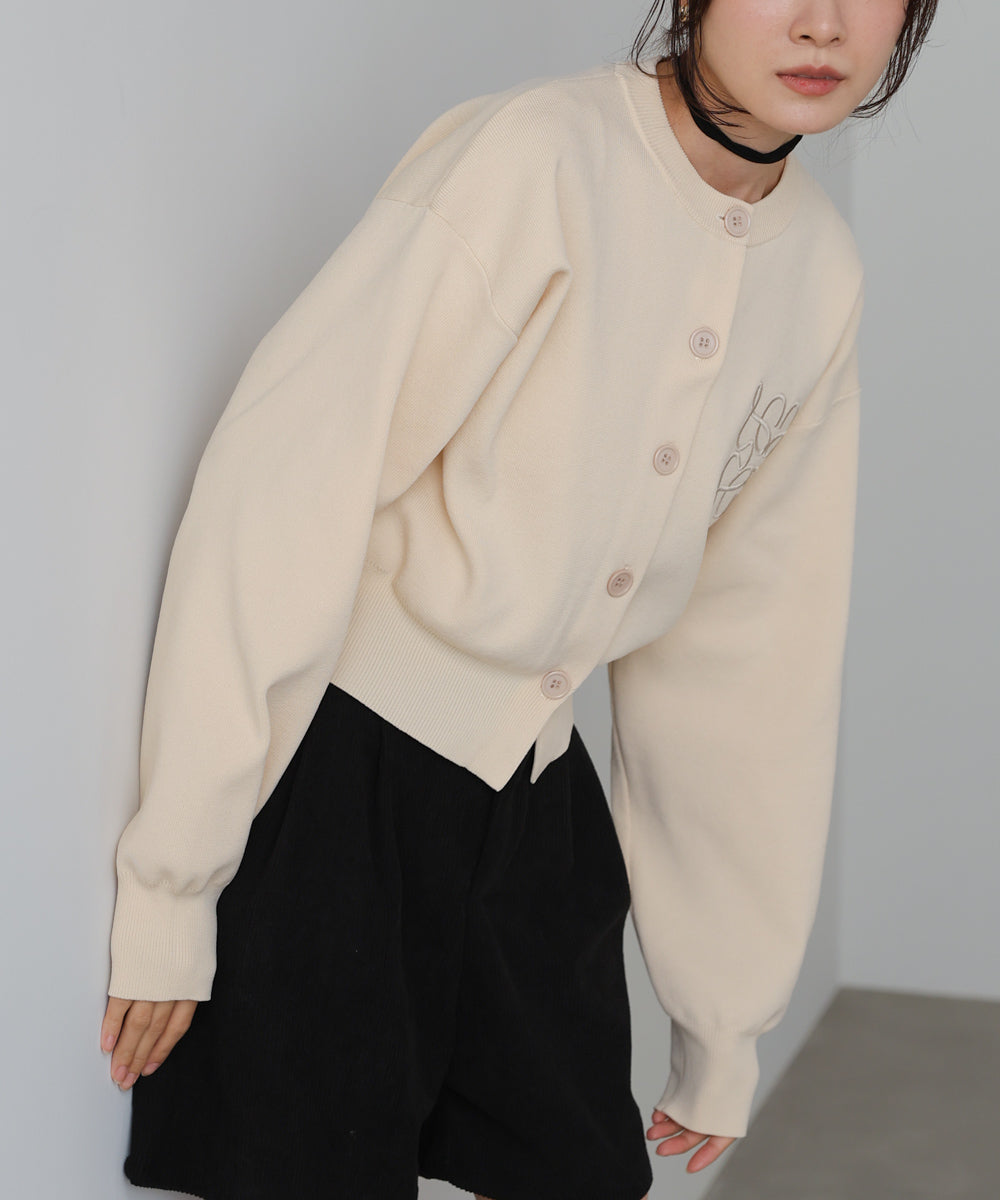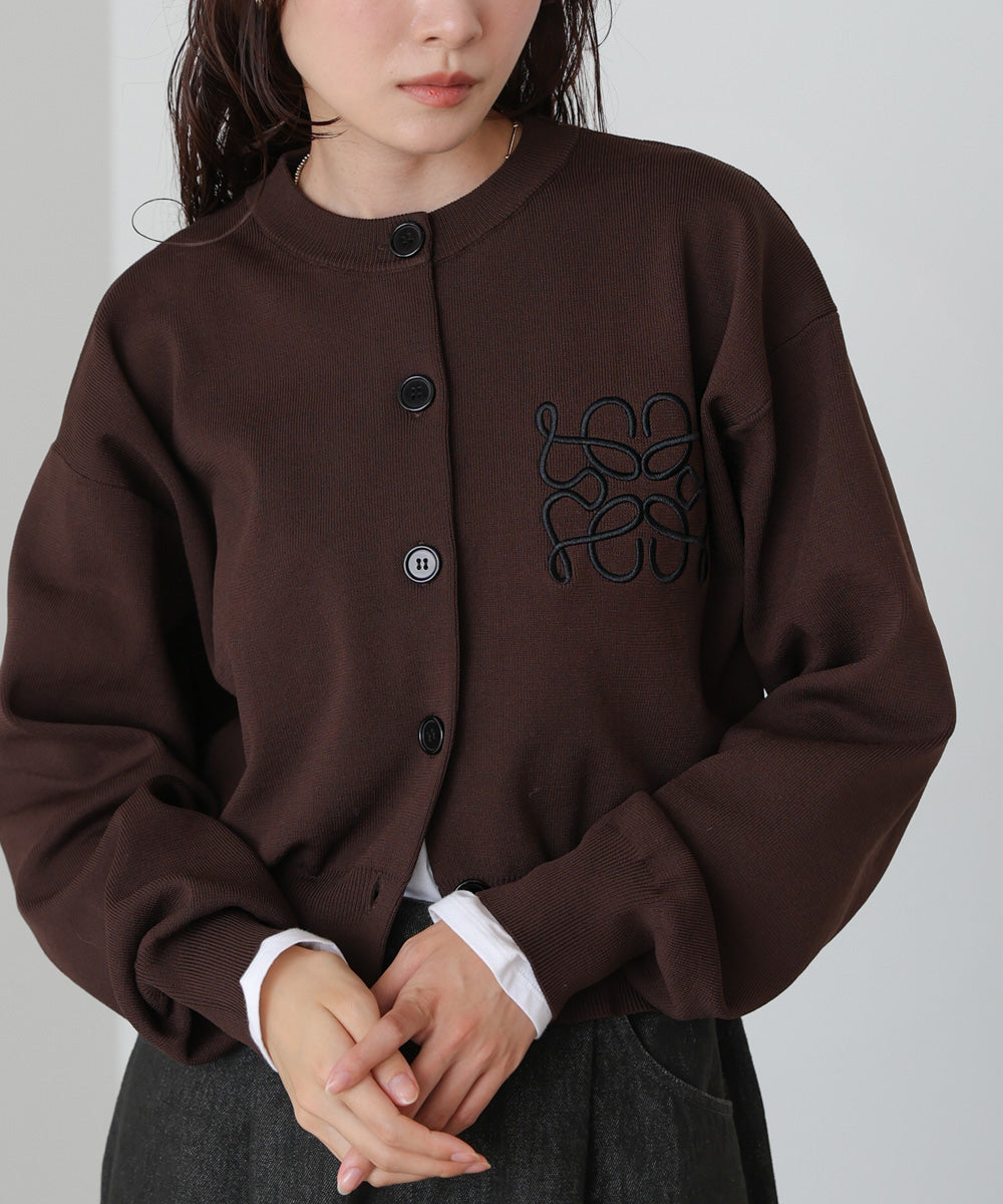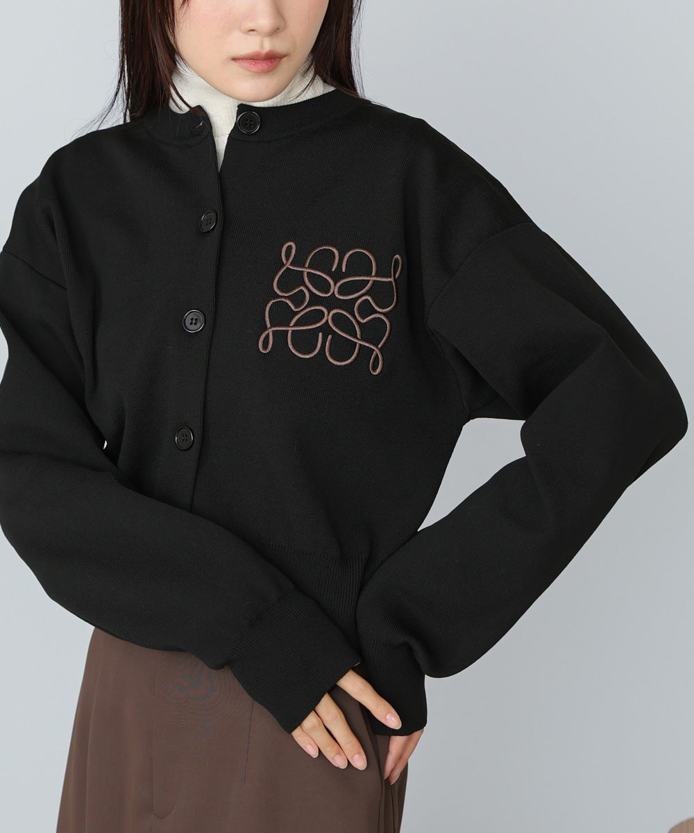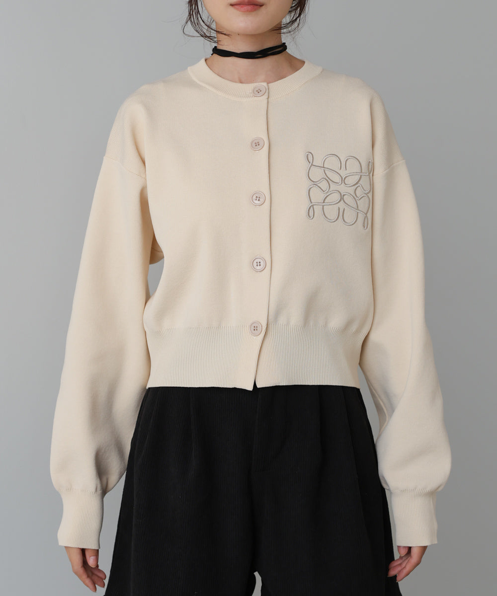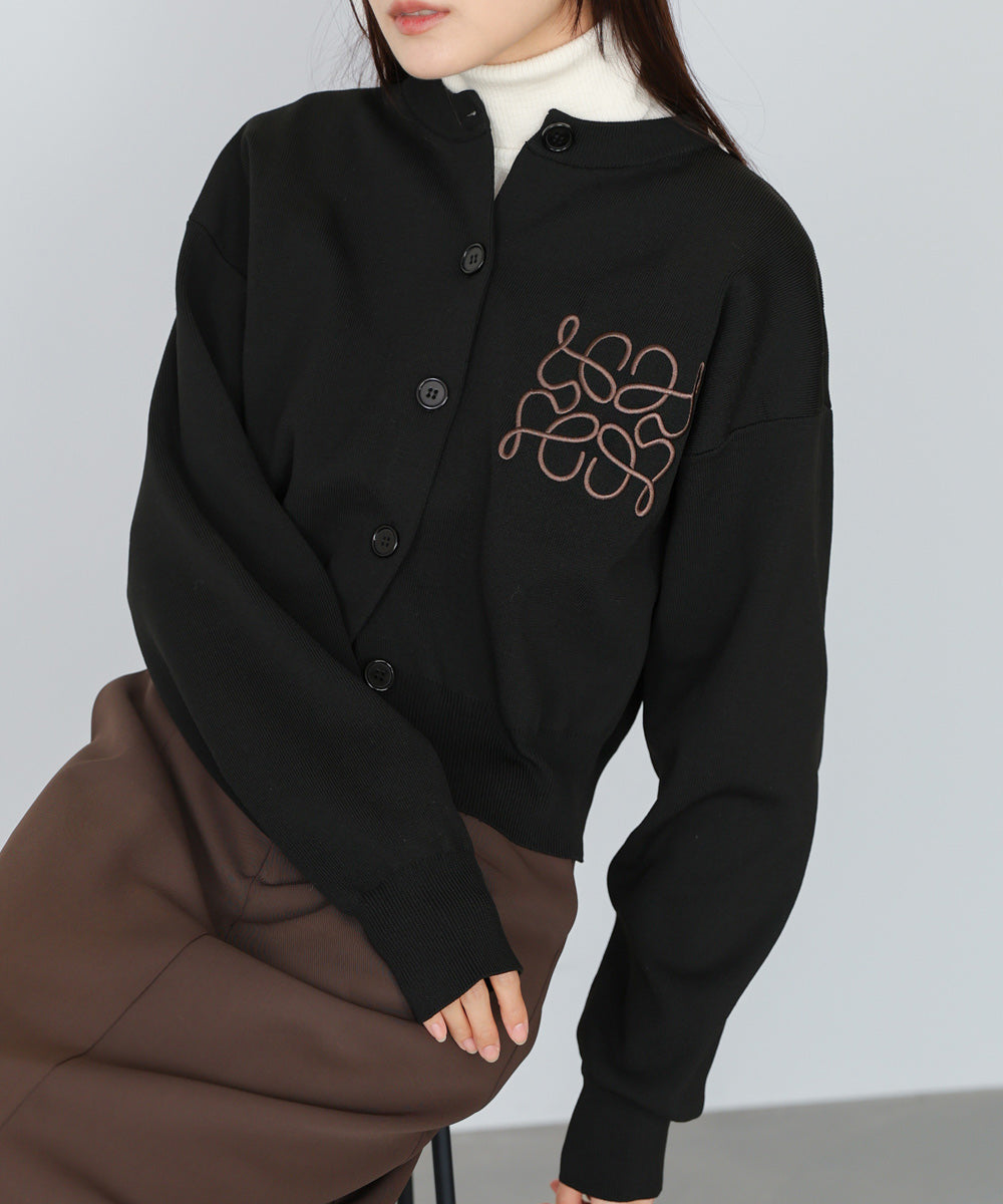 左胸のコード刺繍がさりげないアクセントになったニットカーディガン。ベーシックなシルエットにワンポイントを効かせることで、シンプルながらも大人っぽい存在感を放ちます。ボタンは首元までしっかり閉められるデザインなので、羽織りとしても、トップス感覚でも楽しめる一枚です。
