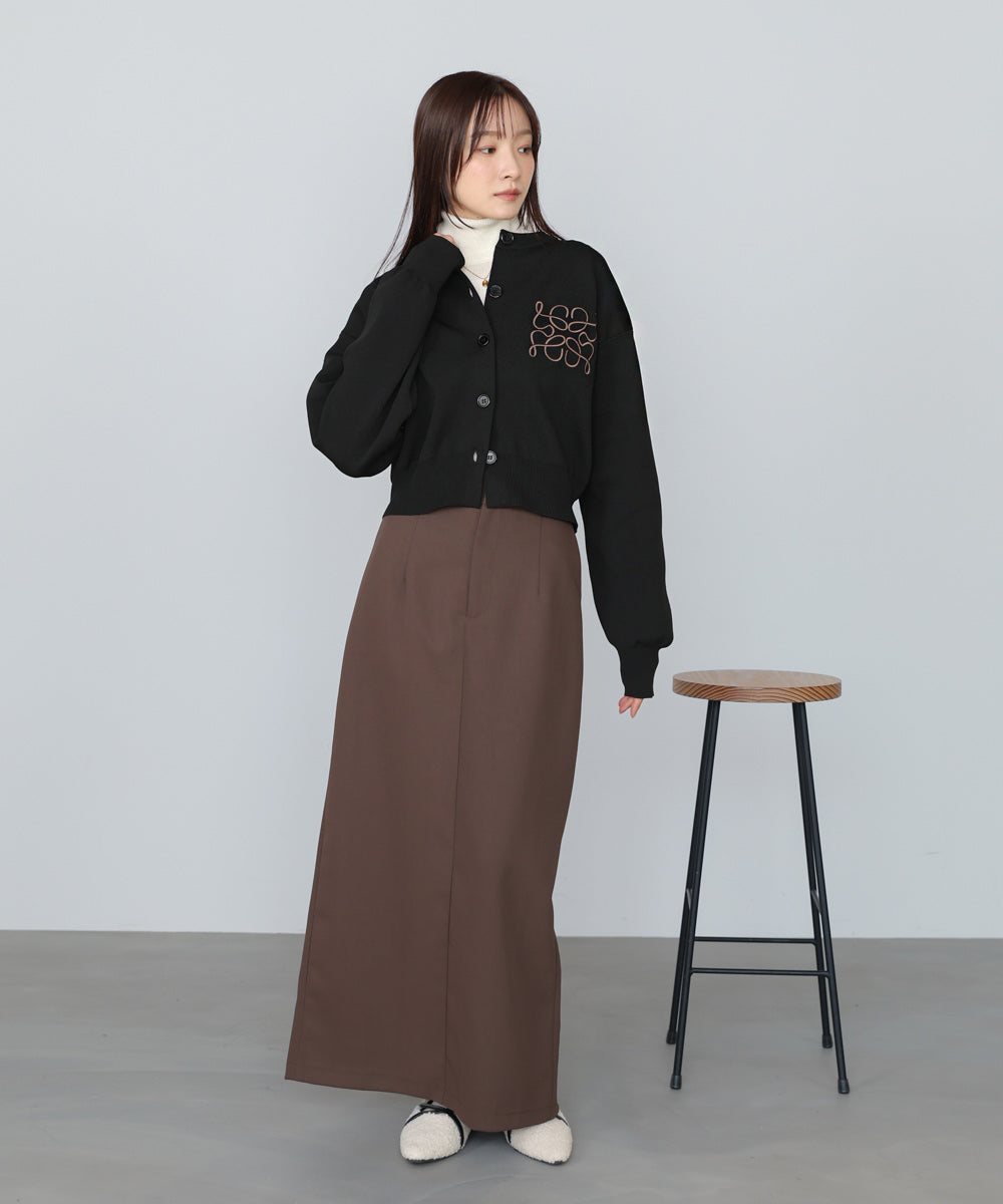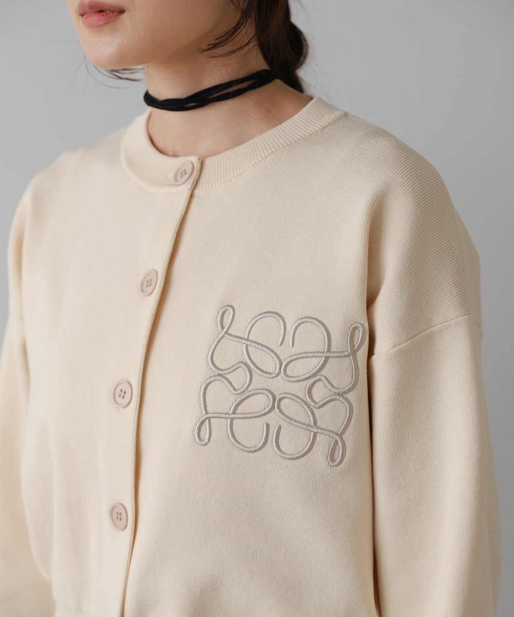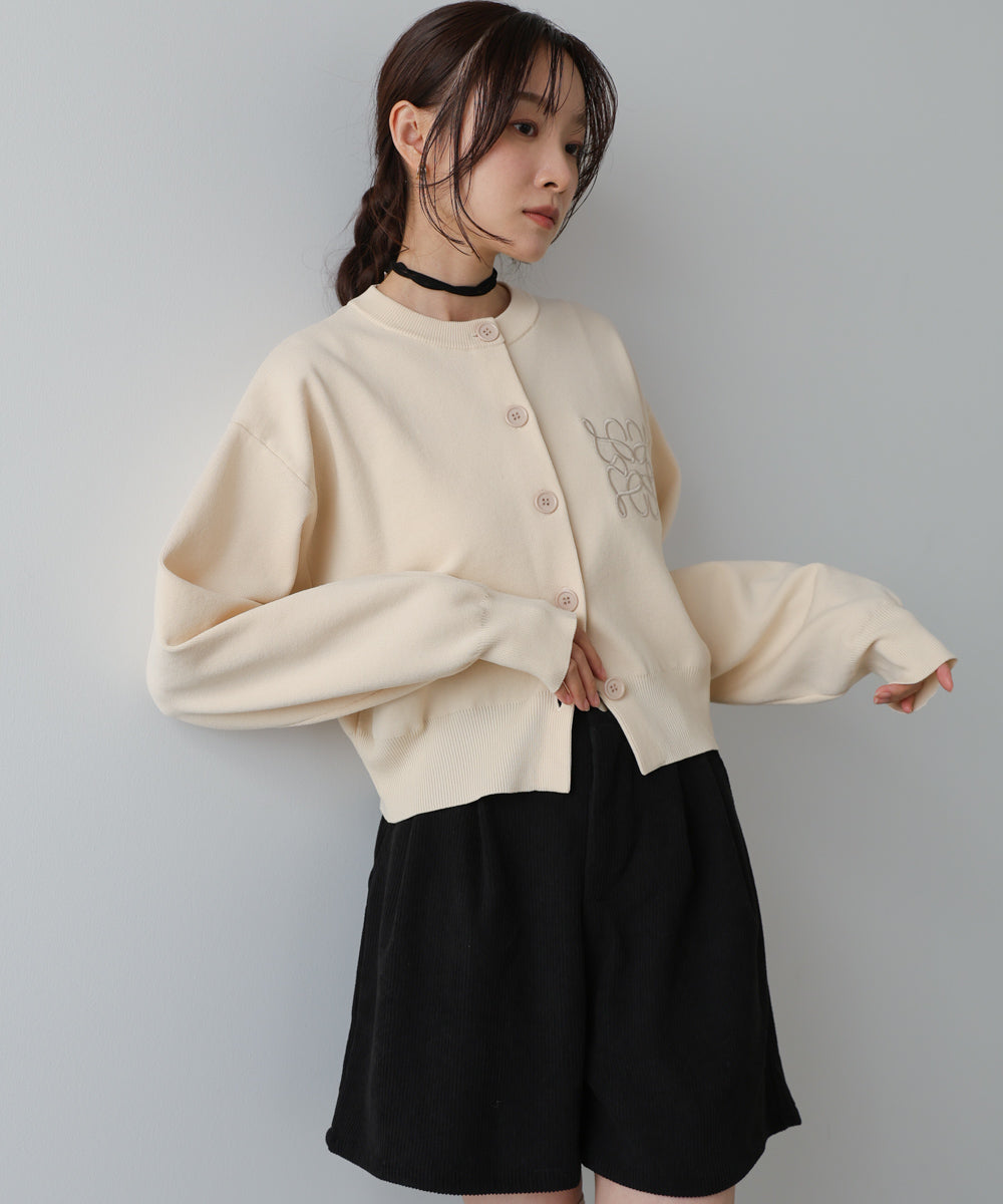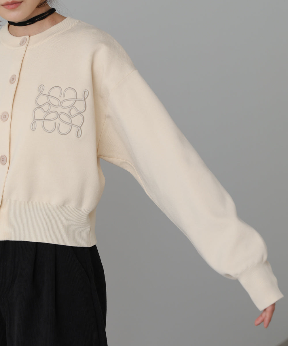 左胸のコード刺繍がさりげないアクセントになったニットカーディガン。ベーシックなシルエットにワンポイントを効かせることで、シンプルながらも大人っぽい存在感を放ちます。ボタンは首元までしっかり閉められるデザインなので、羽織りとしても、トップス感覚でも楽しめる一枚です。