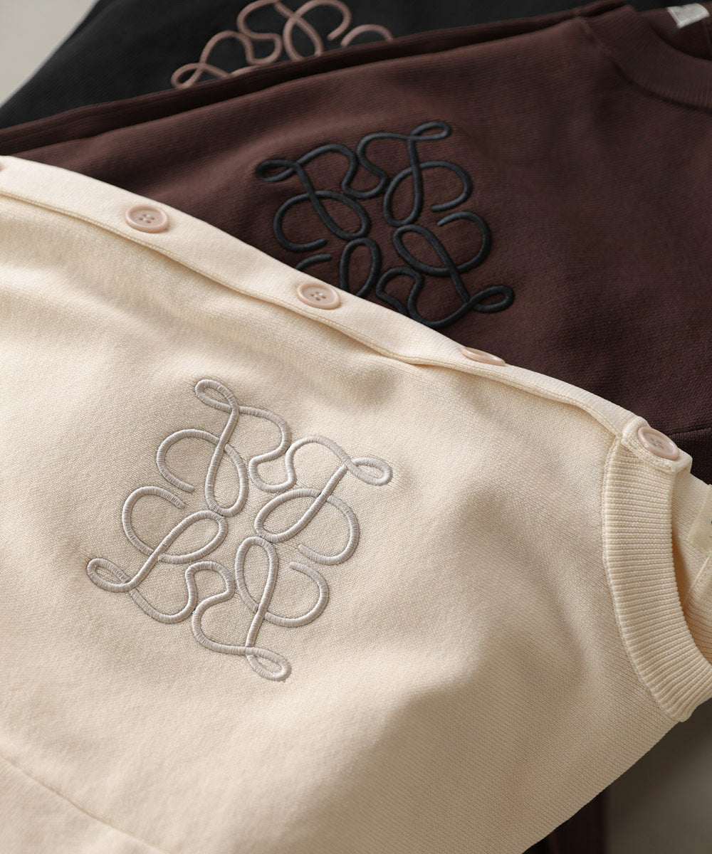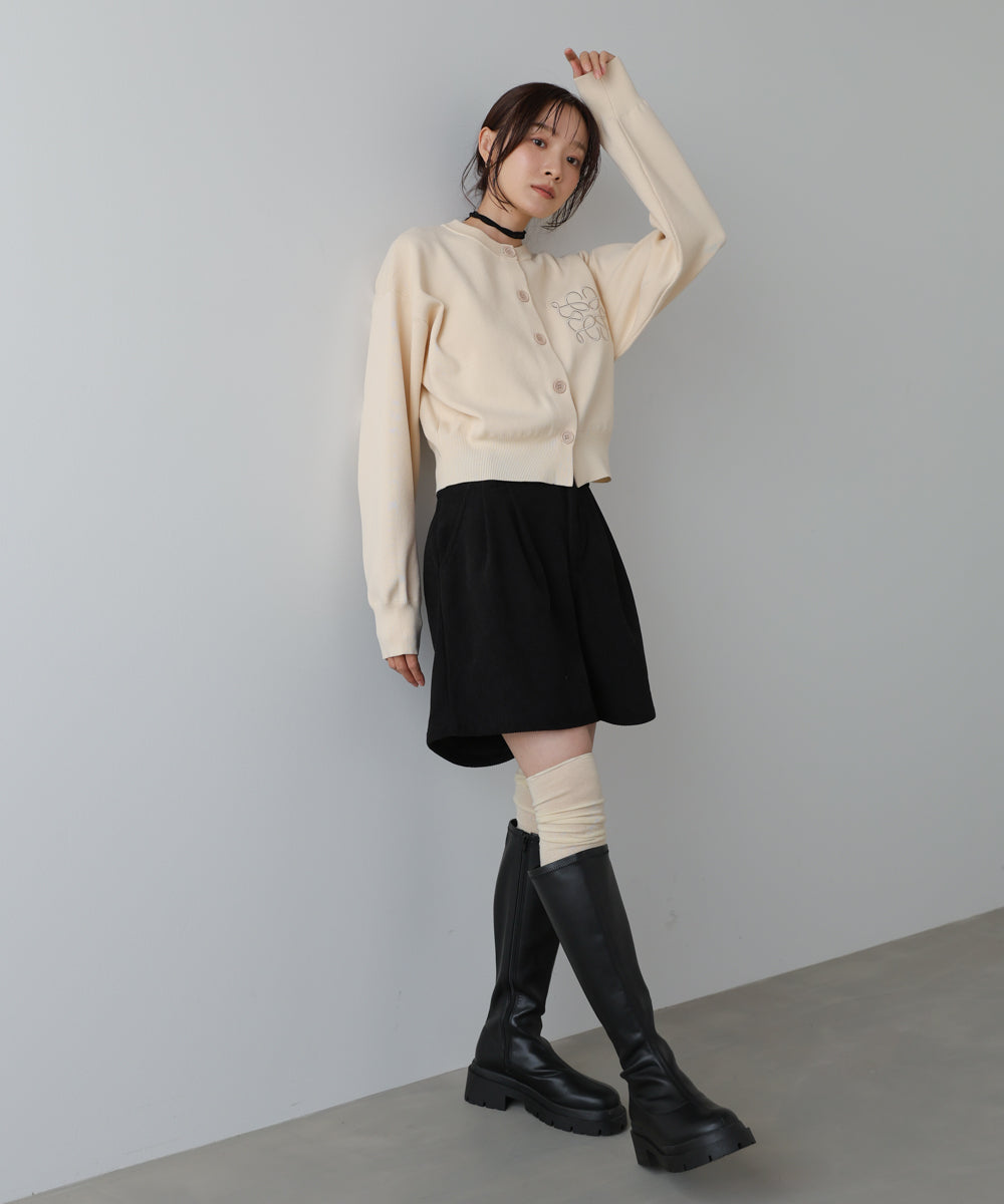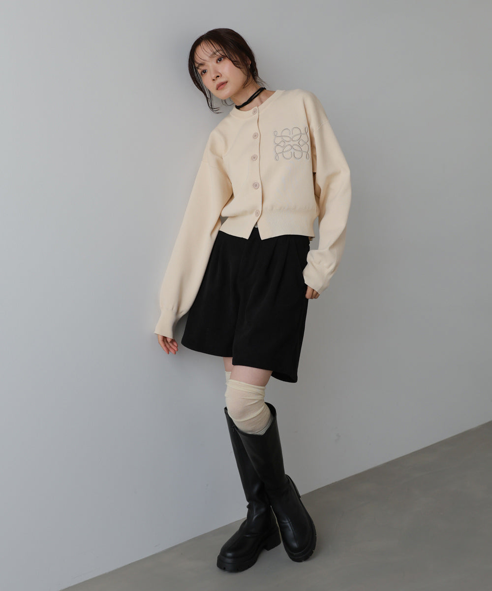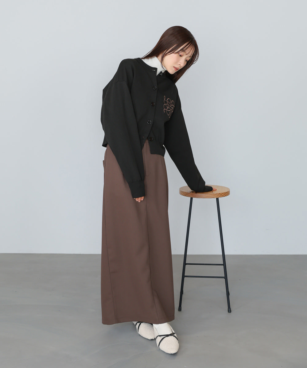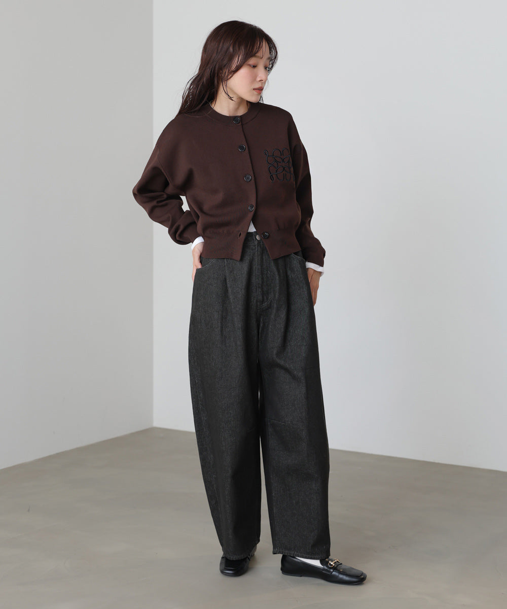 左胸のコード刺繍がさりげないアクセントになったニットカーディガン。ベーシックなシルエットにワンポイントを効かせることで、シンプルながらも大人っぽい存在感を放ちます。ボタンは首元までしっかり閉められるデザインなので、羽織りとしても、トップス感覚でも楽しめる一枚です。