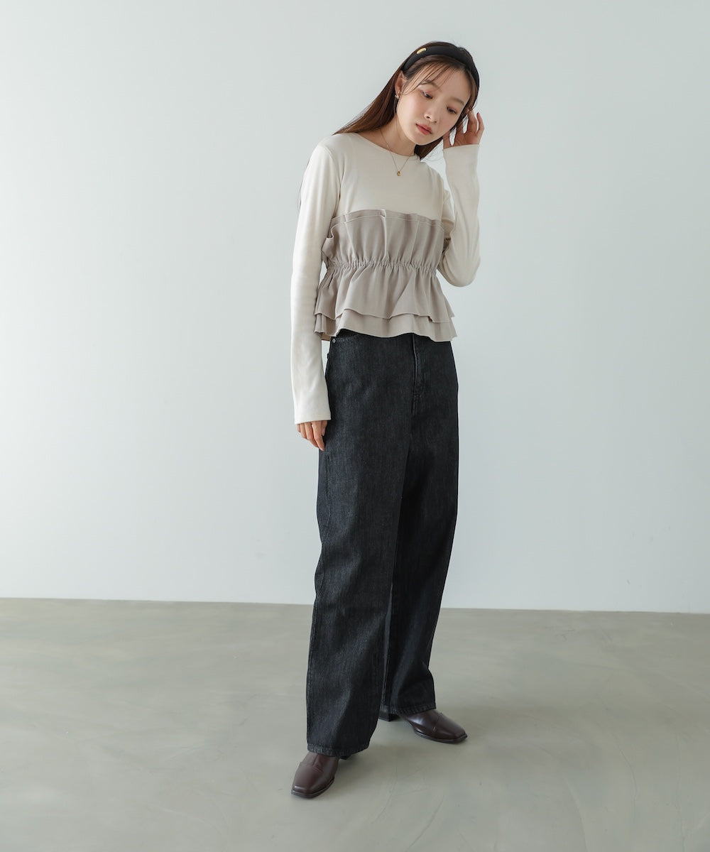 本体は柔らかく肌なじみの良いカットソー素材。裾部分には繊細で存在感のある別生地を使用し、ふんわりとしたハリ感を演出しています。