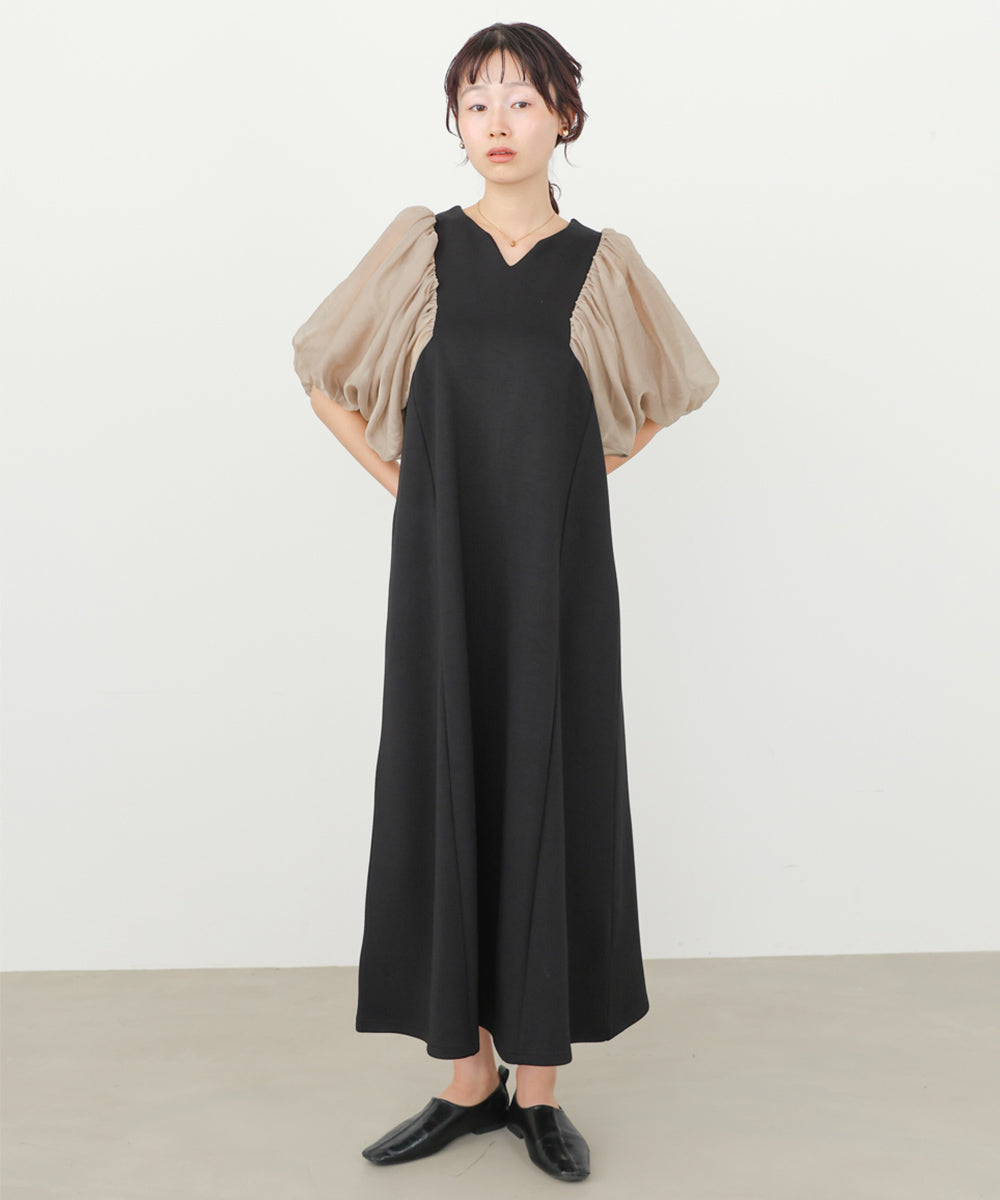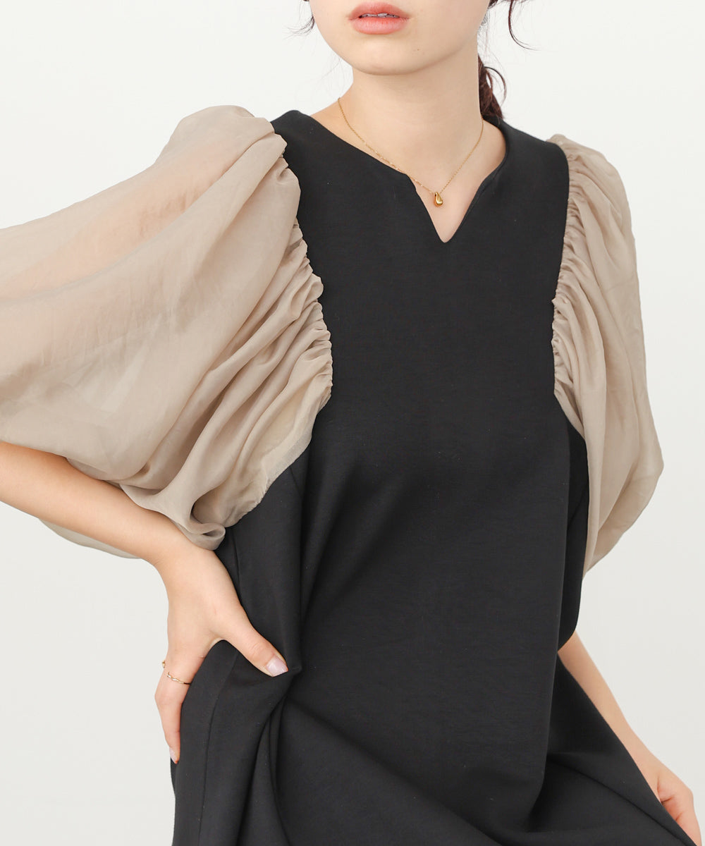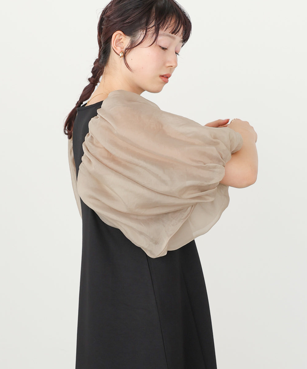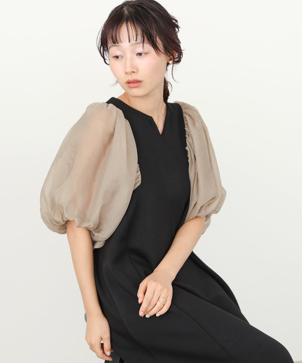 ふんわりとしたボリュームスリーブと控えめなキーネックがやわらかい女性らしさを演出するワンピース。デザインポイントのシアー袖ですが、二重になっている事により肌の透け感が柔らかく、一味違った雰囲気をお楽しみ頂けます。伸縮性があるので後ろ開きがなくても楽に着脱できるのも嬉しいポイントです。小柄な方向けにSサイズもご用意いたしました。