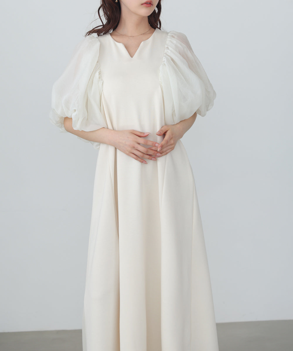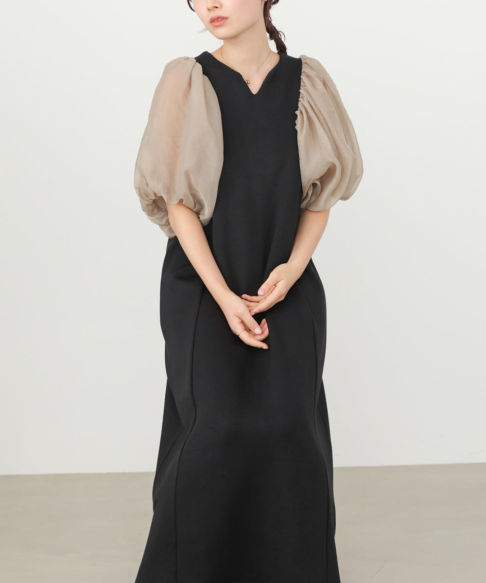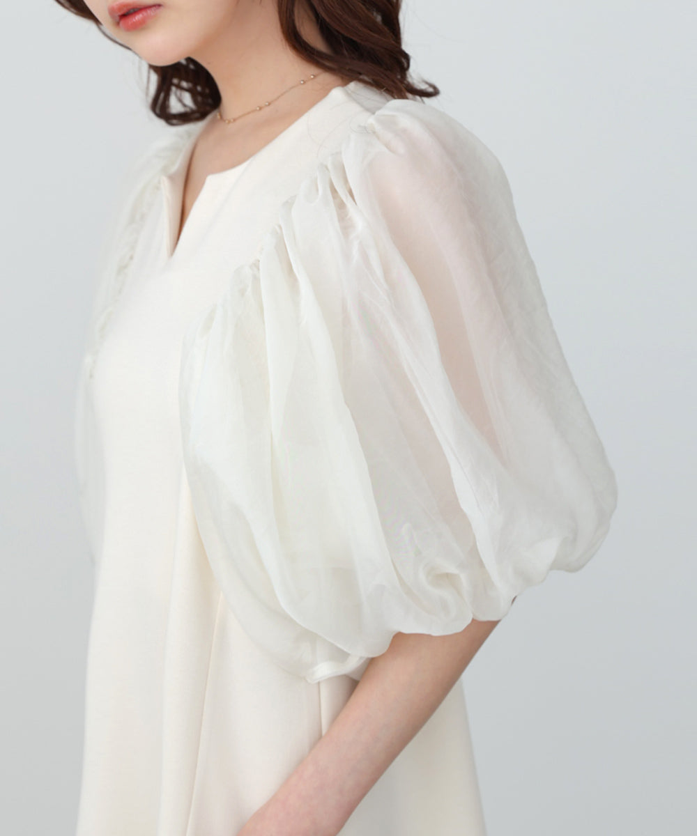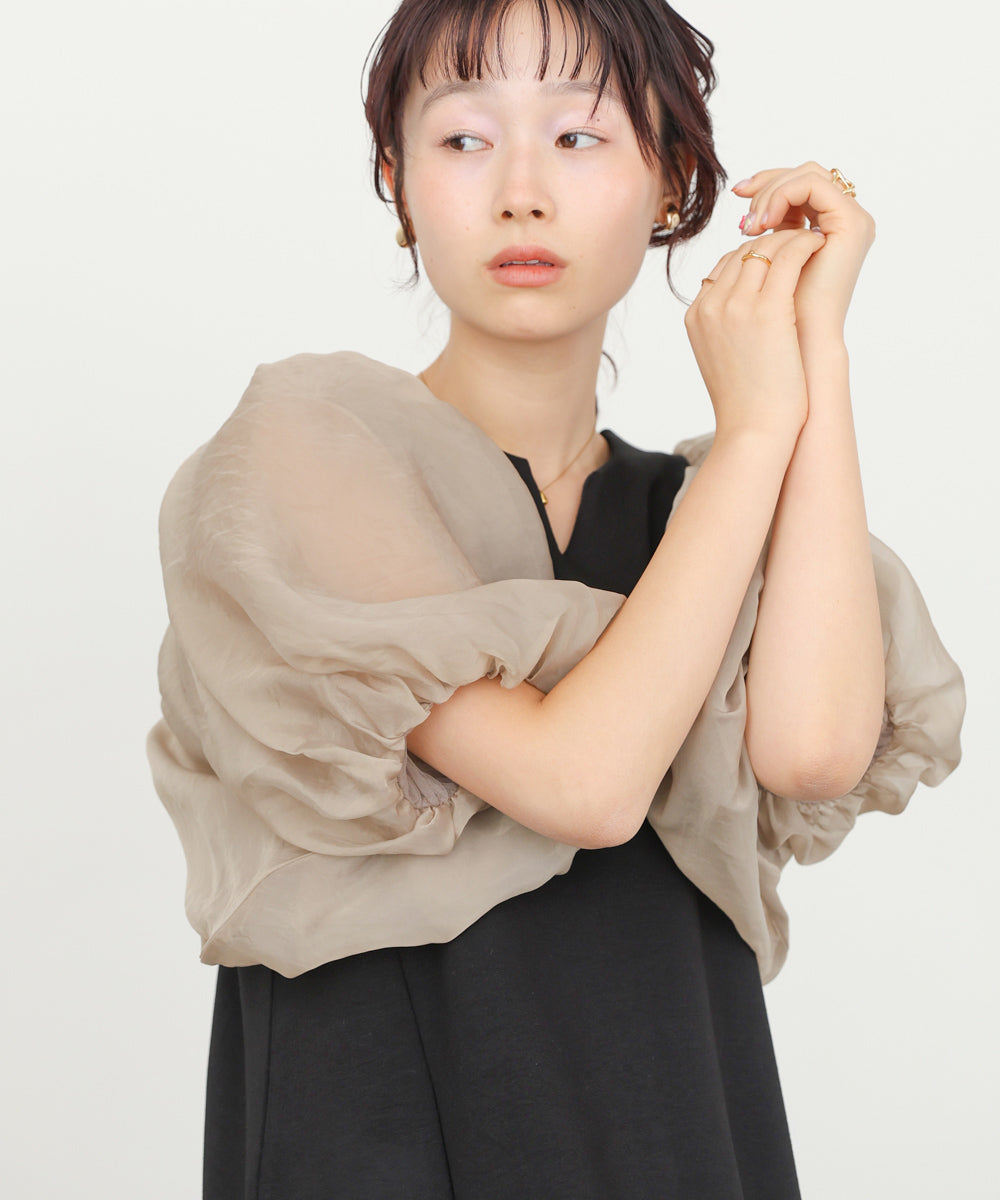 ふんわりとしたボリュームスリーブと控えめなキーネックがやわらかい女性らしさを演出するワンピース。デザインポイントのシアー袖ですが、二重になっている事により肌の透け感が柔らかく、一味違った雰囲気をお楽しみ頂けます。伸縮性があるので後ろ開きがなくても楽に着脱できるのも嬉しいポイントです。小柄な方向けにSサイズもご用意いたしました。