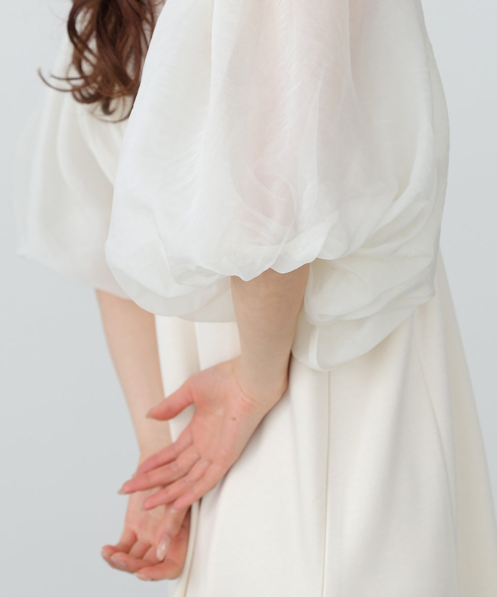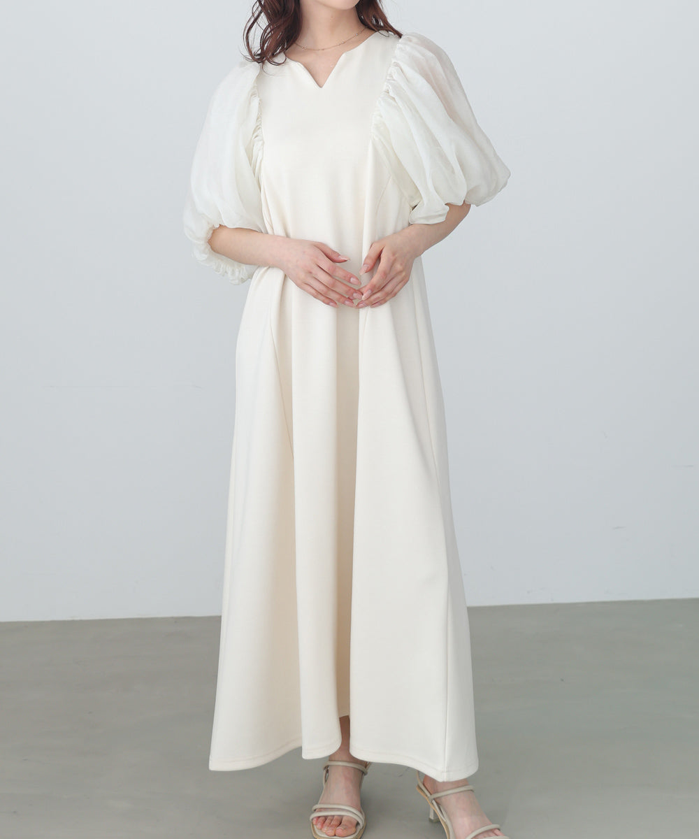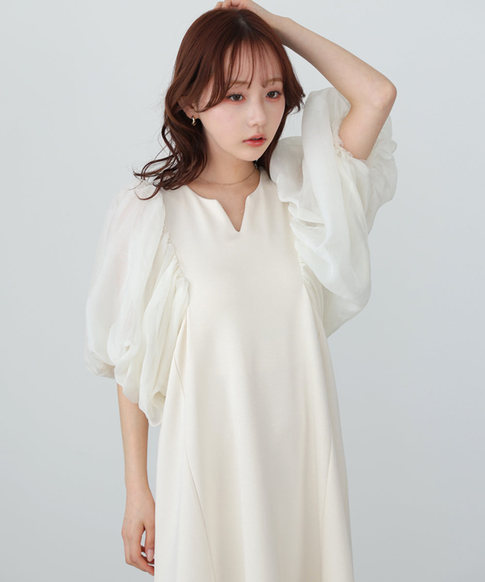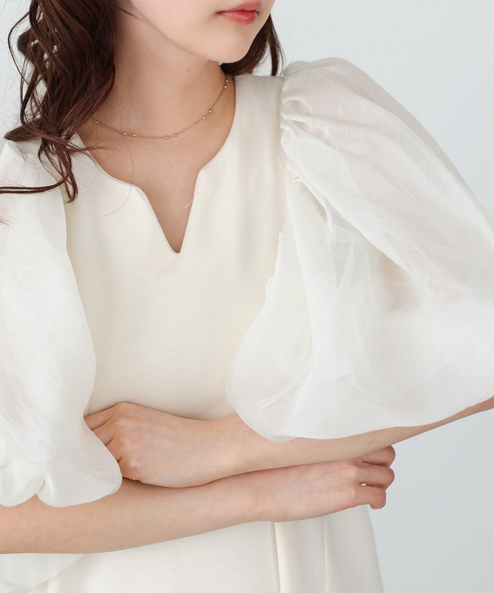 ふんわりとしたボリュームスリーブと控えめなキーネックがやわらかい女性らしさを演出するワンピース。デザインポイントのシアー袖ですが、二重になっている事により肌の透け感が柔らかく、一味違った雰囲気をお楽しみ頂けます。伸縮性があるので後ろ開きがなくても楽に着脱できるのも嬉しいポイントです。小柄な方向けにSサイズもご用意いたしました。