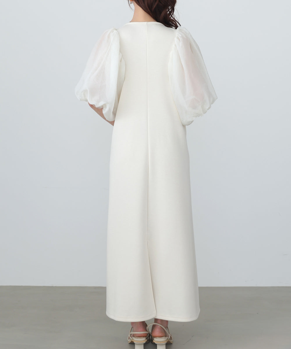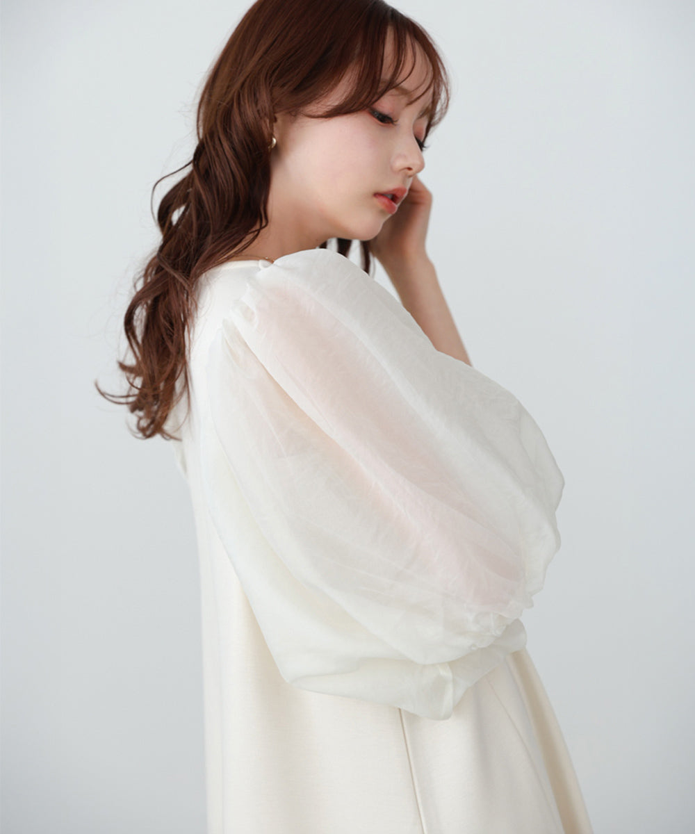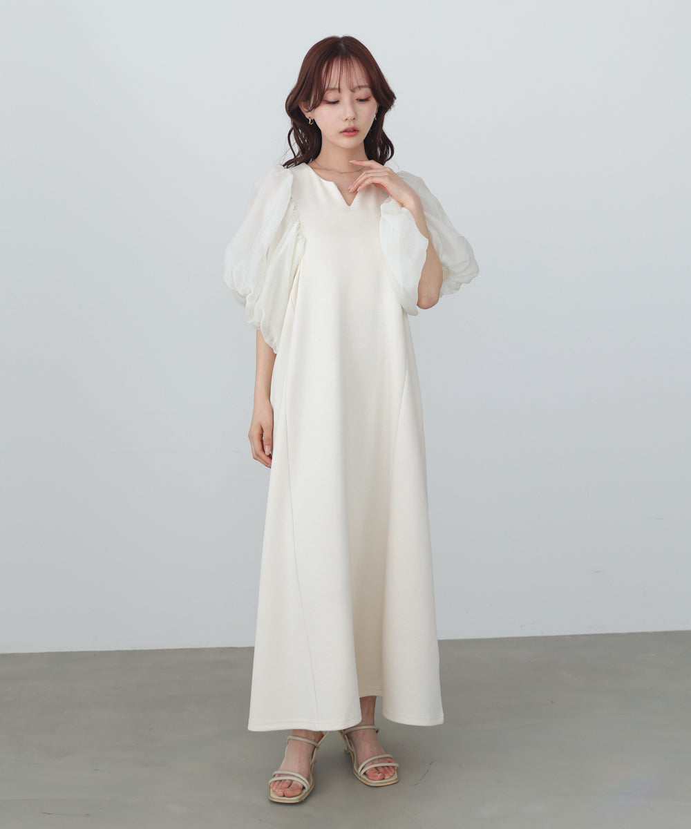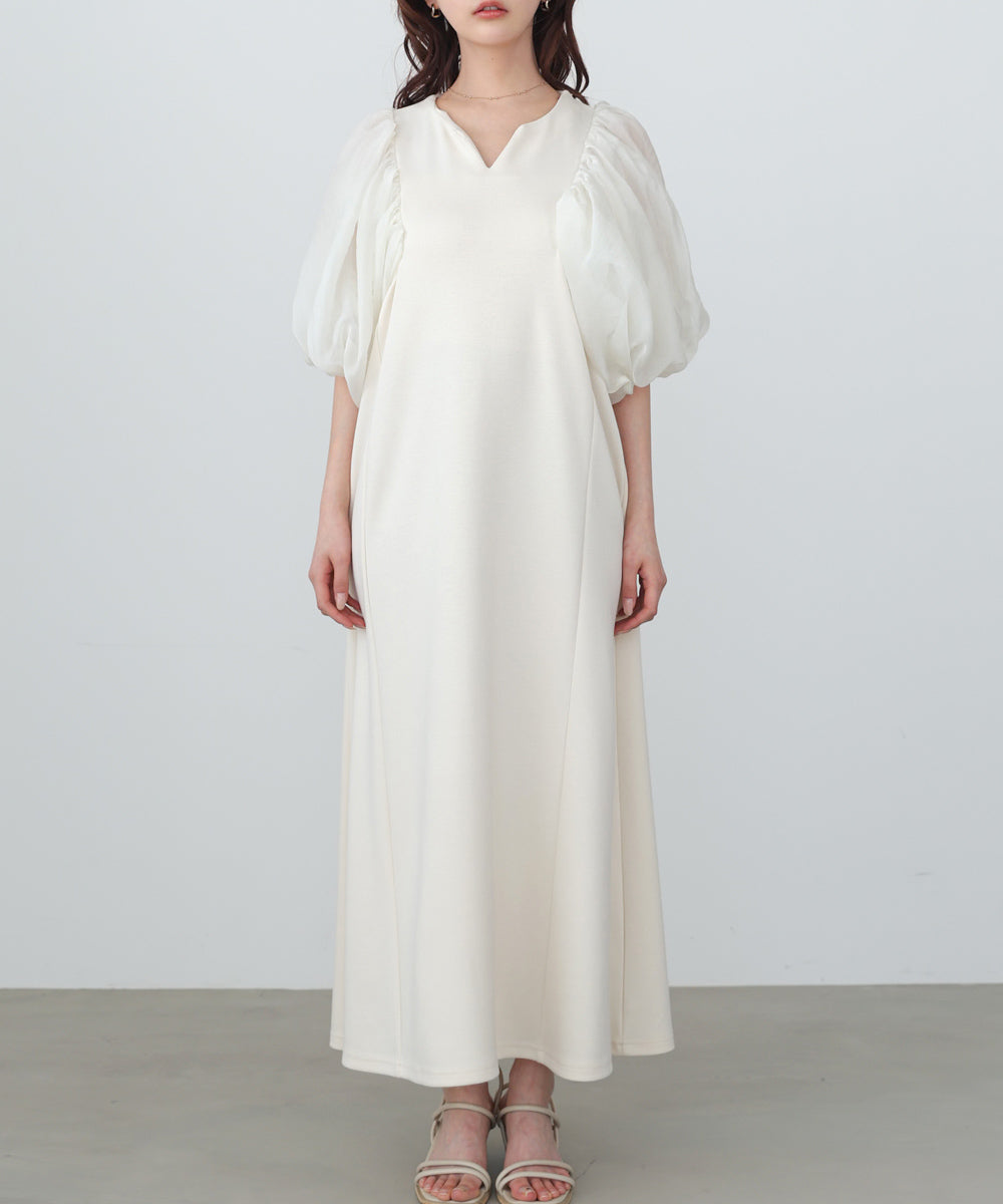 ふんわりとしたボリュームスリーブと控えめなキーネックがやわらかい女性らしさを演出するワンピース。デザインポイントのシアー袖ですが、二重になっている事により肌の透け感が柔らかく、一味違った雰囲気をお楽しみ頂けます。伸縮性があるので後ろ開きがなくても楽に着脱できるのも嬉しいポイントです。小柄な方向けにSサイズもご用意いたしました。