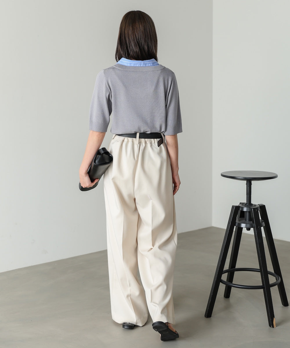 本体はレーヨン混のやわらかなニット素材で、肌あたりがよく快適な着心地。別地にはさらりとした布帛素材を使用し、シャツライクなきちんと感をプラスしています。ほどよい落ち感があり、すっきりとしたシルエットで着用いただけます。