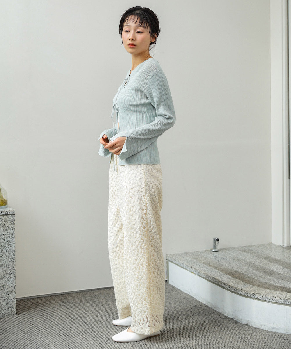 デニムやスラックスと合わせて、程よくカジュアルダウンした大人コーデに。ナロースカートやキャミワンピースの上に羽織れば、女性らしいレイヤードスタイルも楽しめます。リボンを前にして主役トップスとして、後ろにしてさりげないアクセントにするのもおすすめ◎