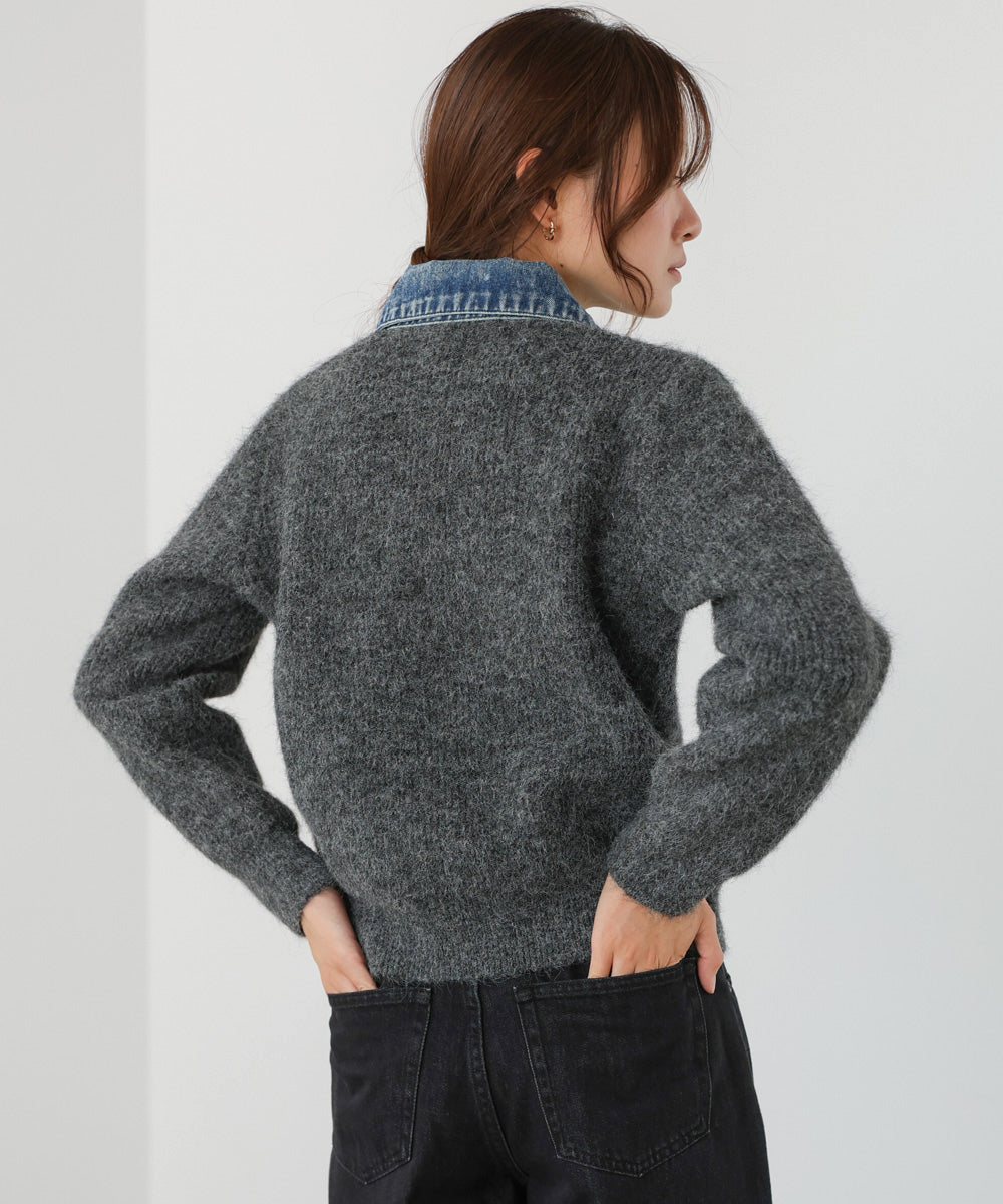 ニットのやわらかさとデニムのカジュアルさを掛け合わせた、デニム切替ニットカーディガン。衿・前立て・ポケットにデニム素材をあしらうことで、シンプルながらも程よく存在感のあるデザインに仕上げています。コンパクトすぎないシルエットで、ボタンを閉じてトップス風に着ても、羽織としても活躍。落ち着いたアイボリー、グレー、チャコールグレーの3色展開で、大人のデイリースタイルに自然と馴染む一枚です。