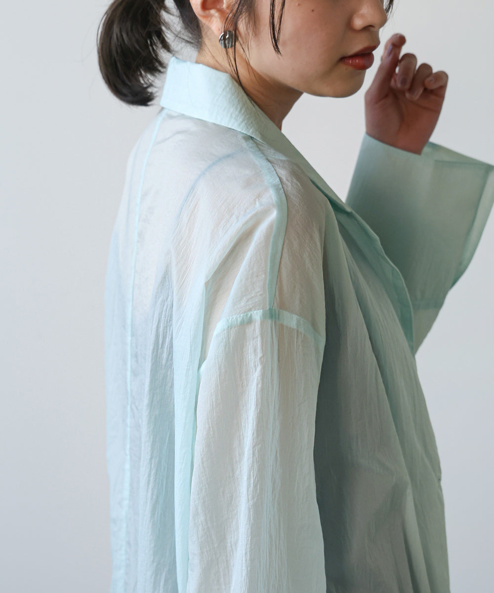 ポリエステル100%の軽やかな素材を使用し、さらっとした肌触りで快適な着心地。シアー感のある生地が通気性を高め、夏でも涼しく着用いただけます。シワになりにくく、持ち運びやすいのも嬉しいポイントです。