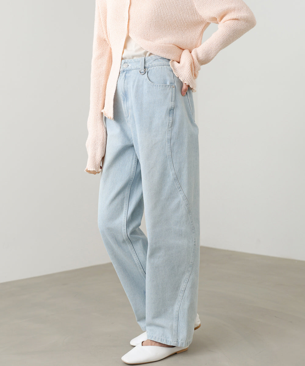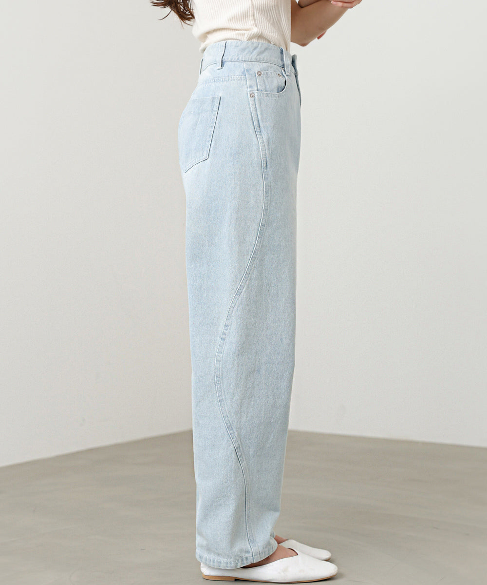 さりげない個性が光る、ウェーブラインデザインのデニムパンツ。サイドに施された立体的なウェーブ切替が、シンプルなデニムスタイルに程よいアクセントをプラスします。ストレートベースのシルエットで脚のラインを拾いすぎず、体型カバーとこなれ感を両立。ベーシックながらも周りと差がつく、デイリーに頼れる一本です。