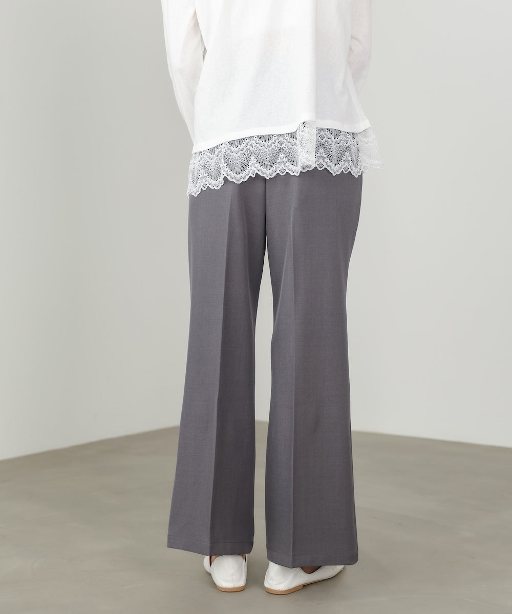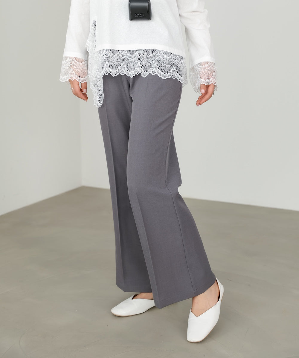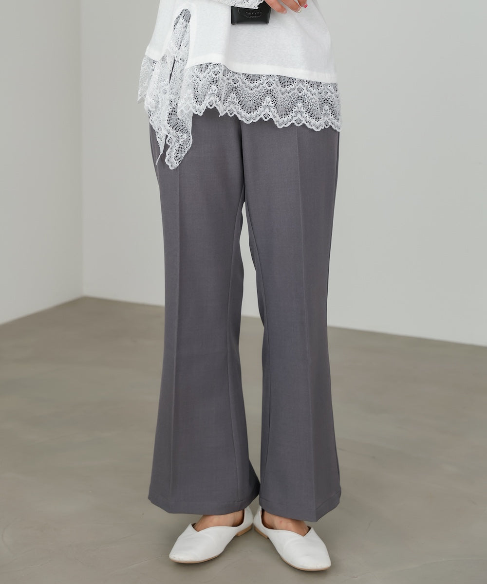 脚をすらっと長く見せてくれる、ストレッチツイル素材のセミフレアスラックスパンツ。膝下からやや広がる絶妙なフレアラインが、きれいめながらもどこか女性らしい柔らかさをプラスしてくれます。センターラインが縦のラインを強調し、自然とスタイルアップ見えが叶う一枚。後ろウエストはゴム仕様なので、きちんと感がありながらもストレスフリーな穿き心地に。デイリーにもお仕事にも頼れる万能スラックスです。
