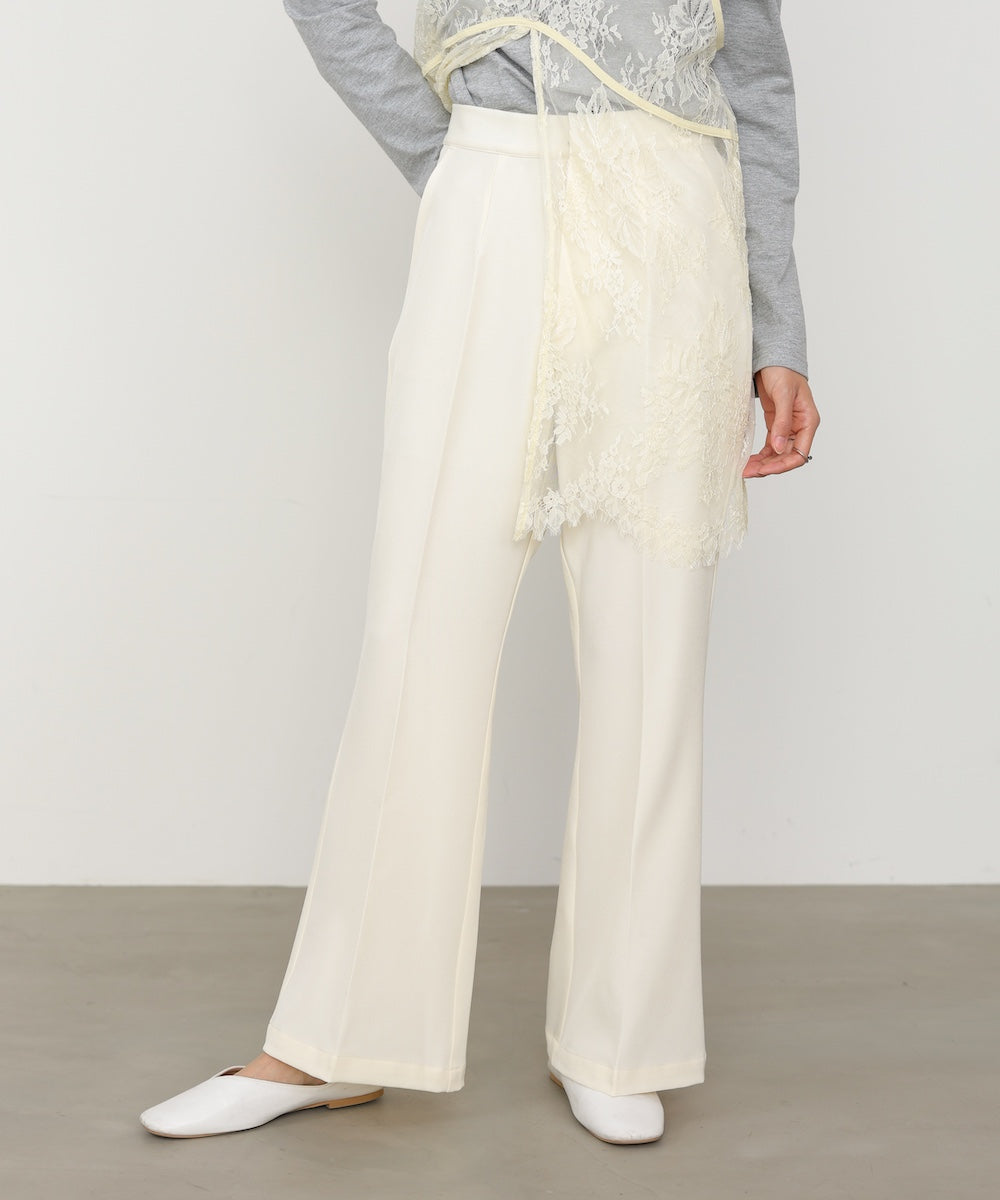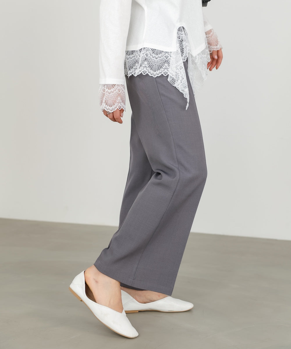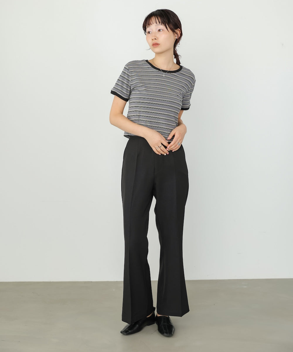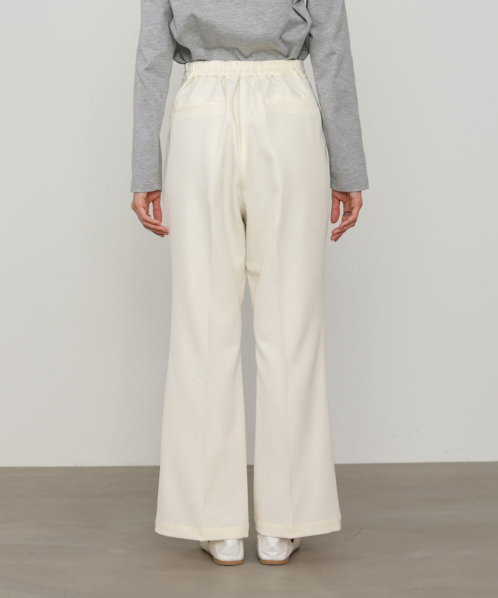 脚をすらっと長く見せてくれる、ストレッチツイル素材のセミフレアスラックスパンツ。膝下からやや広がる絶妙なフレアラインが、きれいめながらもどこか女性らしい柔らかさをプラスしてくれます。センターラインが縦のラインを強調し、自然とスタイルアップ見えが叶う一枚。後ろウエストはゴム仕様なので、きちんと感がありながらもストレスフリーな穿き心地に。デイリーにもお仕事にも頼れる万能スラックスです。