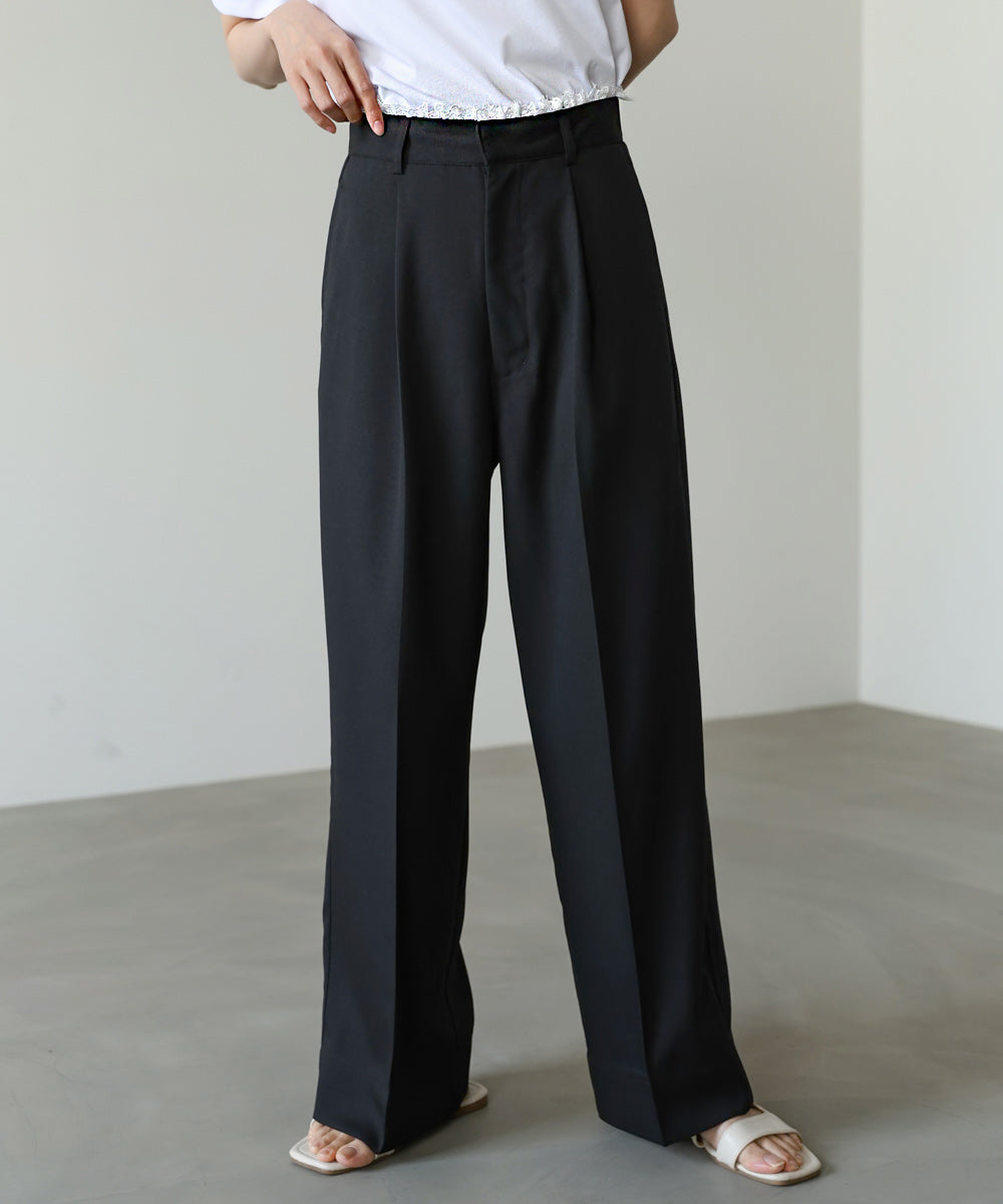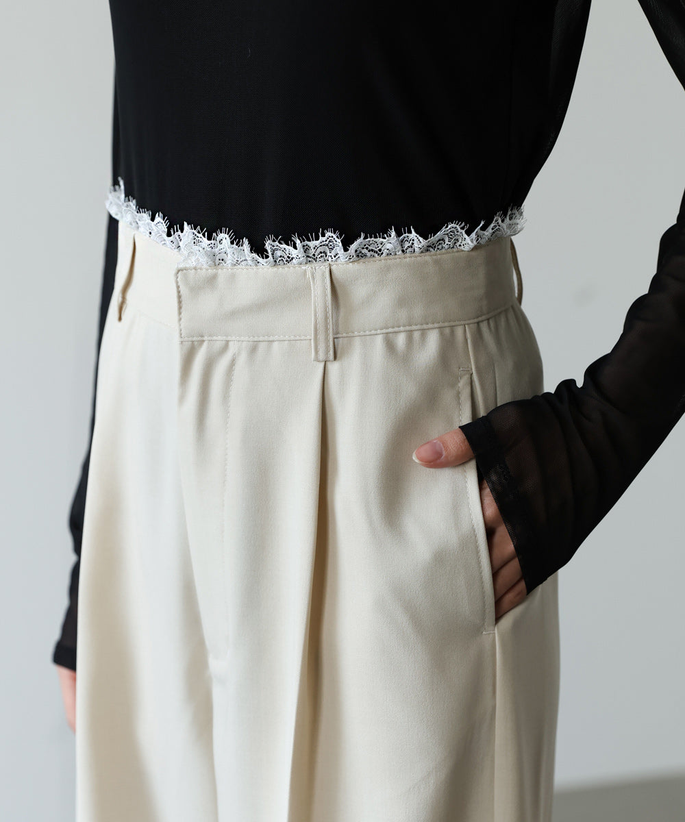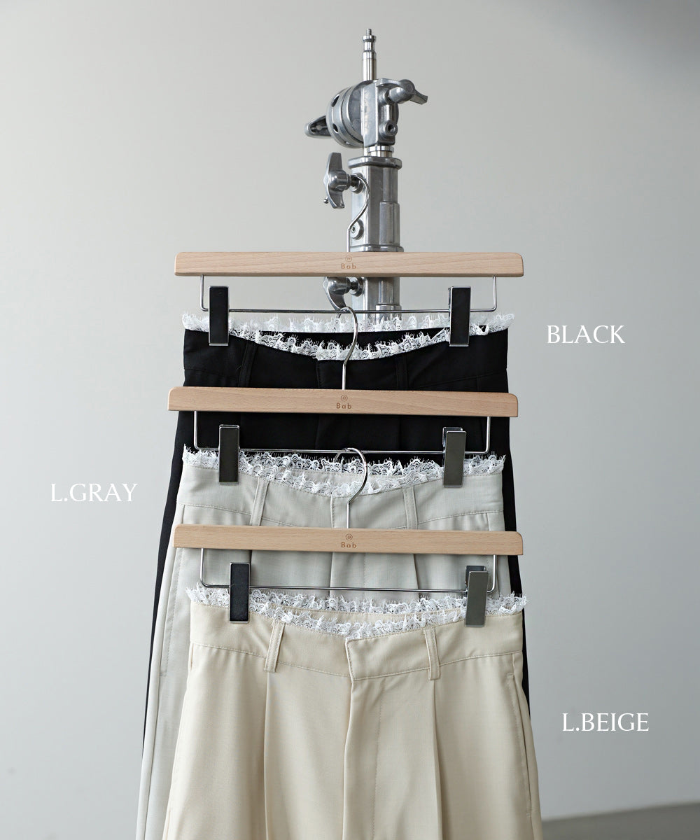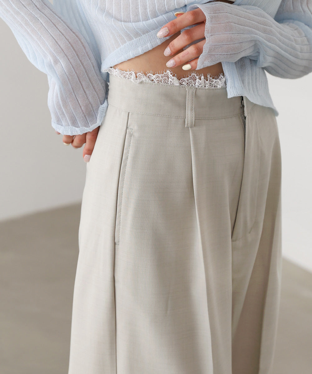 本体はさらりとしたポリエステル素材で、軽やかで快適な履き心地。シワになりにくく、デイリー使いにも取り入れやすいのが魅力です。ウエスト部分には伸縮性のあるレースを使用し、フィット感とデザイン性を両立しています。