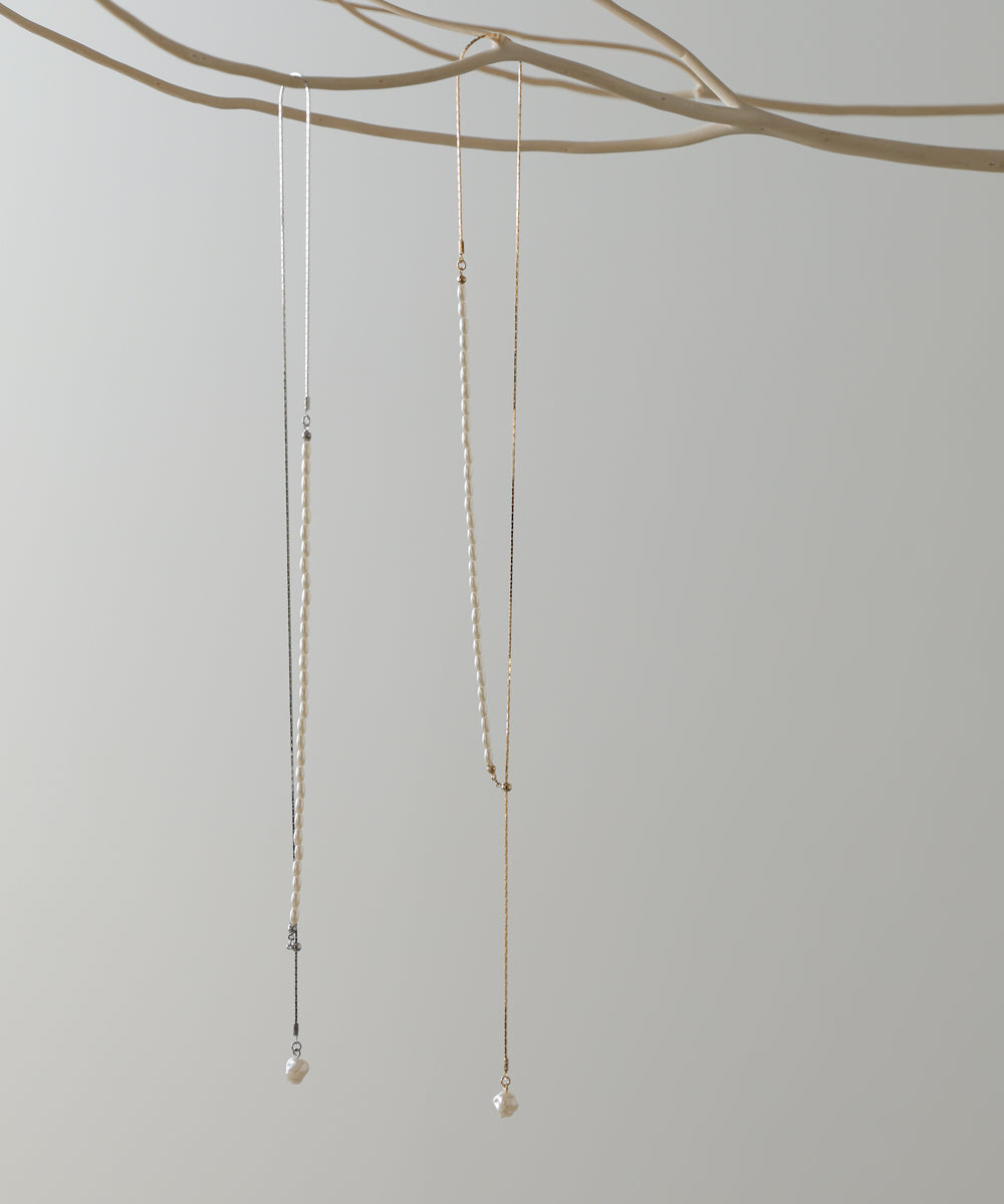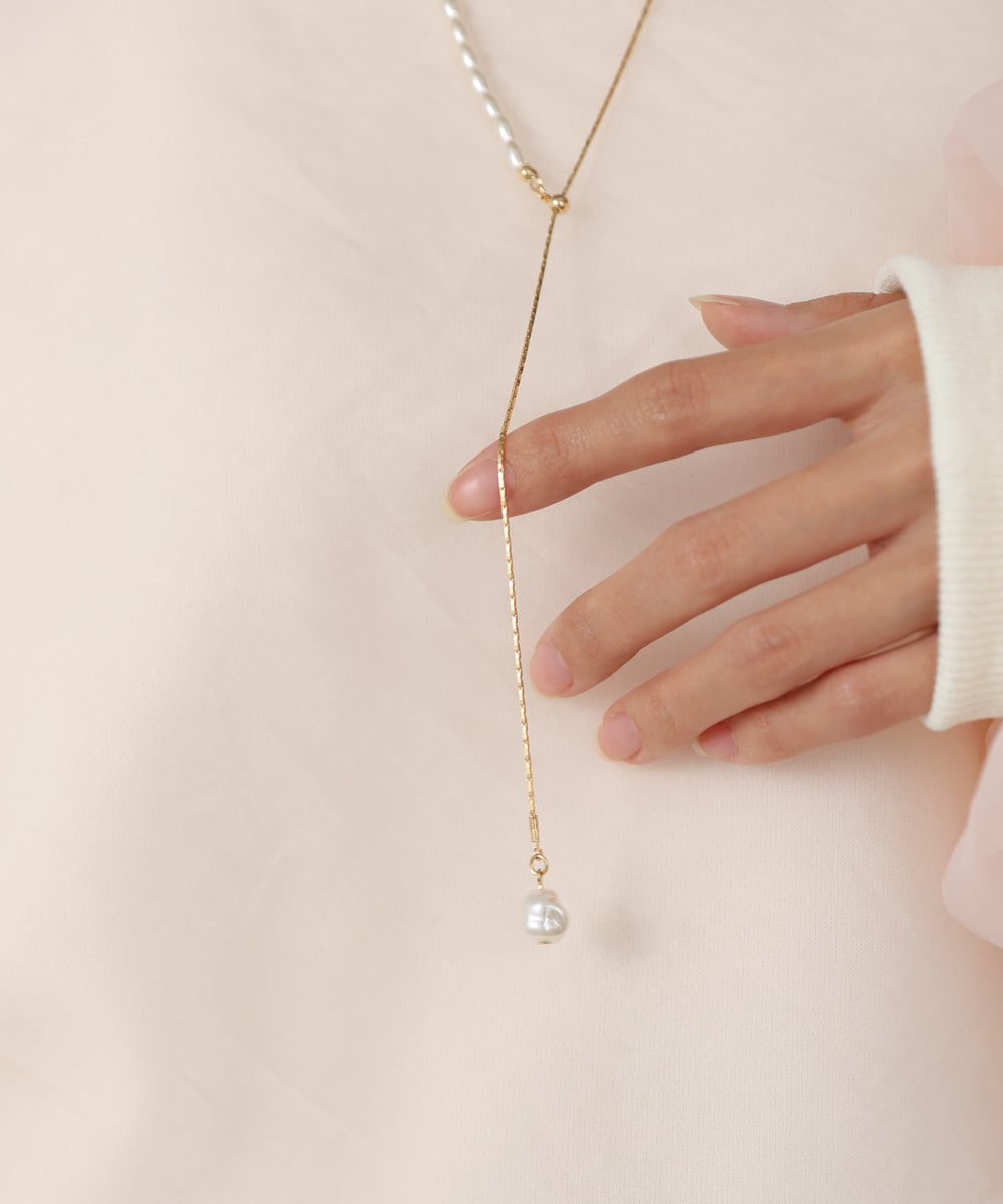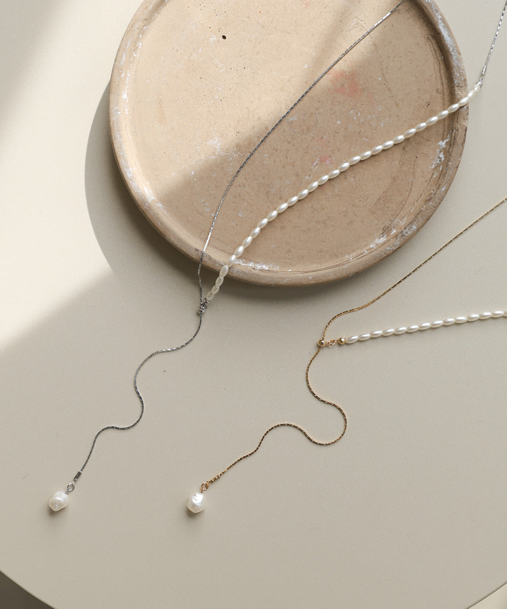 パールと華奢チェーンを半分ずつ組み合わせた、存在感のある変形デザインが魅力のロングネックレス。留め具のない仕様で、チェーンをスライドさせるだけでお好きな長さに調節できるため、気分やトップスに合わせてバランスを変えられるのがポイント。先端には一粒パールがゆらりと揺れ、シンプルなスタイリングにも上品なアクセントを添えてくれます。シルバーはクリーンで透明感のある印象に、ゴールドはやわらかく女性らしいムードに。1本でこなれ感と華やぎを叶えてくれる、大人女性にぴったりの万能ネックレスです。