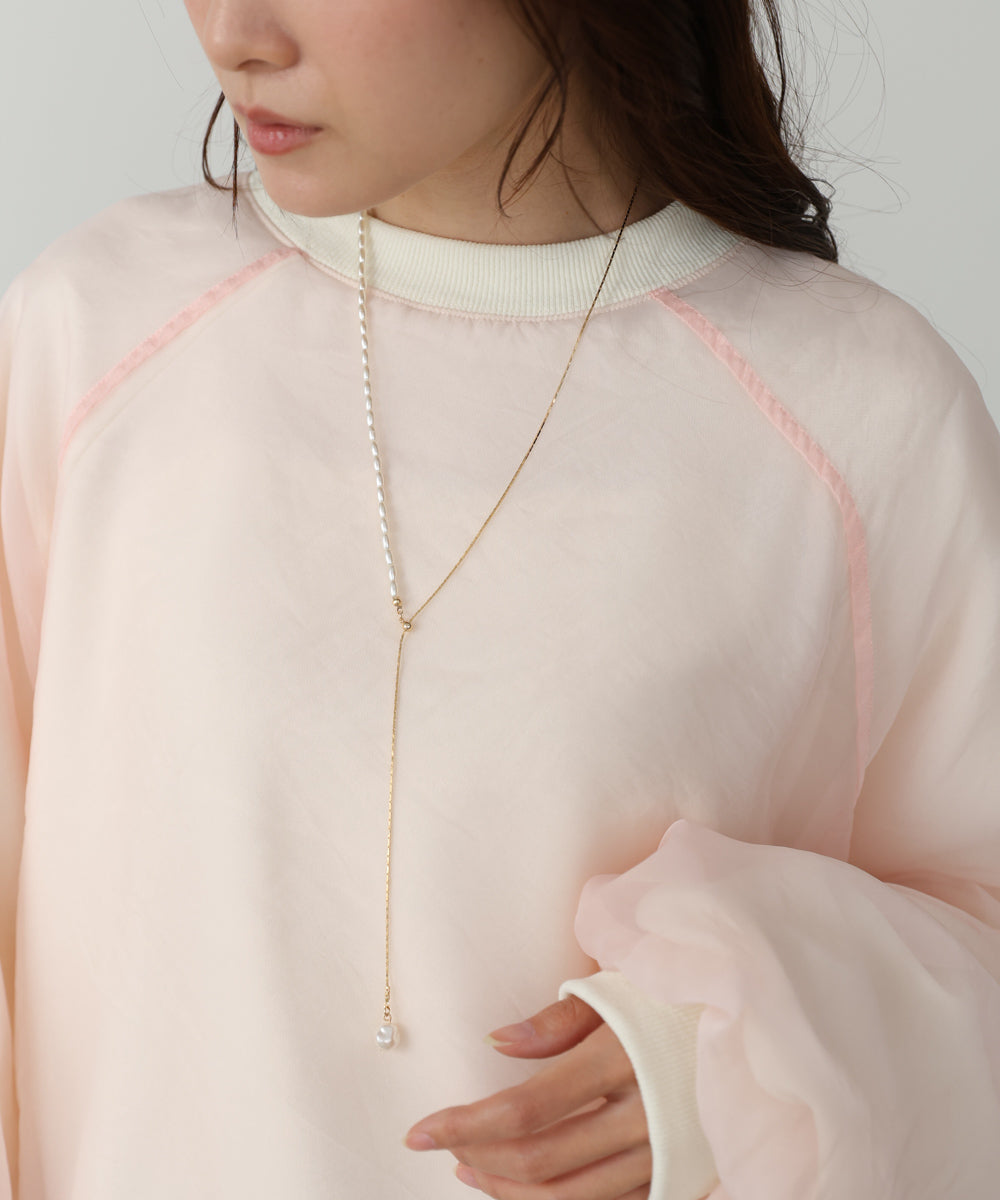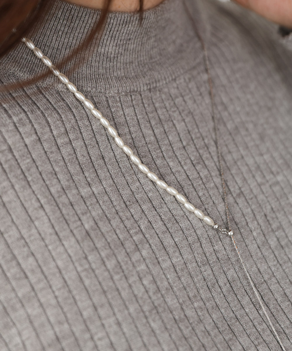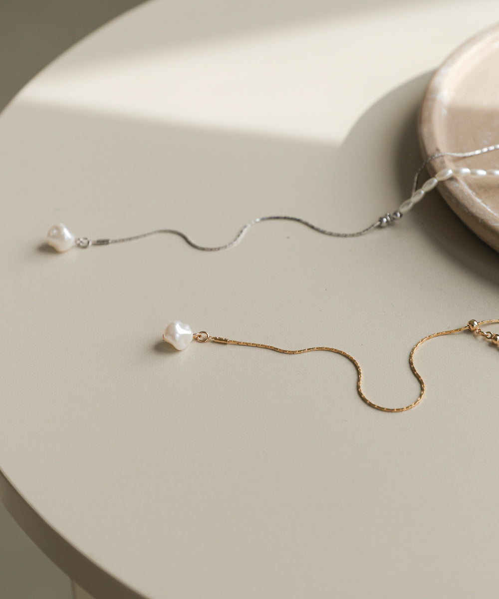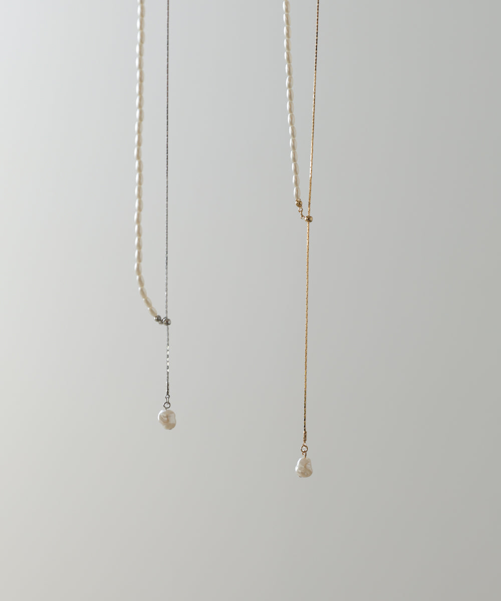 パールと華奢チェーンを半分ずつ組み合わせた、存在感のある変形デザインが魅力のロングネックレス。留め具のない仕様で、チェーンをスライドさせるだけでお好きな長さに調節できるため、気分やトップスに合わせてバランスを変えられるのがポイント。先端には一粒パールがゆらりと揺れ、シンプルなスタイリングにも上品なアクセントを添えてくれます。シルバーはクリーンで透明感のある印象に、ゴールドはやわらかく女性らしいムードに。1本でこなれ感と華やぎを叶えてくれる、大人女性にぴったりの万能ネックレスです。