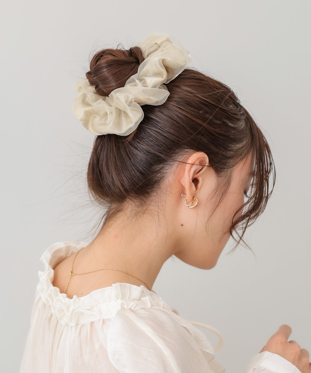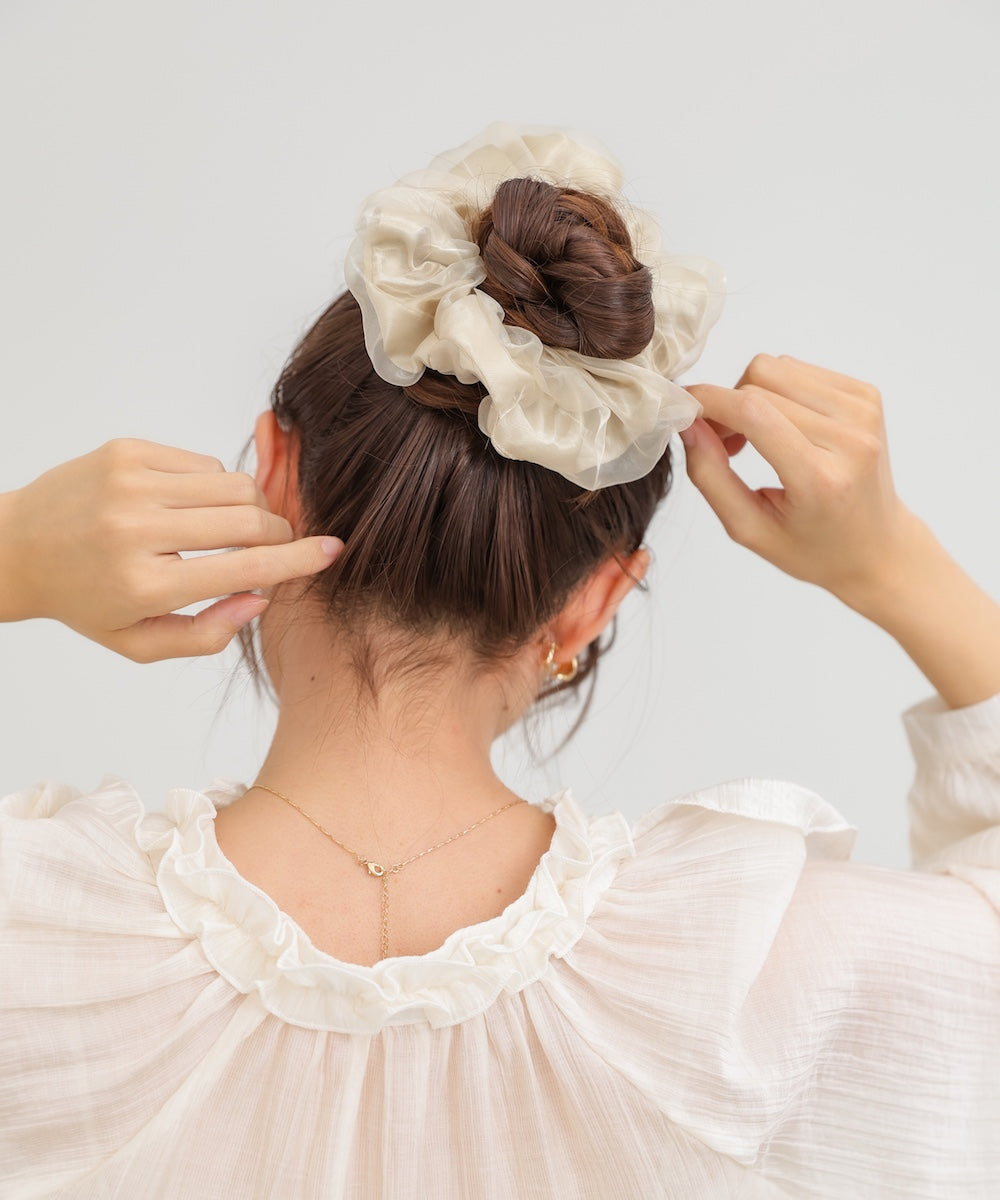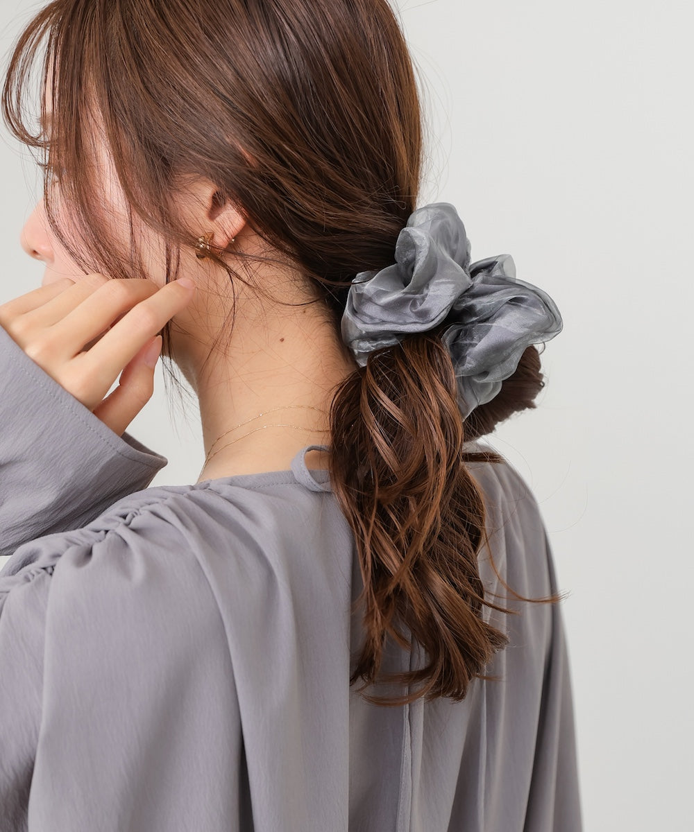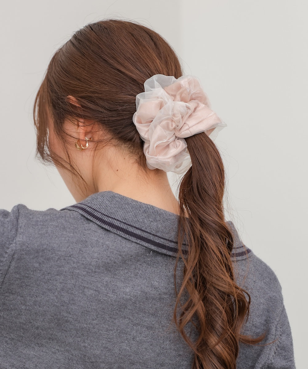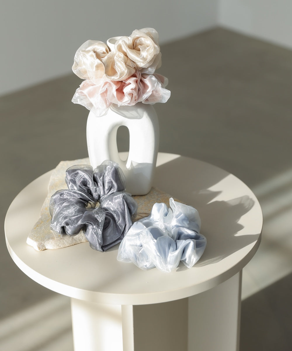 透け感のあるオーガンジーと、上品な光沢感のサテンを組み合わせたシュシュ。異素材のコントラストが、シンプルながらも存在感のあるデザインに仕上げています。程よいボリューム感で、まとめ髪にさっとプラスするだけで女性らしいニュアンスを演出。デイリーからちょっとしたお出かけまで、幅広いシーンで活躍するアイテムです。