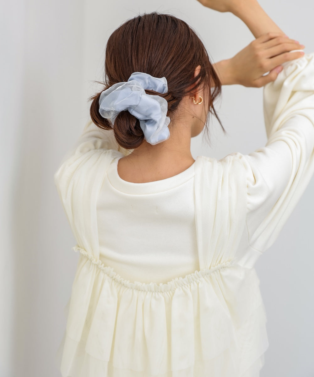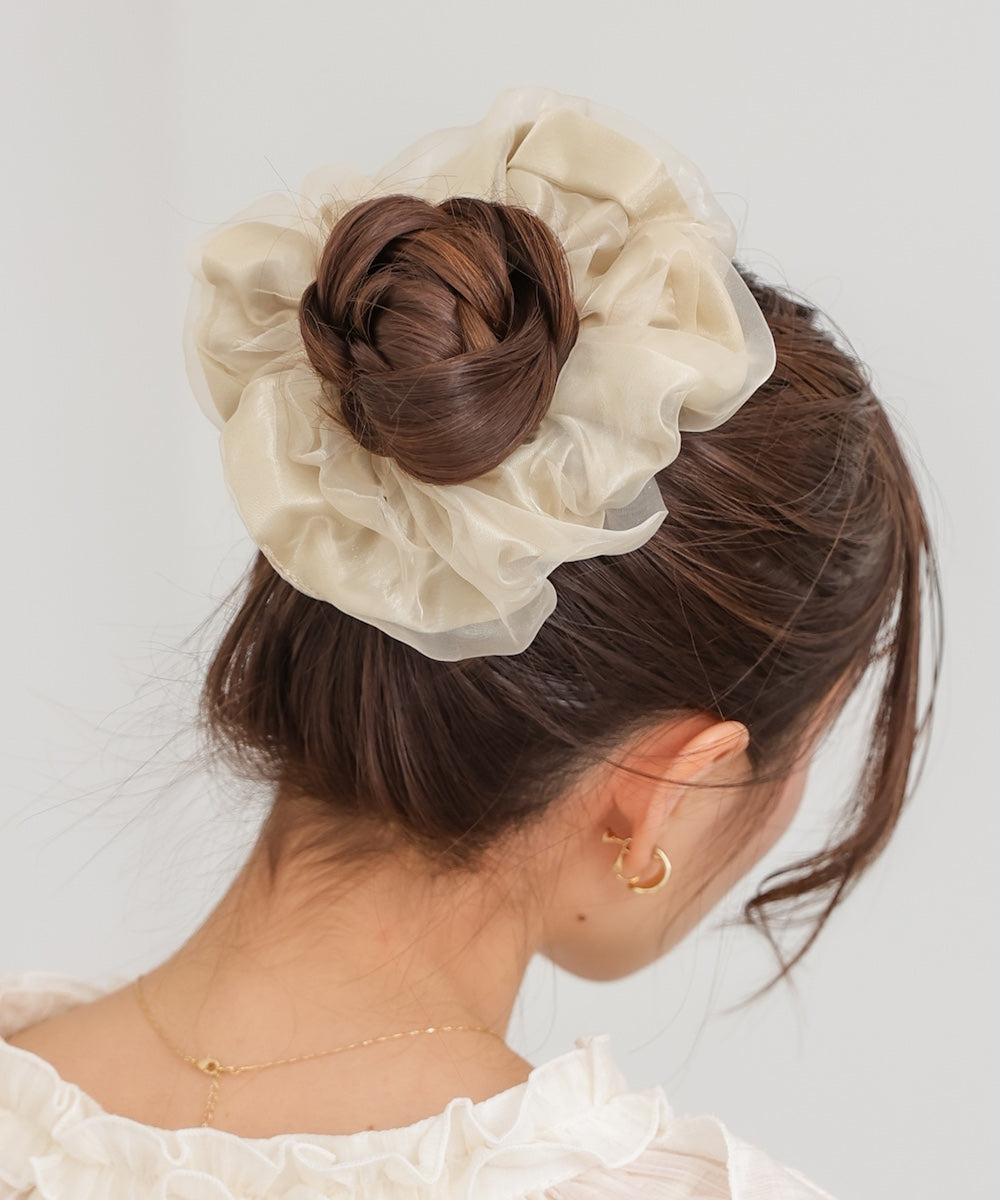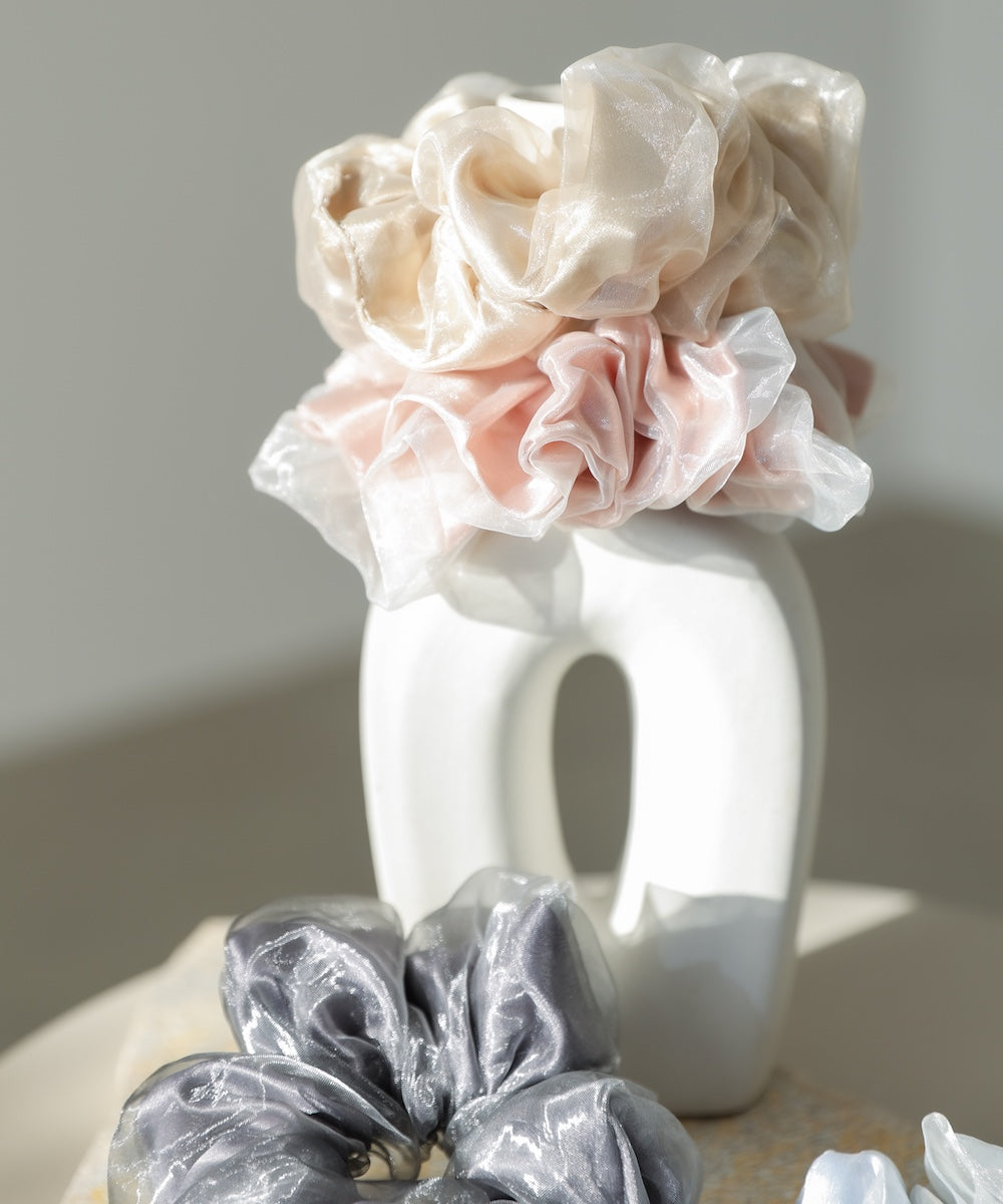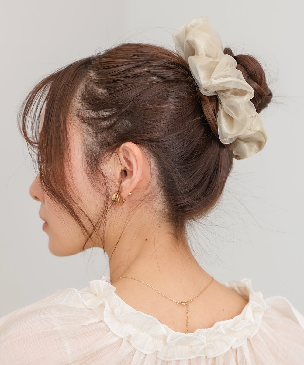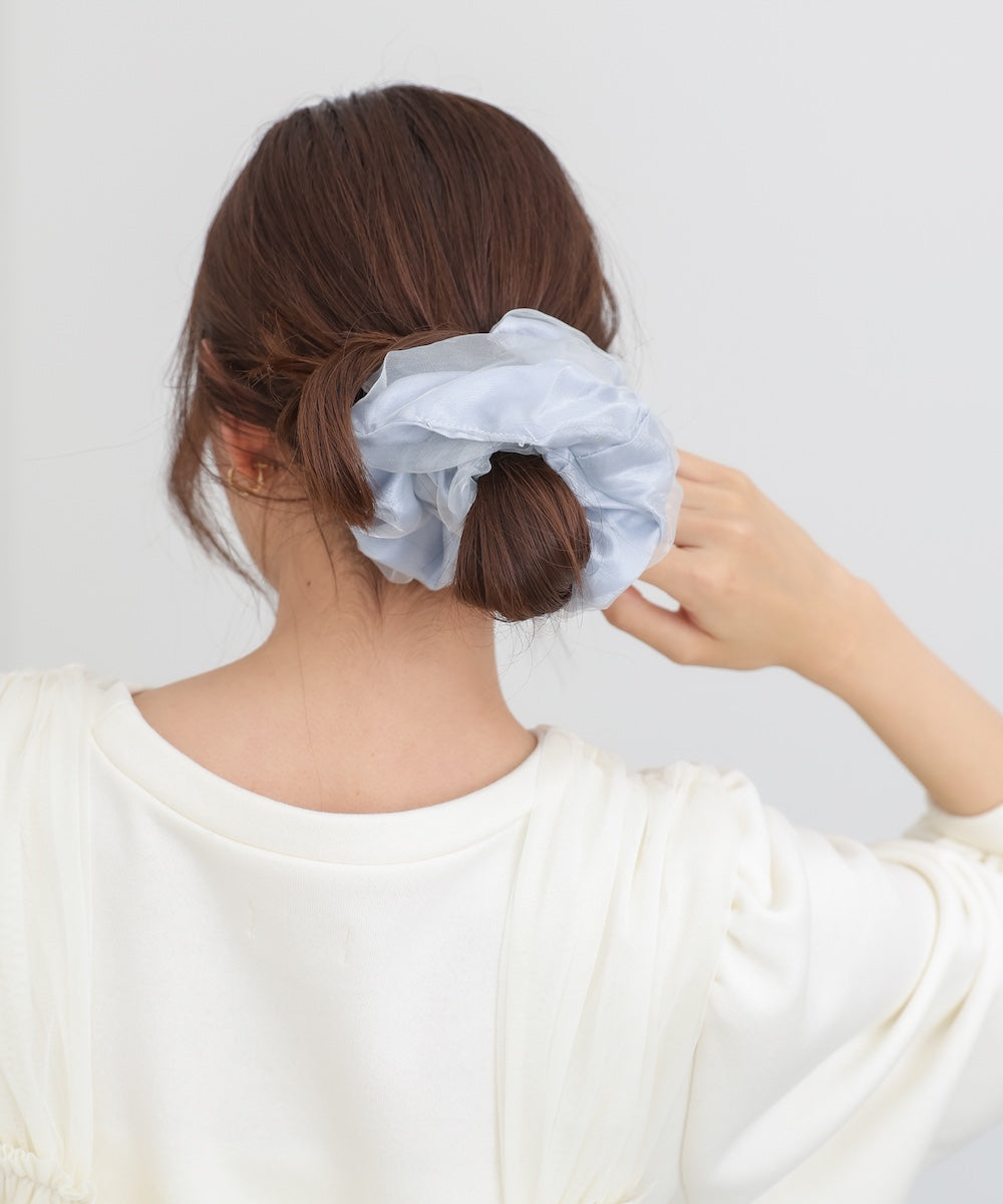 透け感のあるオーガンジーと、上品な光沢感のサテンを組み合わせたシュシュ。異素材のコントラストが、シンプルながらも存在感のあるデザインに仕上げています。程よいボリューム感で、まとめ髪にさっとプラスするだけで女性らしいニュアンスを演出。デイリーからちょっとしたお出かけまで、幅広いシーンで活躍するアイテムです。