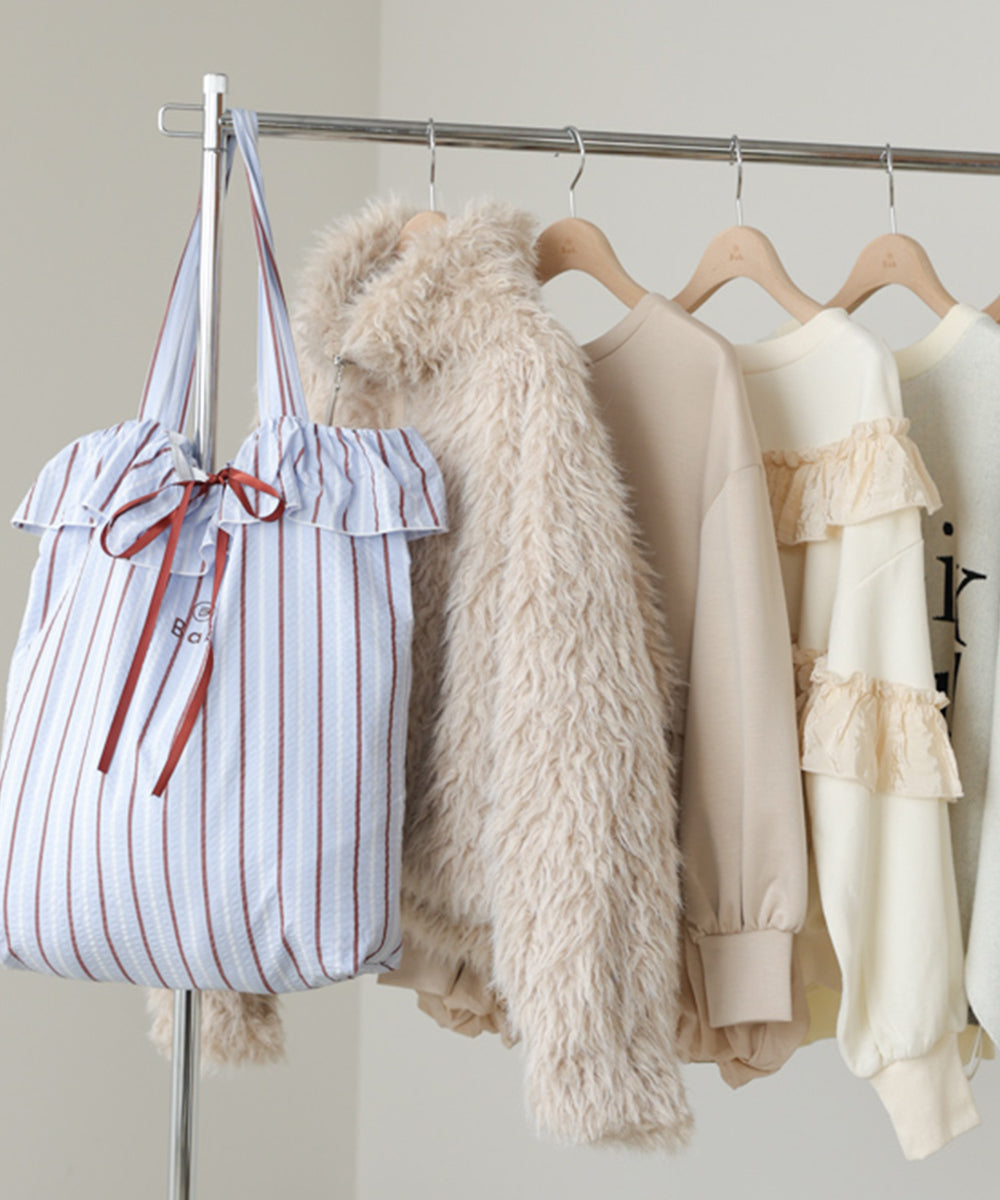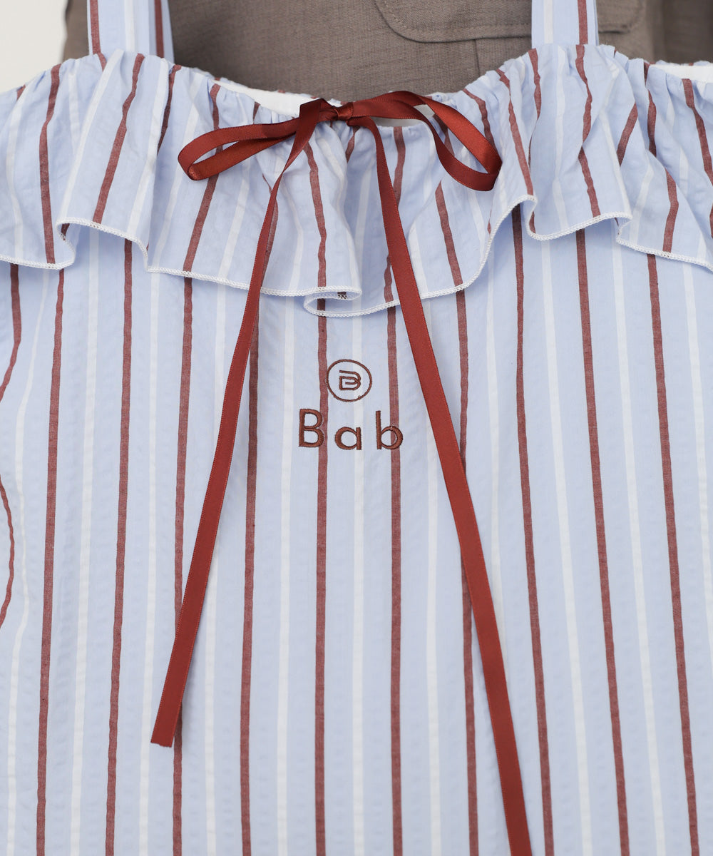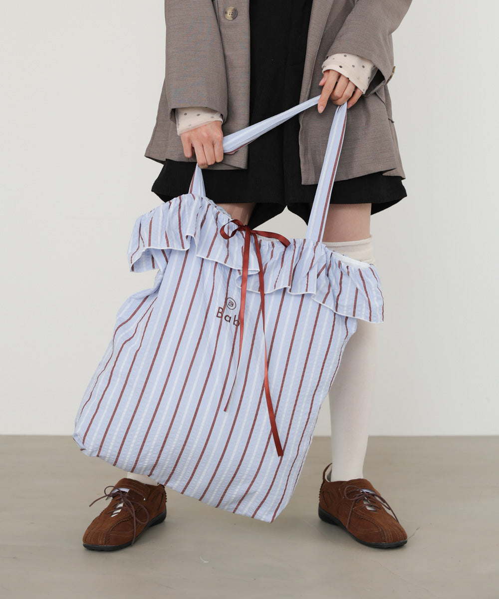 さらに、Babの刺しゅう入りトートバッグもセットに。淡いブルーにブラウンとホワイトのストライプを効かせたトートバッグは、上部のフリルデザインがさりげないポイント。裏地付きでしっかりとした生地感があり、収納力も抜群。お出かけや通勤など、日常使いにも頼れる万能バッグです。