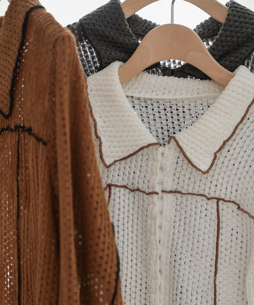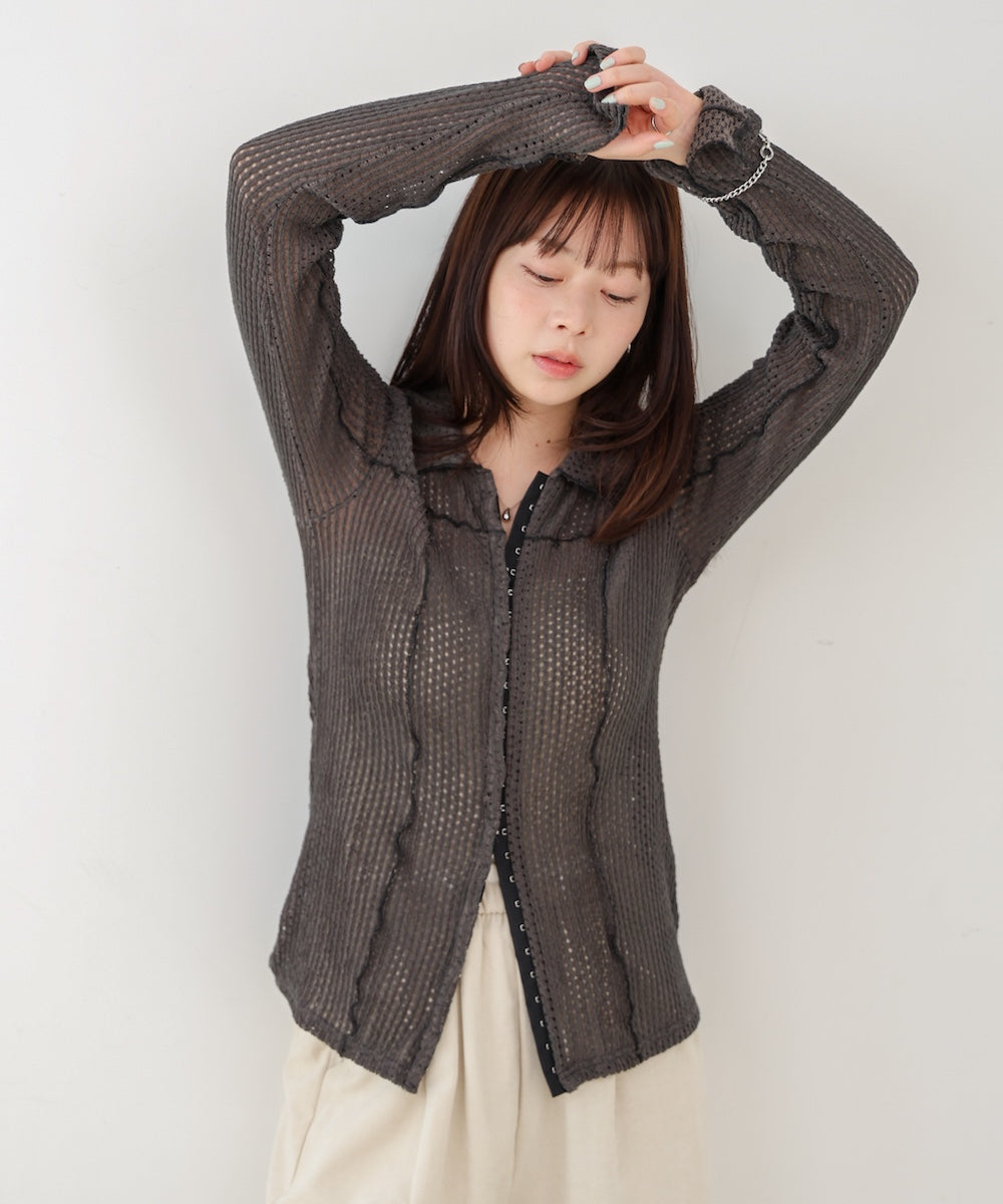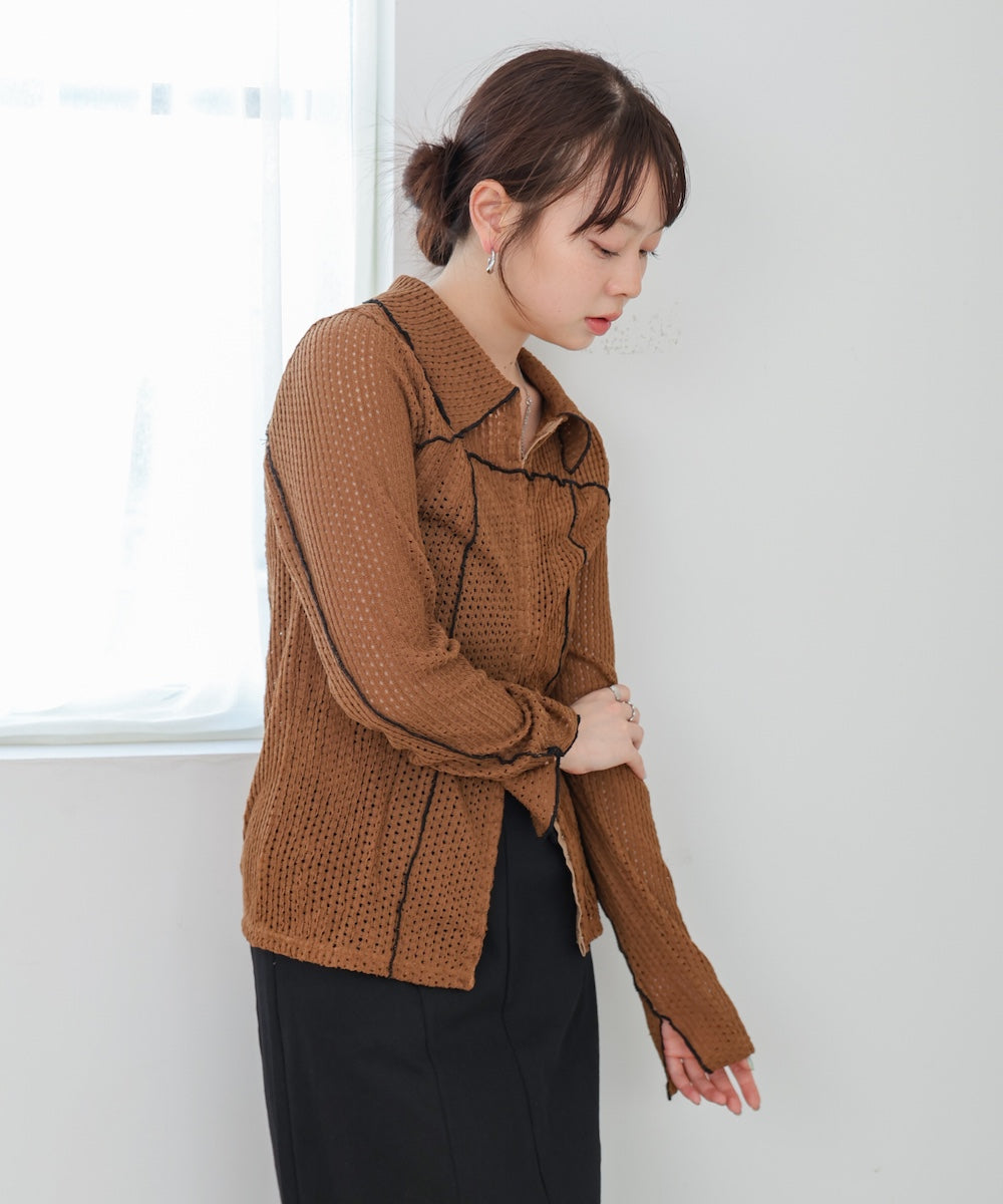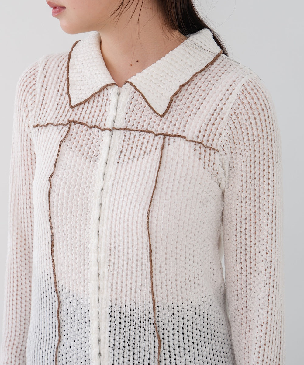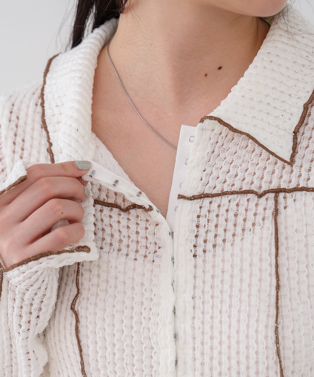 全体的に施されたトレンドライクなウェーブメロウがポイントのトップスになっています。さらに、チャックやボタンではなくあえてホックにすることで一癖あるデザインになっています。Iラインが強調されるシルエットになるのでスタイルアップしたコーディングになります。