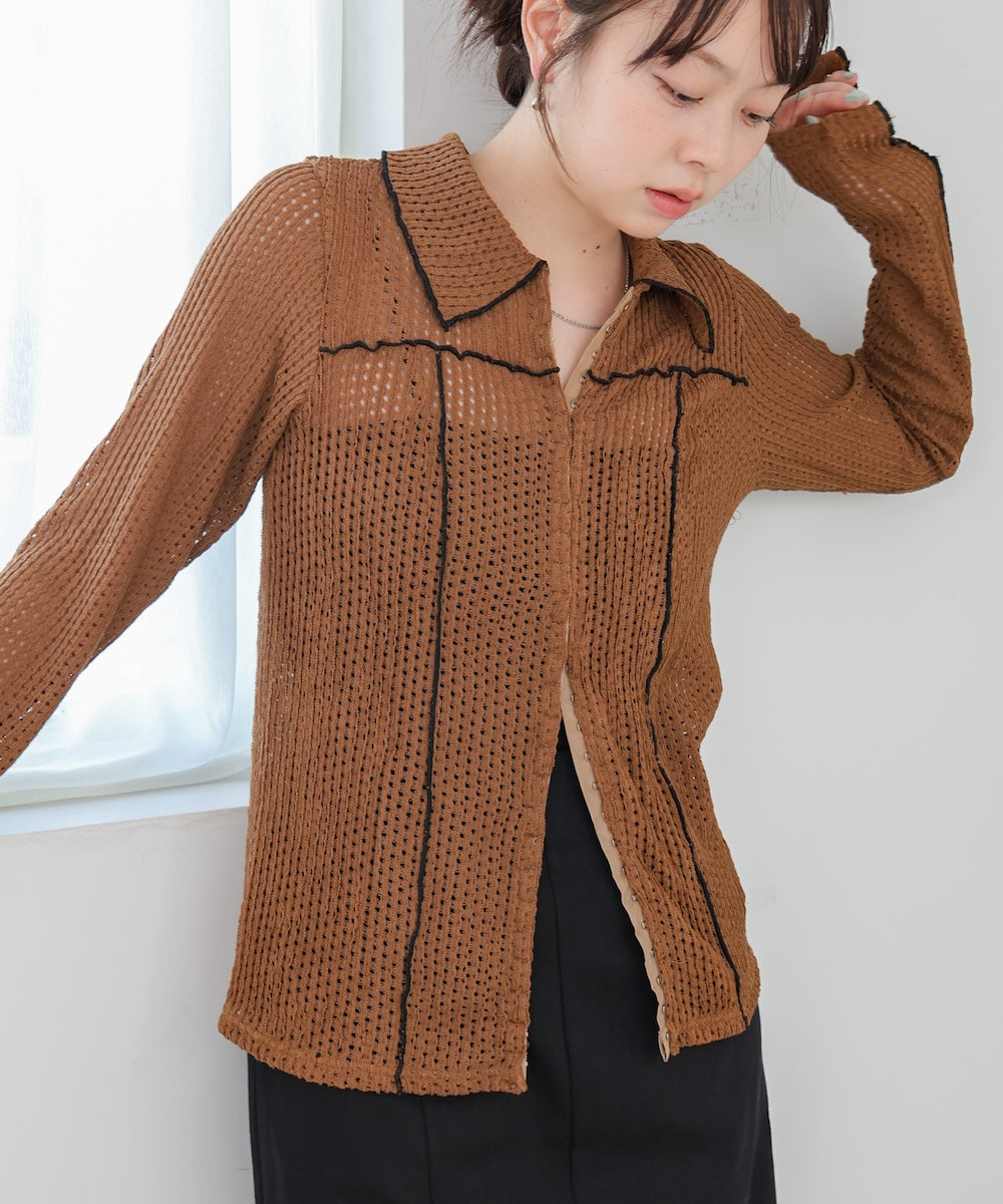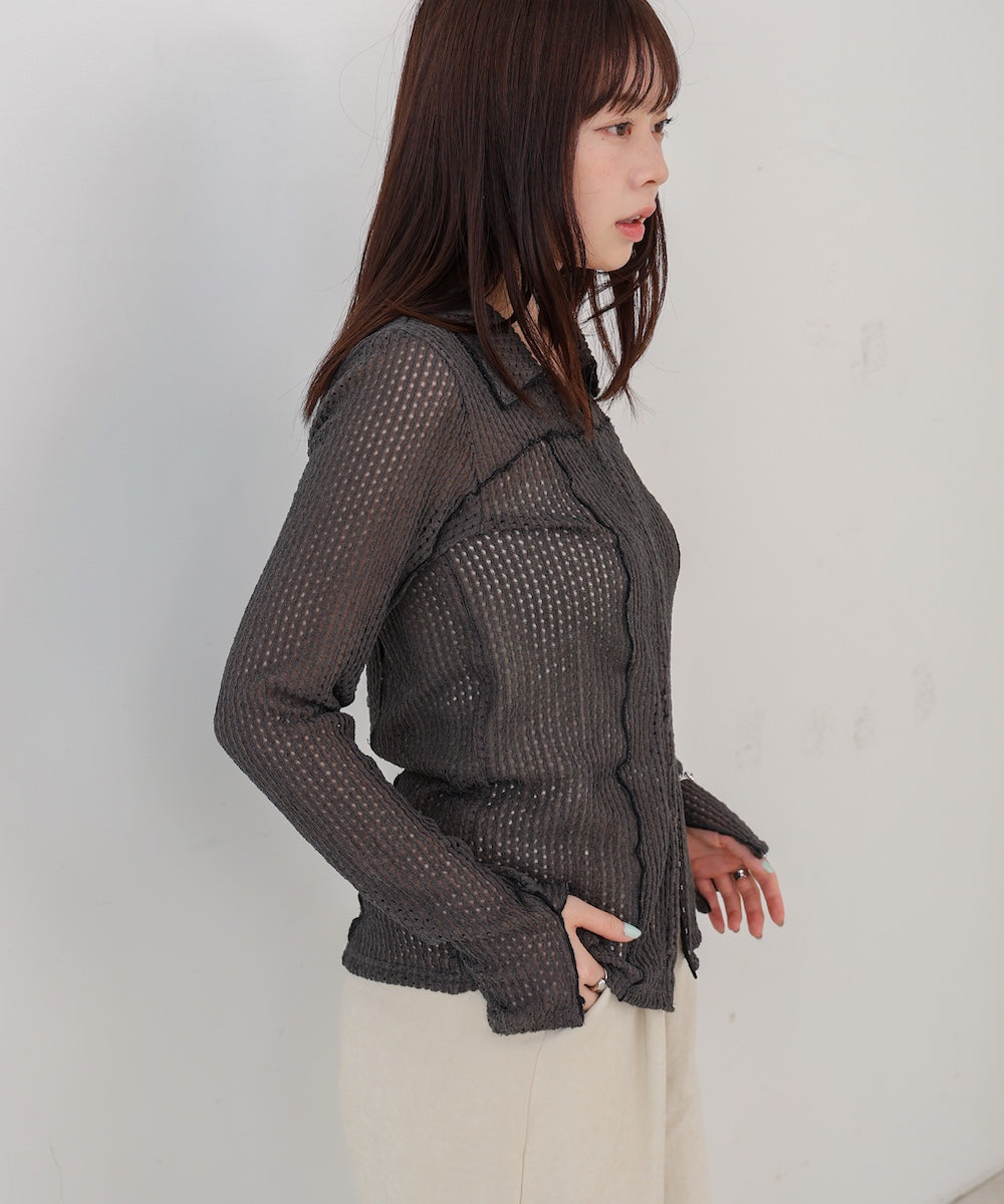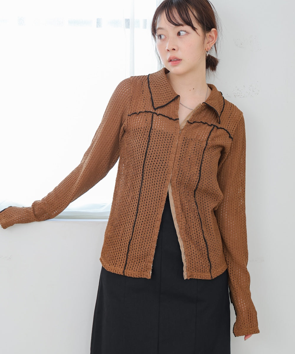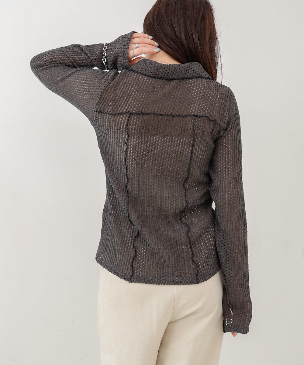 全体的に施されたトレンドライクなウェーブメロウがポイントのトップスになっています。さらに、チャックやボタンではなくあえてホックにすることで一癖あるデザインになっています。Iラインが強調されるシルエットになるのでスタイルアップしたコーディングになります。