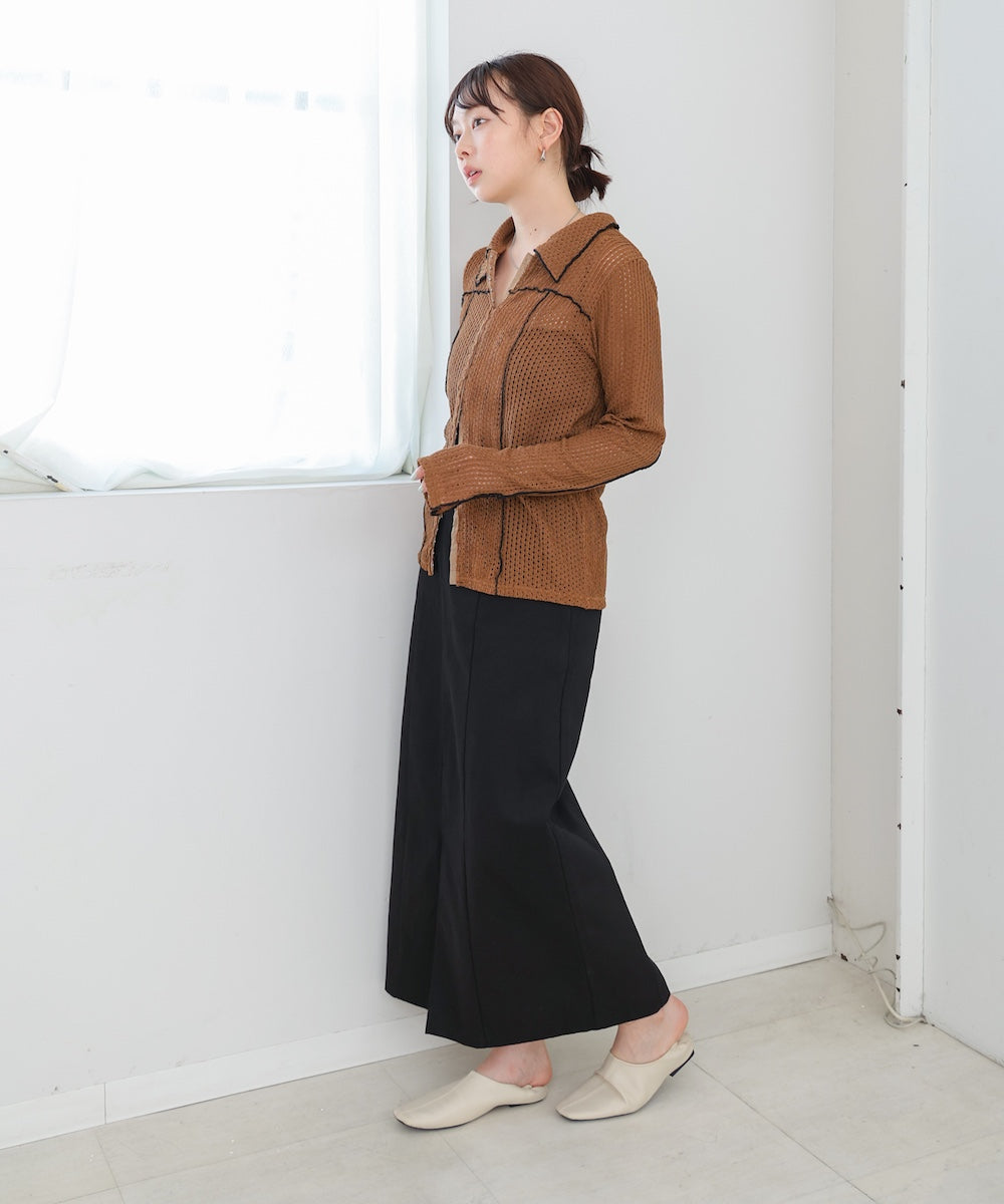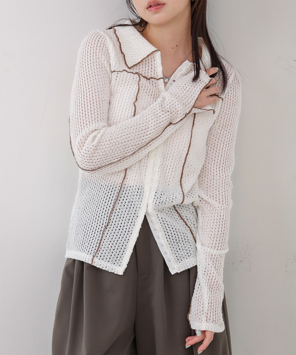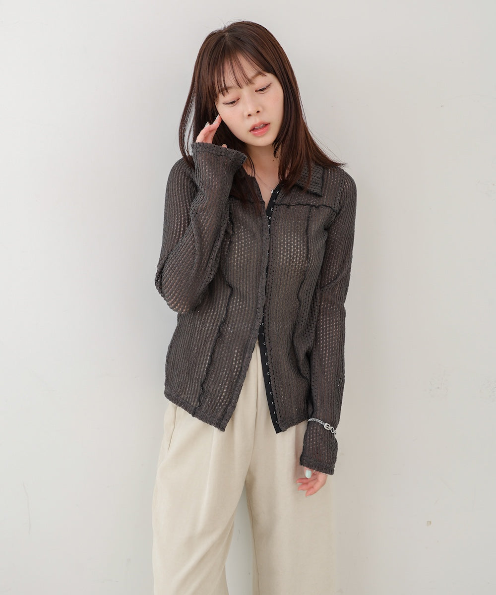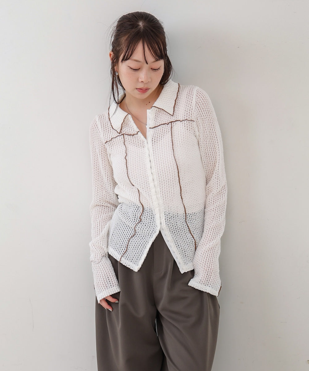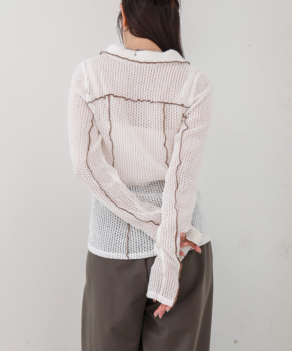 全体的に施されたトレンドライクなウェーブメロウがポイントのトップスになっています。さらに、チャックやボタンではなくあえてホックにすることで一癖あるデザインになっています。Iラインが強調されるシルエットになるのでスタイルアップしたコーディングになります。