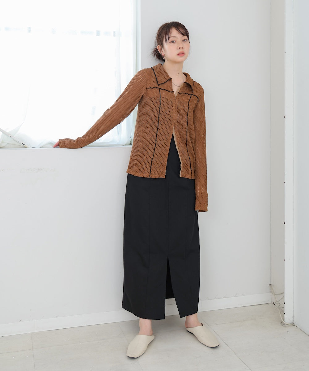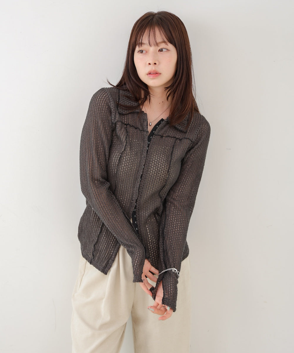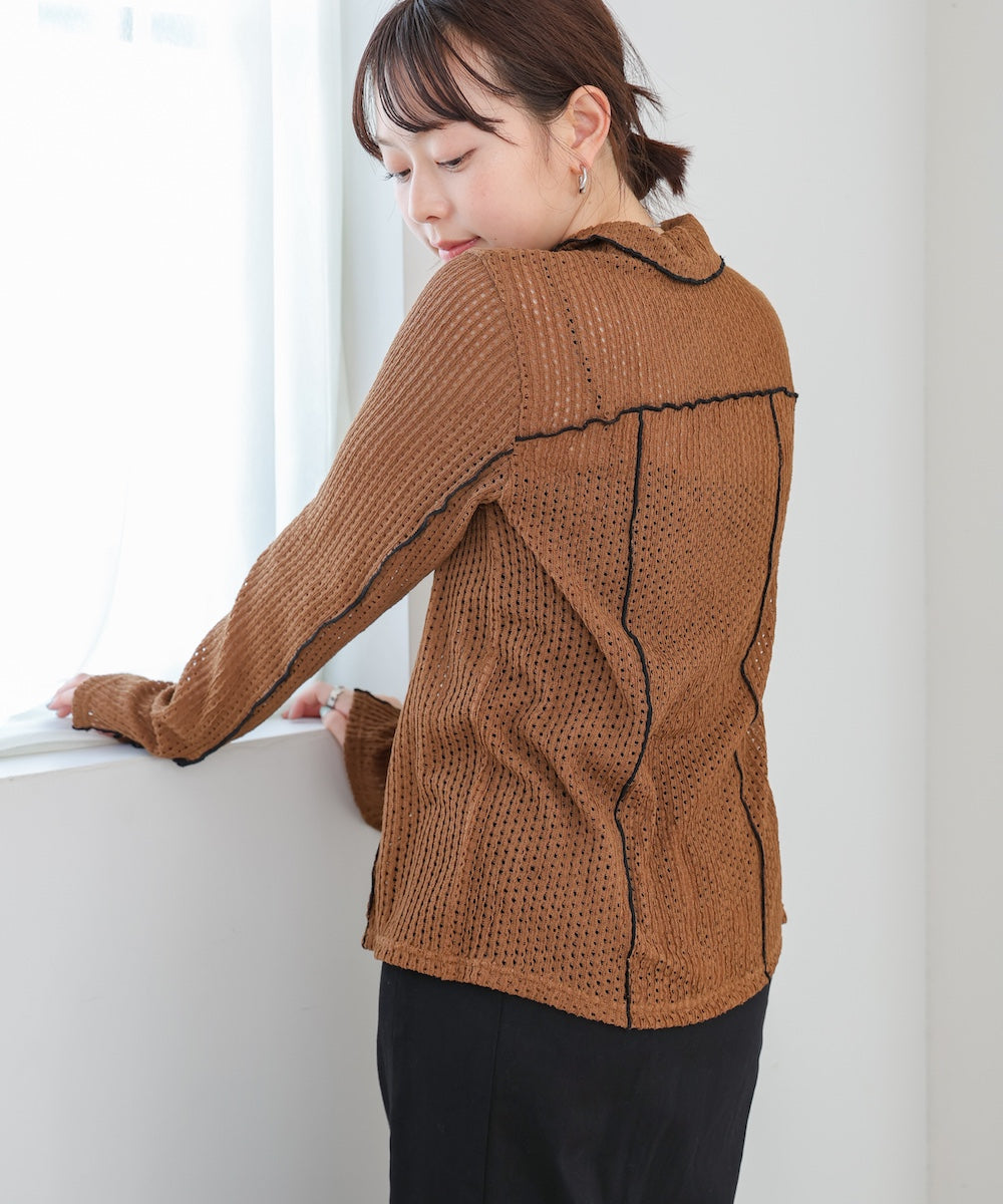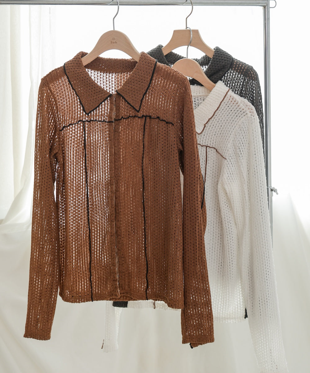 全体的に施されたトレンドライクなウェーブメロウがポイントのトップスになっています。さらに、チャックやボタンではなくあえてホックにすることで一癖あるデザインになっています。Iラインが強調されるシルエットになるのでスタイルアップしたコーディングになります。