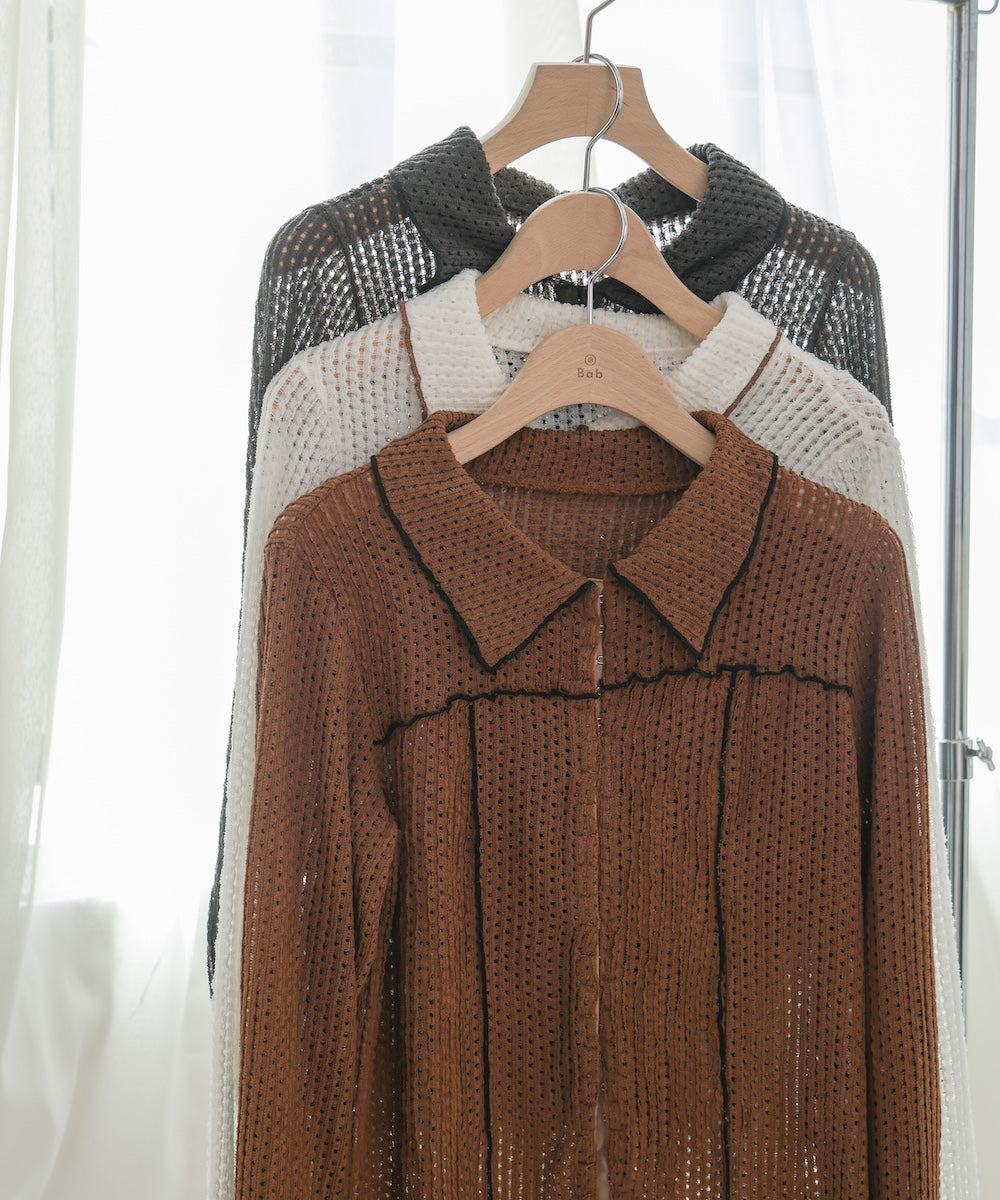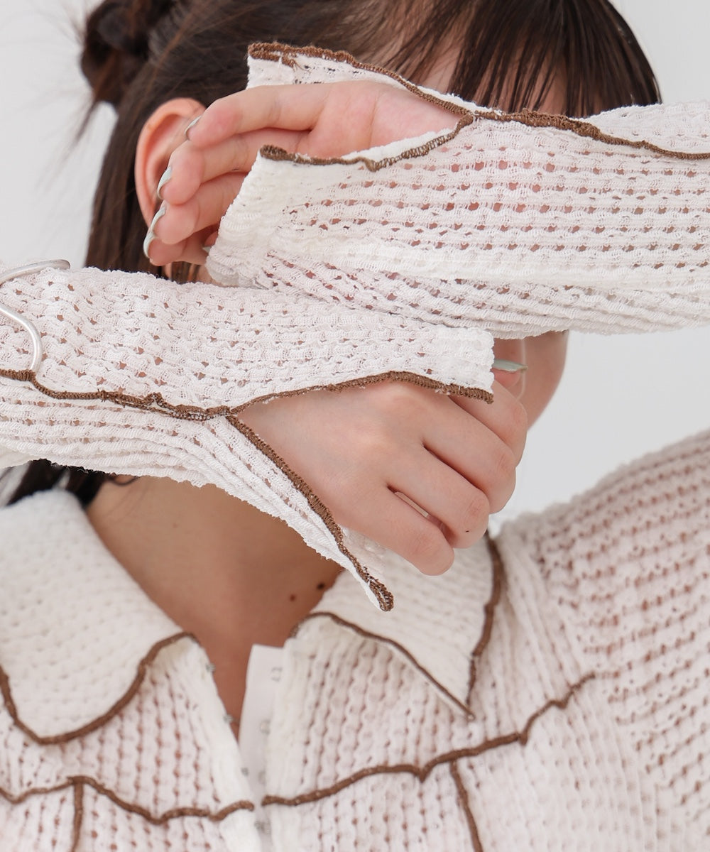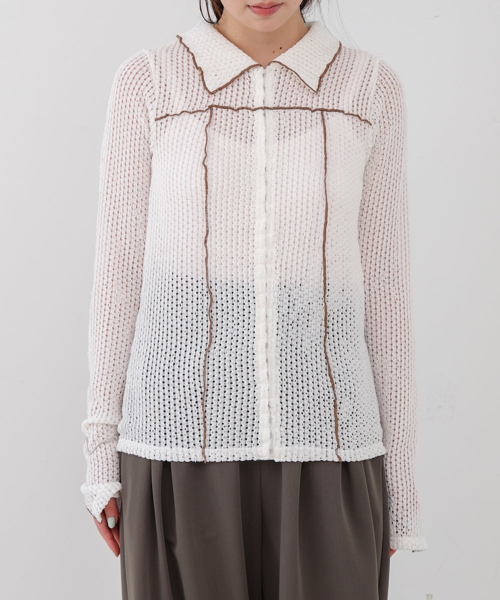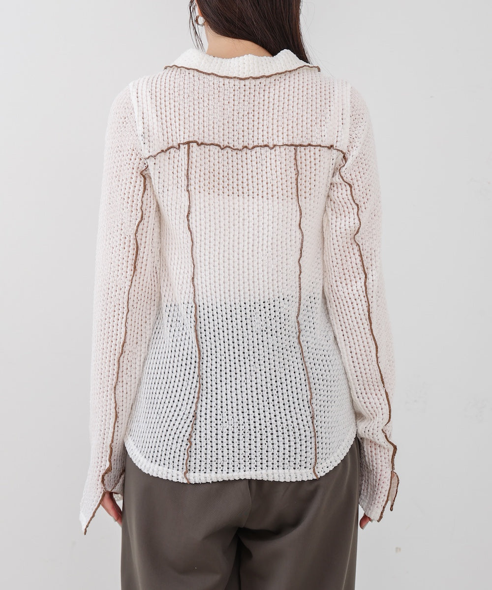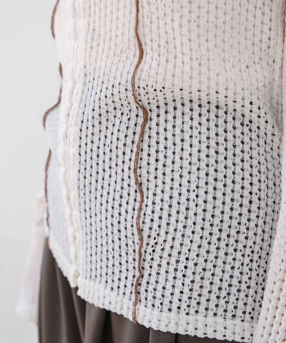 全体的に施されたトレンドライクなウェーブメロウがポイントのトップスになっています。さらに、チャックやボタンではなくあえてホックにすることで一癖あるデザインになっています。Iラインが強調されるシルエットになるのでスタイルアップしたコーディングになります。