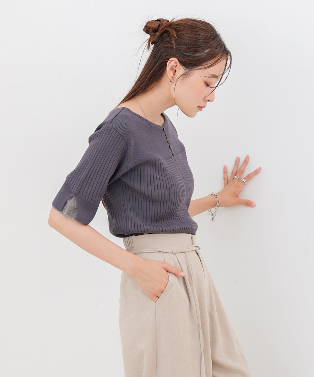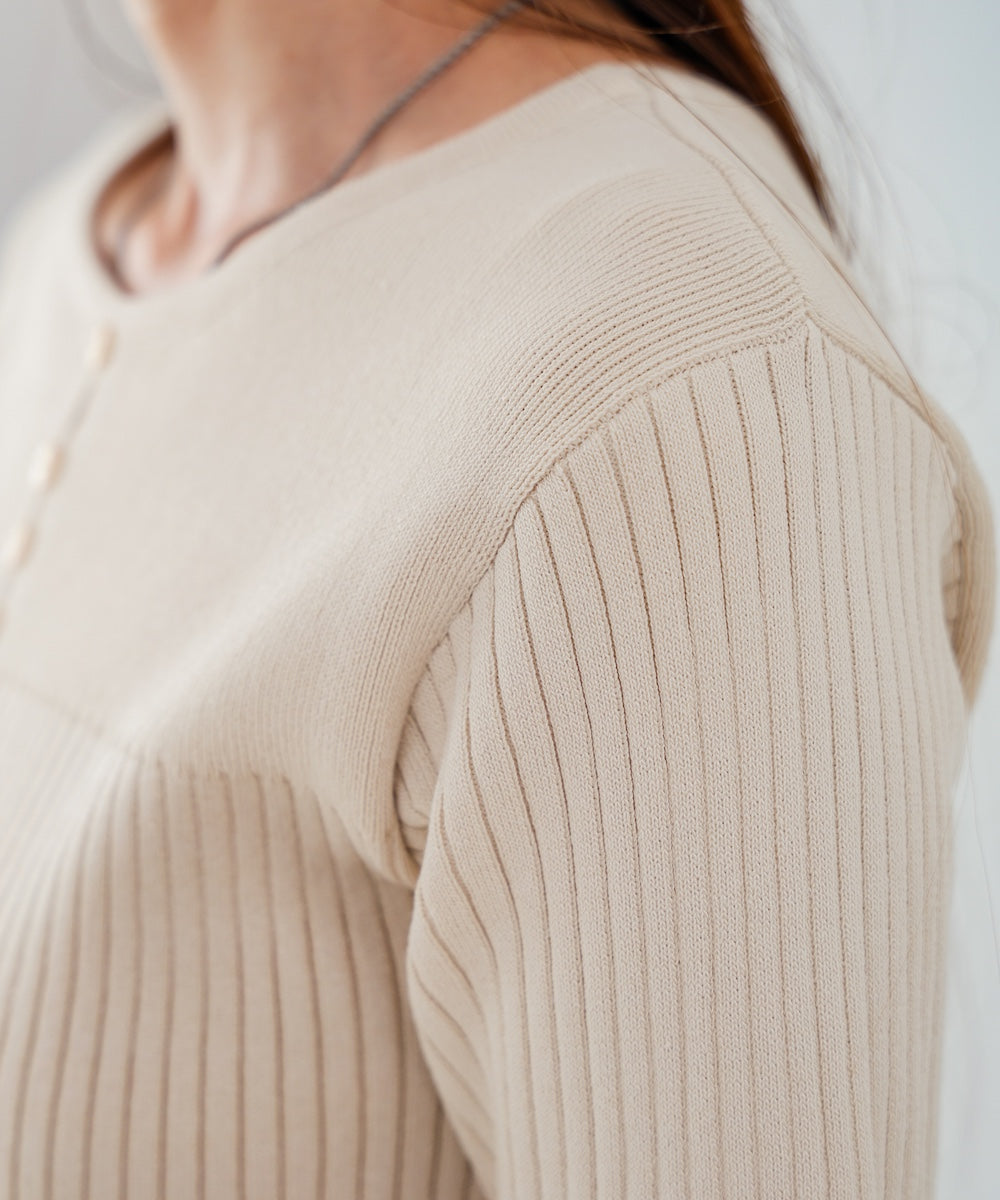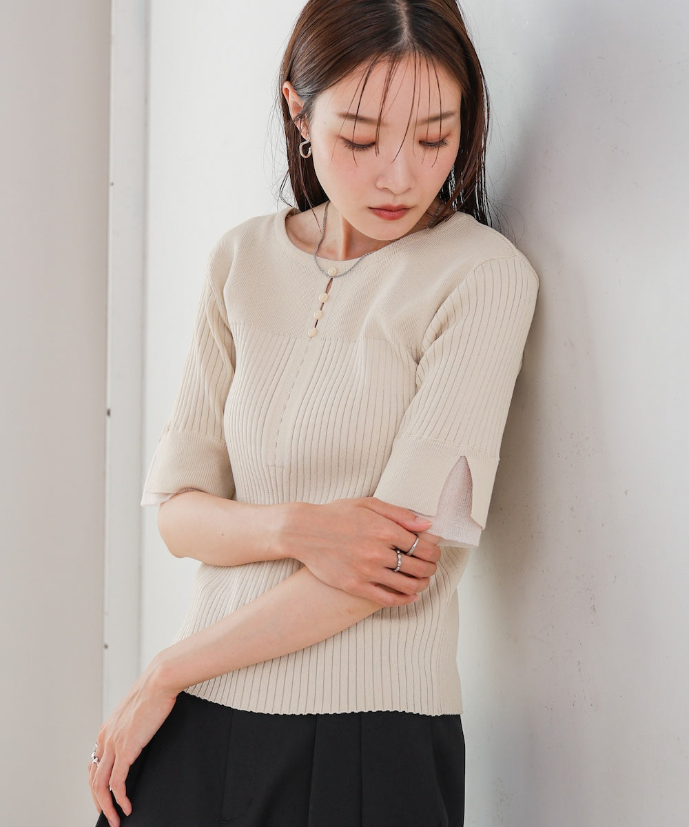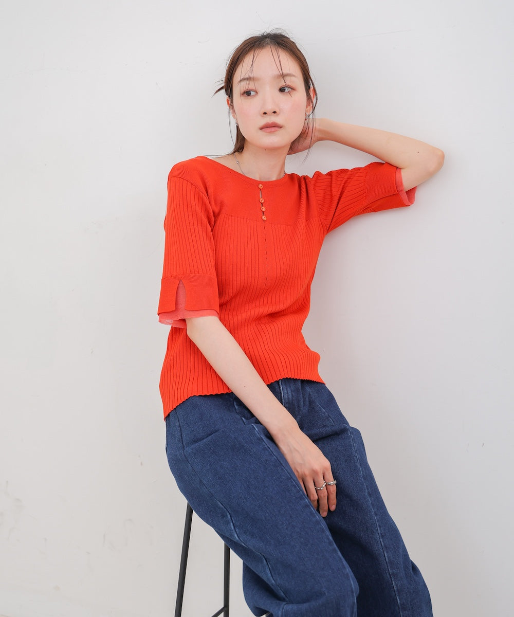 胸元のボタンデザインが上品なアクセントになり、スリット入りの袖がさりげない抜け感を演出。リブ×フラットの編地切り替えが立体感のあるシルエットを作り、ベーシックから差し色まで楽しめる4色展開で着回し力も抜群です。
