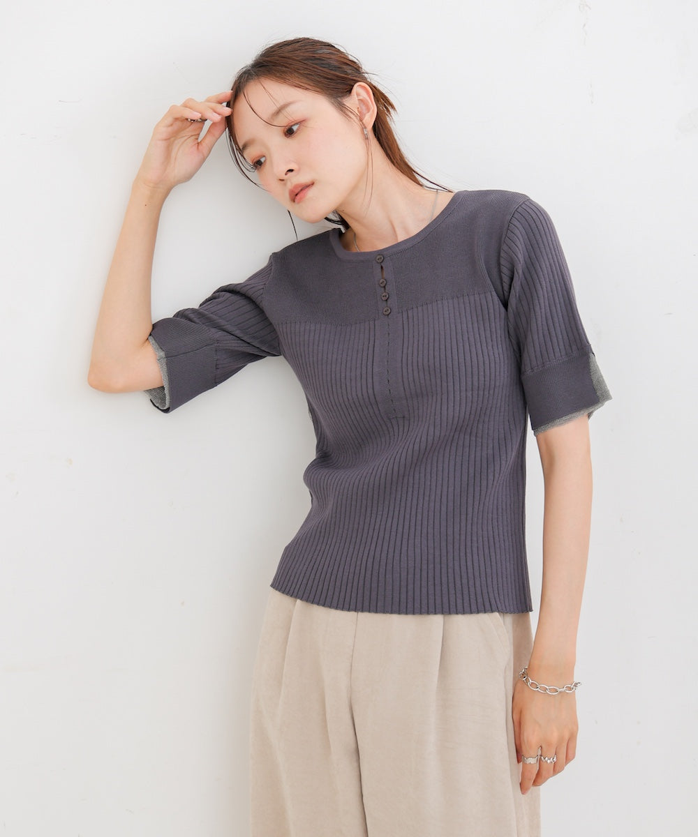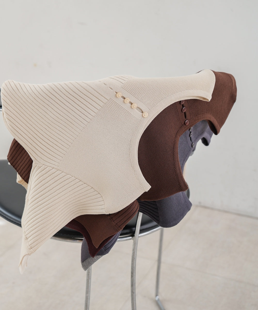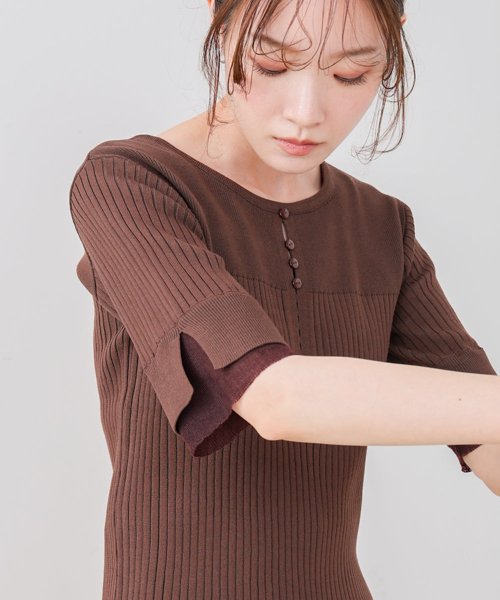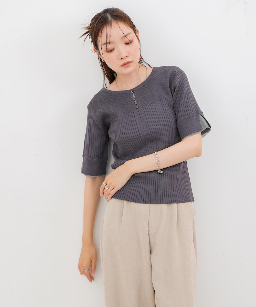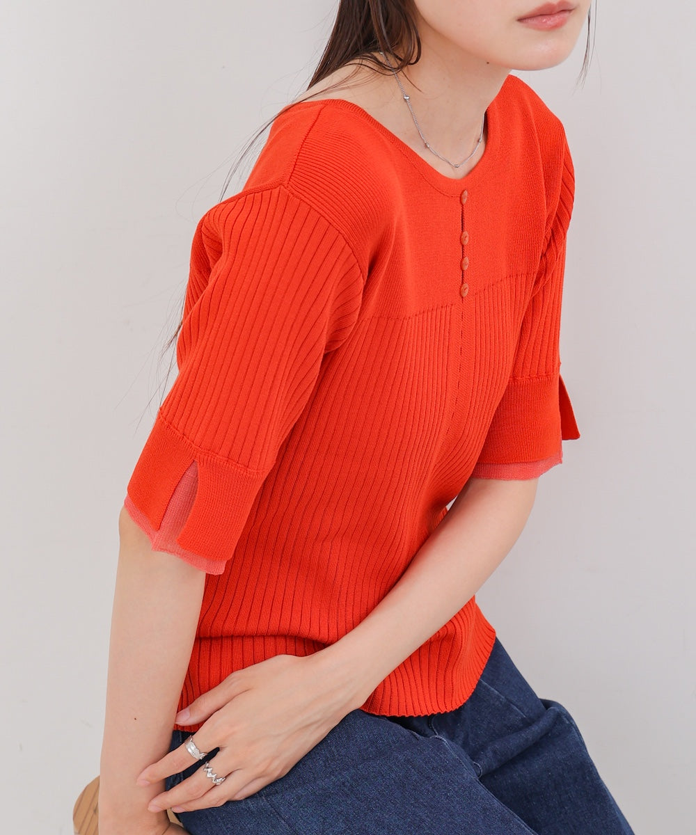 胸元のボタンデザインが上品なアクセントになり、スリット入りの袖がさりげない抜け感を演出。リブ×フラットの編地切り替えが立体感のあるシルエットを作り、ベーシックから差し色まで楽しめる4色展開で着回し力も抜群です。