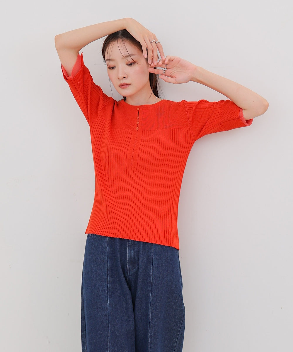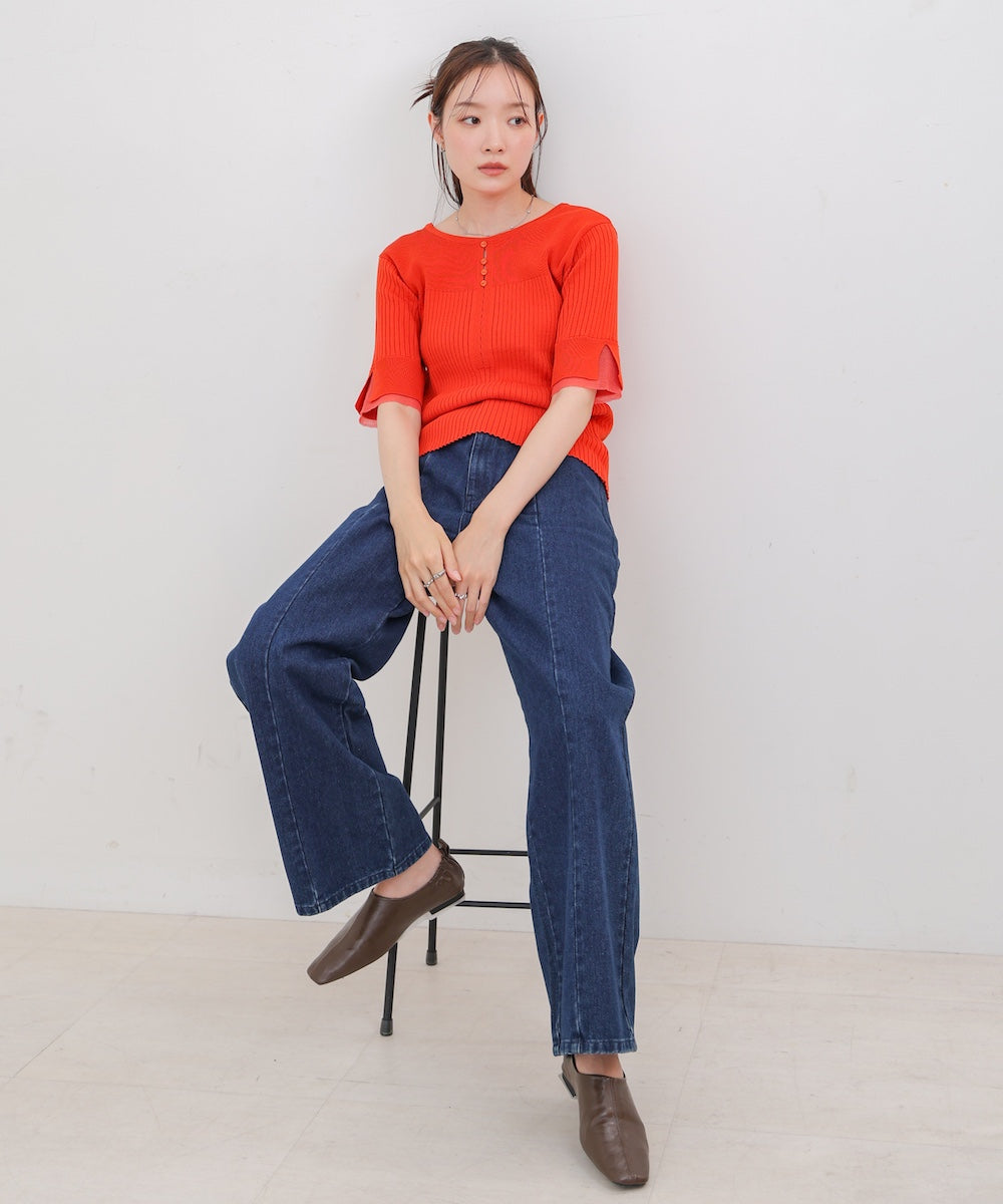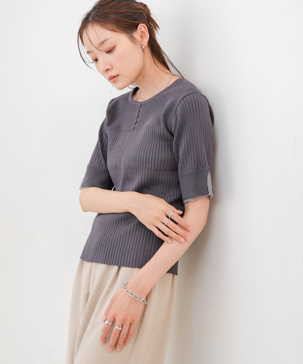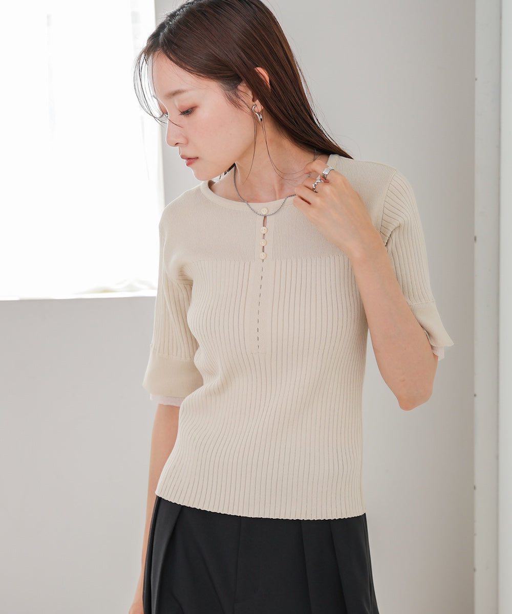 胸元のボタンデザインが上品なアクセントになり、スリット入りの袖がさりげない抜け感を演出。リブ×フラットの編地切り替えが立体感のあるシルエットを作り、ベーシックから差し色まで楽しめる4色展開で着回し力も抜群です。