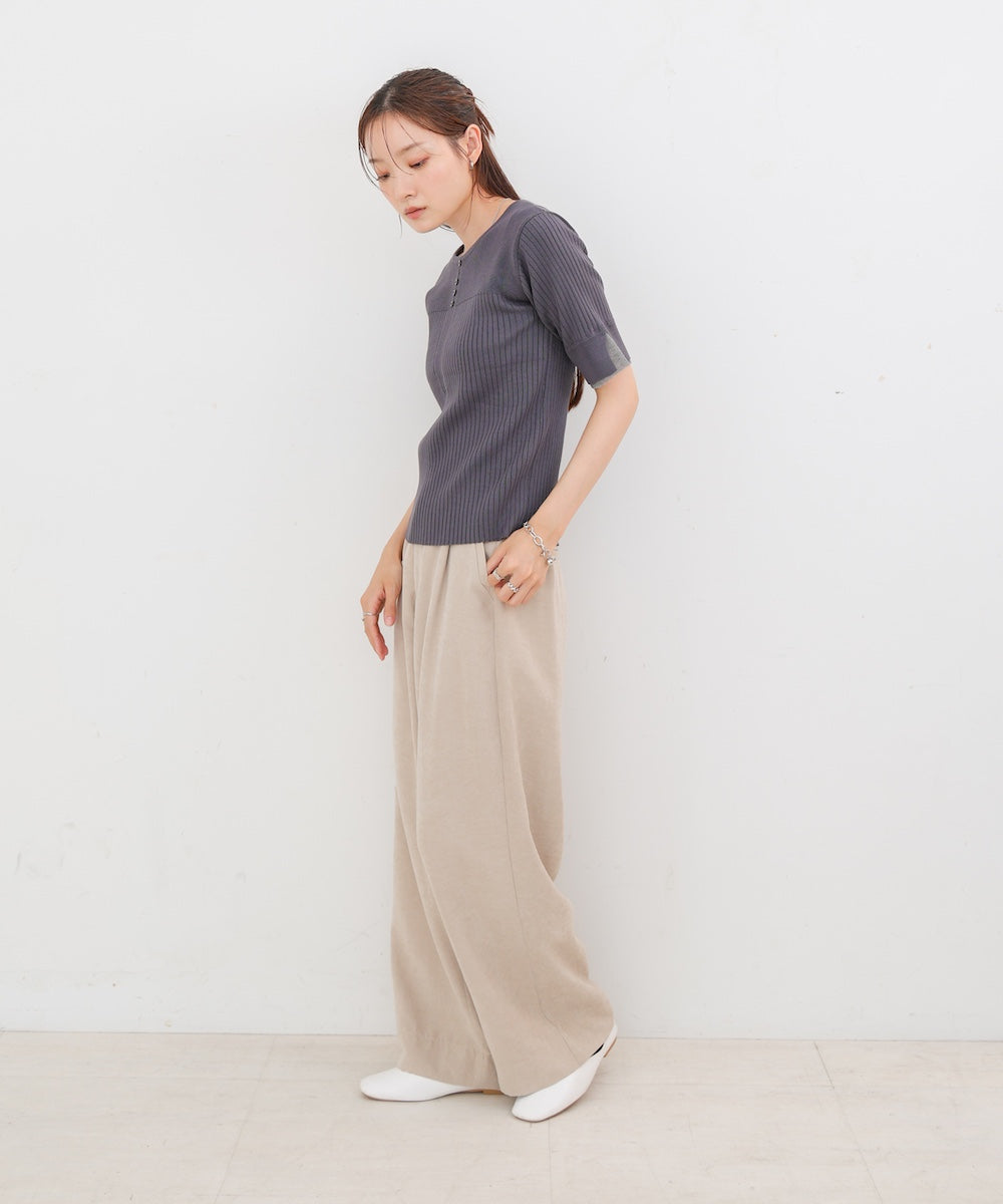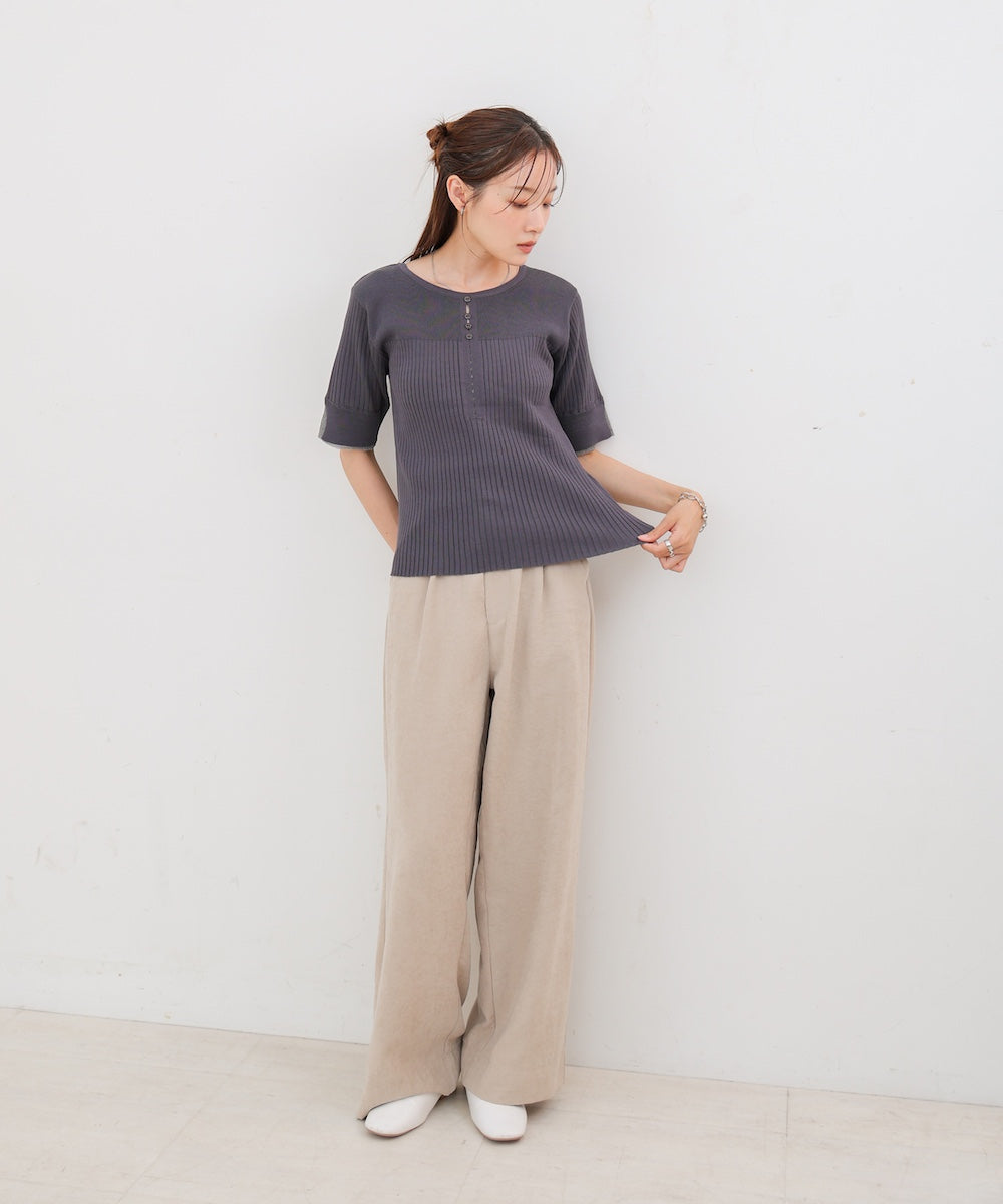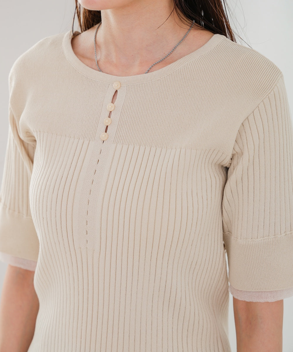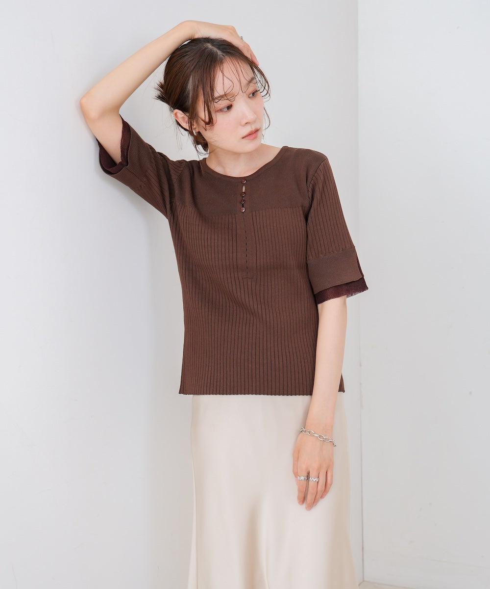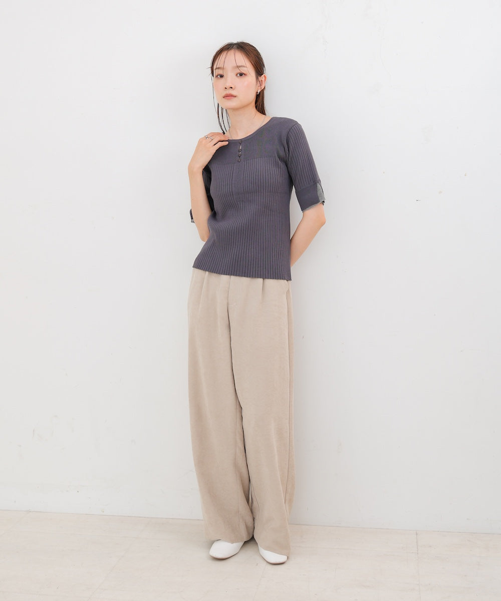 胸元のボタンデザインが上品なアクセントになり、スリット入りの袖がさりげない抜け感を演出。リブ×フラットの編地切り替えが立体感のあるシルエットを作り、ベーシックから差し色まで楽しめる4色展開で着回し力も抜群です。