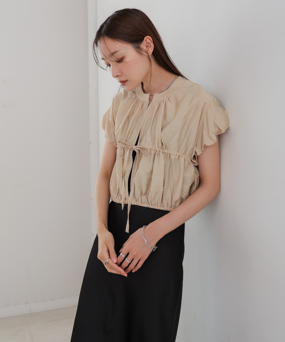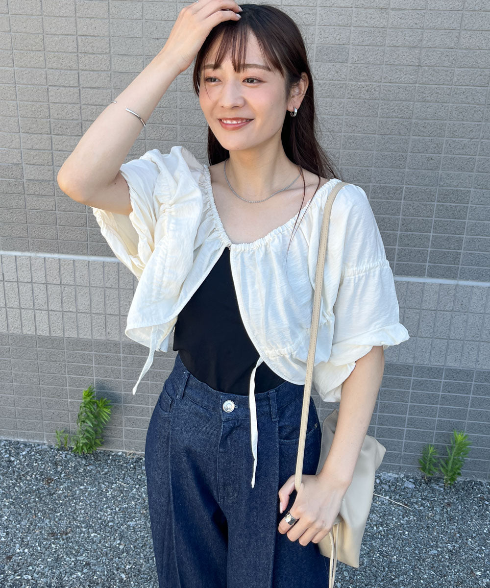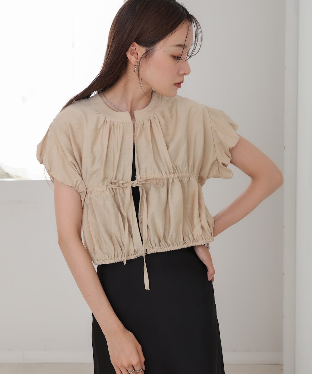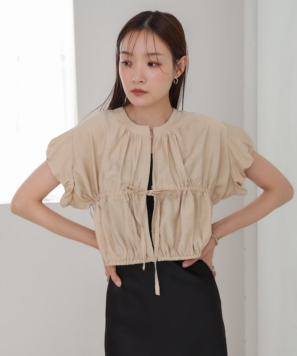羽織としてもベストとしても使える万能アイテムの登場です!電車の中や会社の中など室内で寒さを感じるときに羽織として使うのにちょうど良い厚さと生地感になっています。中央部分にギャザーが集まっていてウエスト部分が絞れるのもポイントです。袖の部分はふわっとしていて広がりすぎないバルーン袖になっていて、トレンドライクな形になっています。1枚でベストの役割にもなるので、1枚二役で今の季節に大活躍間違いなしです!
