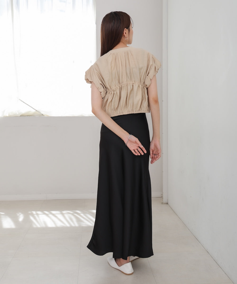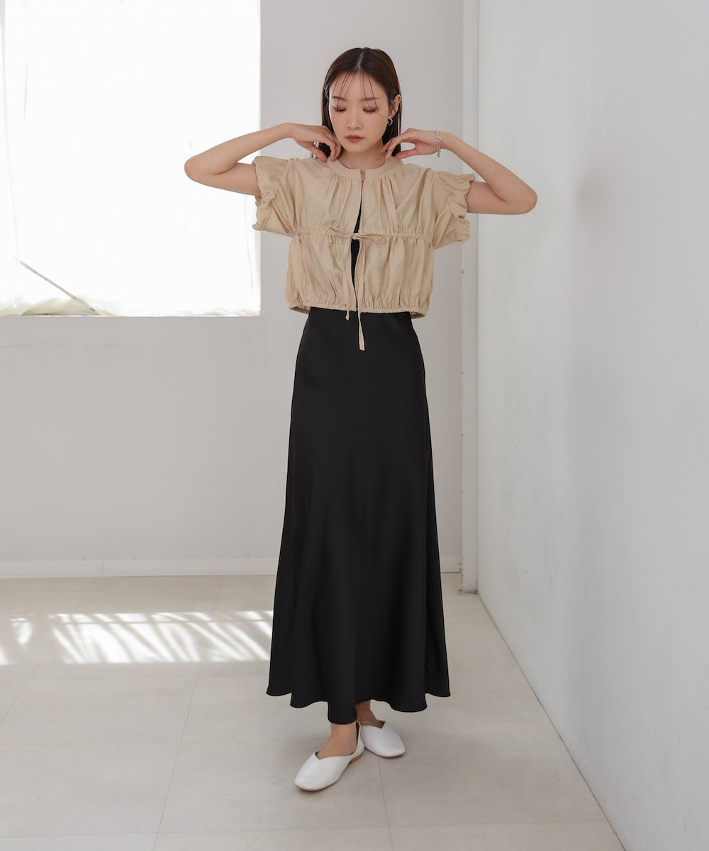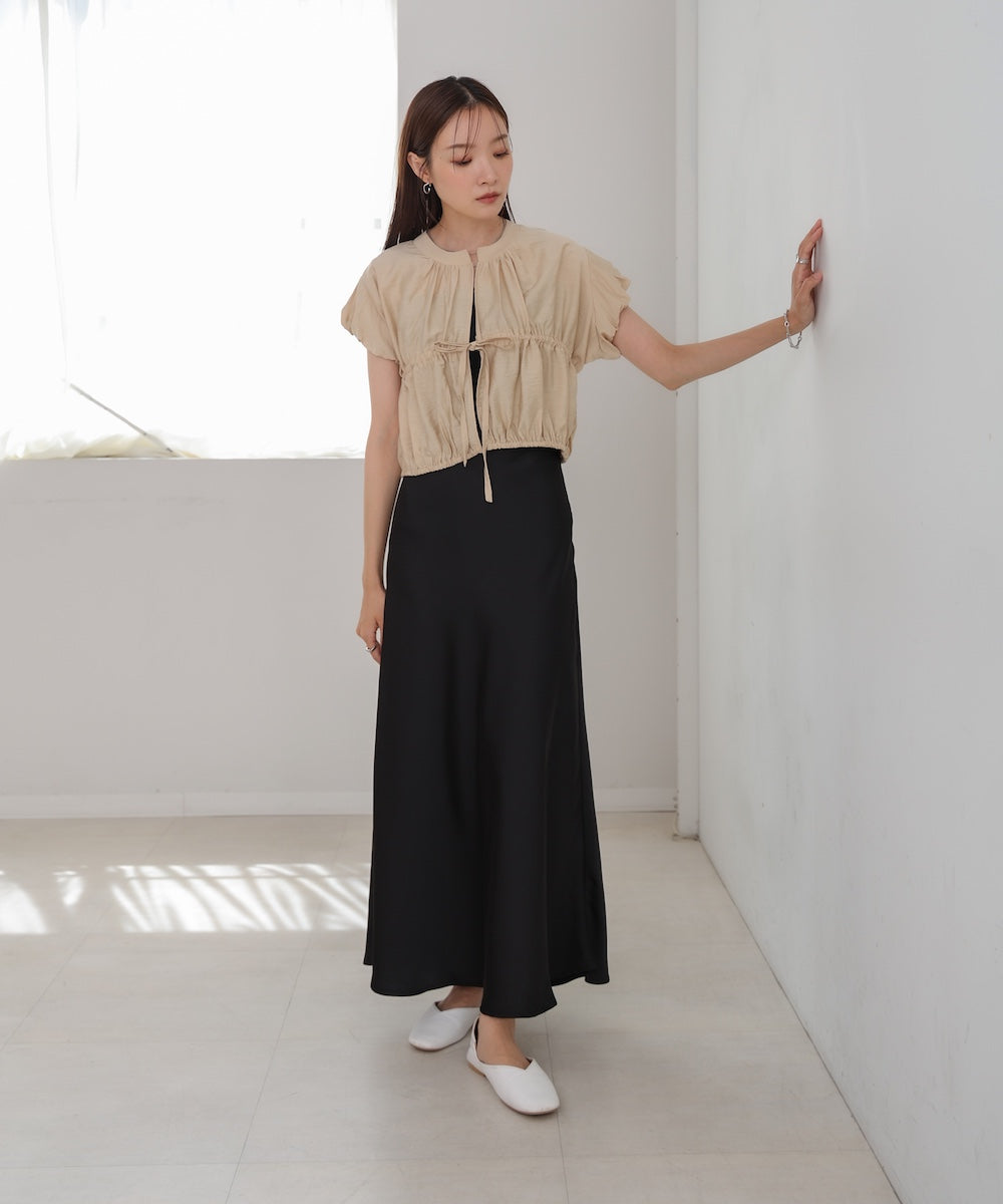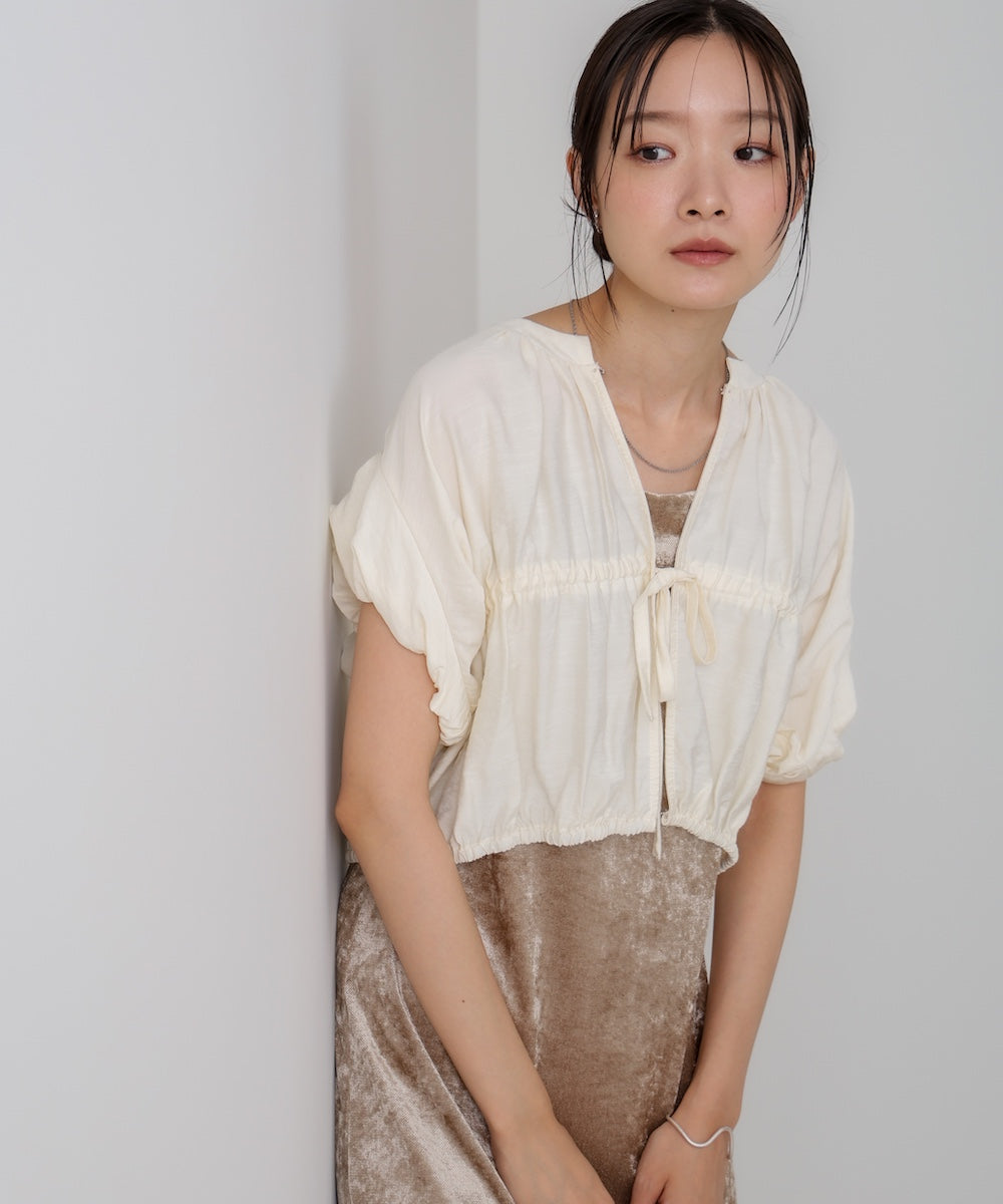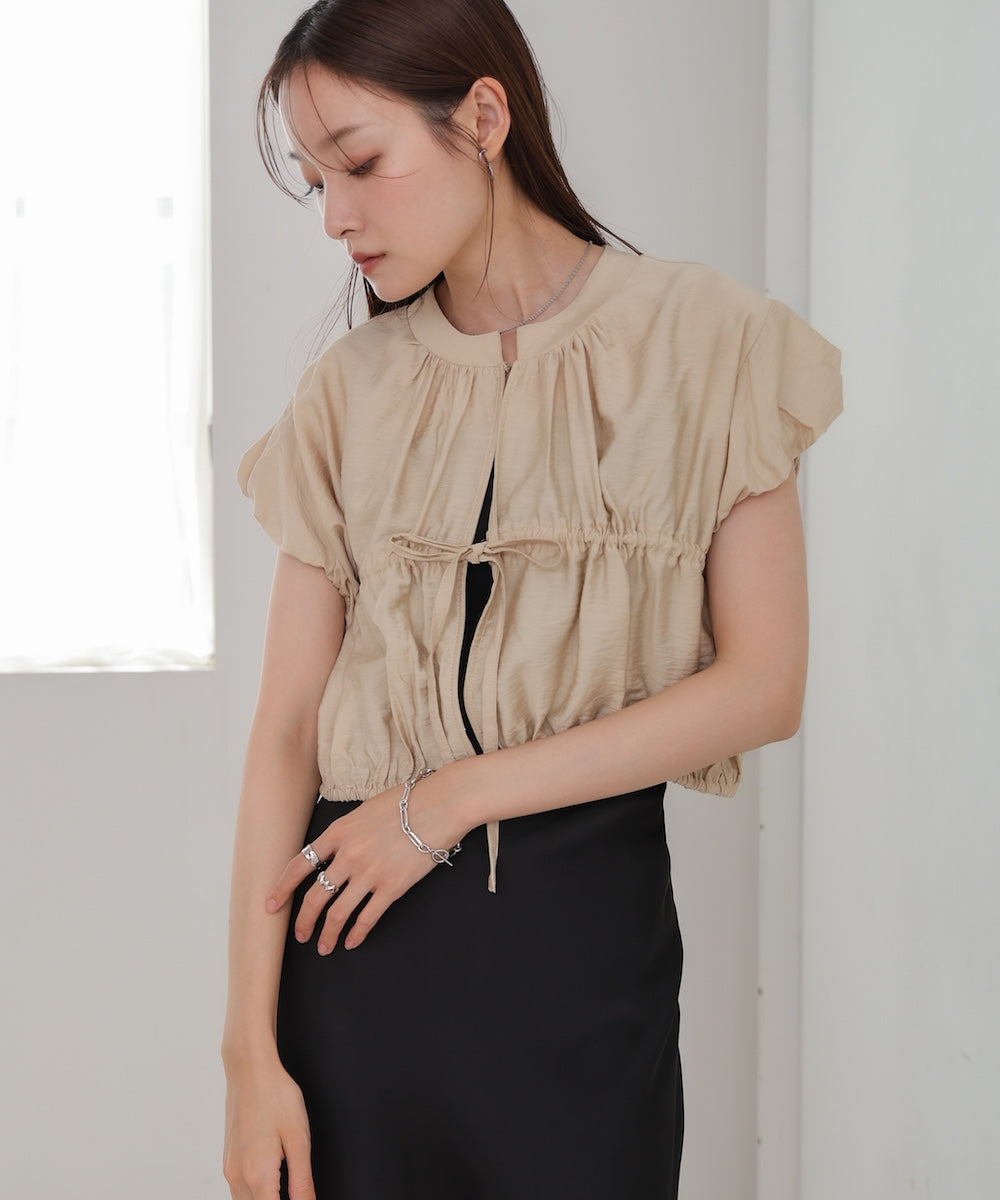 羽織としてもベストとしても使える万能アイテムの登場です!電車の中や会社の中など室内で寒さを感じるときに羽織として使うのにちょうど良い厚さと生地感になっています。中央部分にギャザーが集まっていてウエスト部分が絞れるのもポイントです。袖の部分はふわっとしていて広がりすぎないバルーン袖になっていて、トレンドライクな形になっています。1枚でベストの役割にもなるので、1枚二役で今の季節に大活躍間違いなしです!