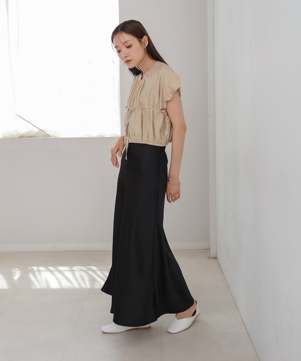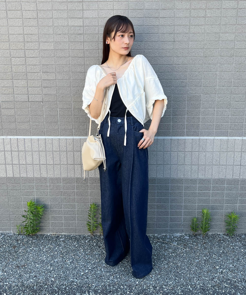 ワンピースの上に重ねるとベストがショート丈なのでスタイルアップして見えます。デニムと合わせてもベストが1枚で主役級になるのでカジュアルフェミニンなスタイリングになります!