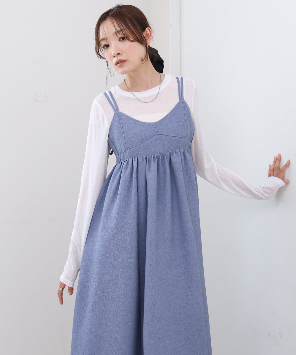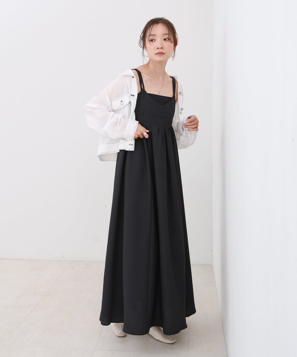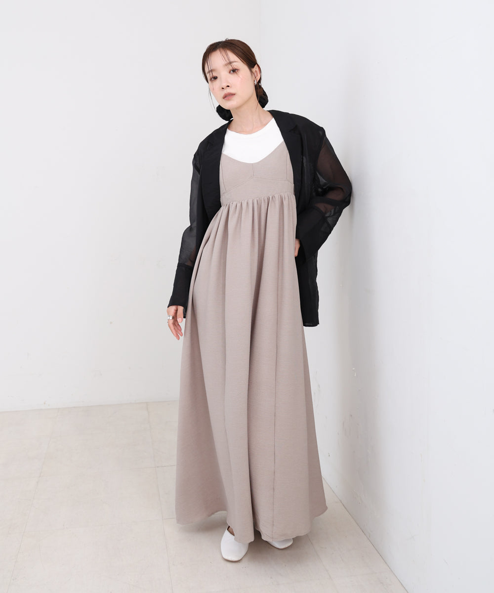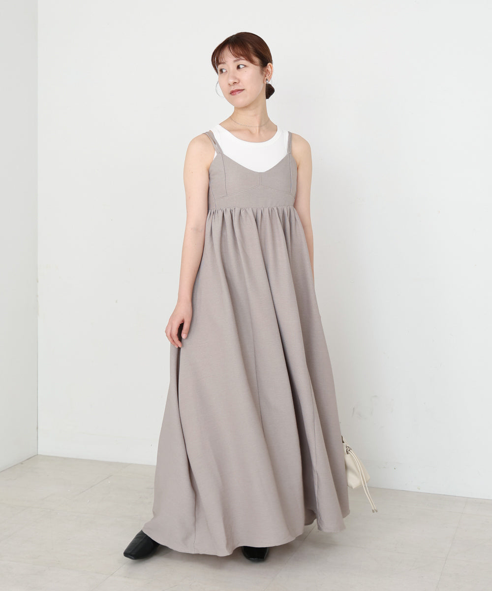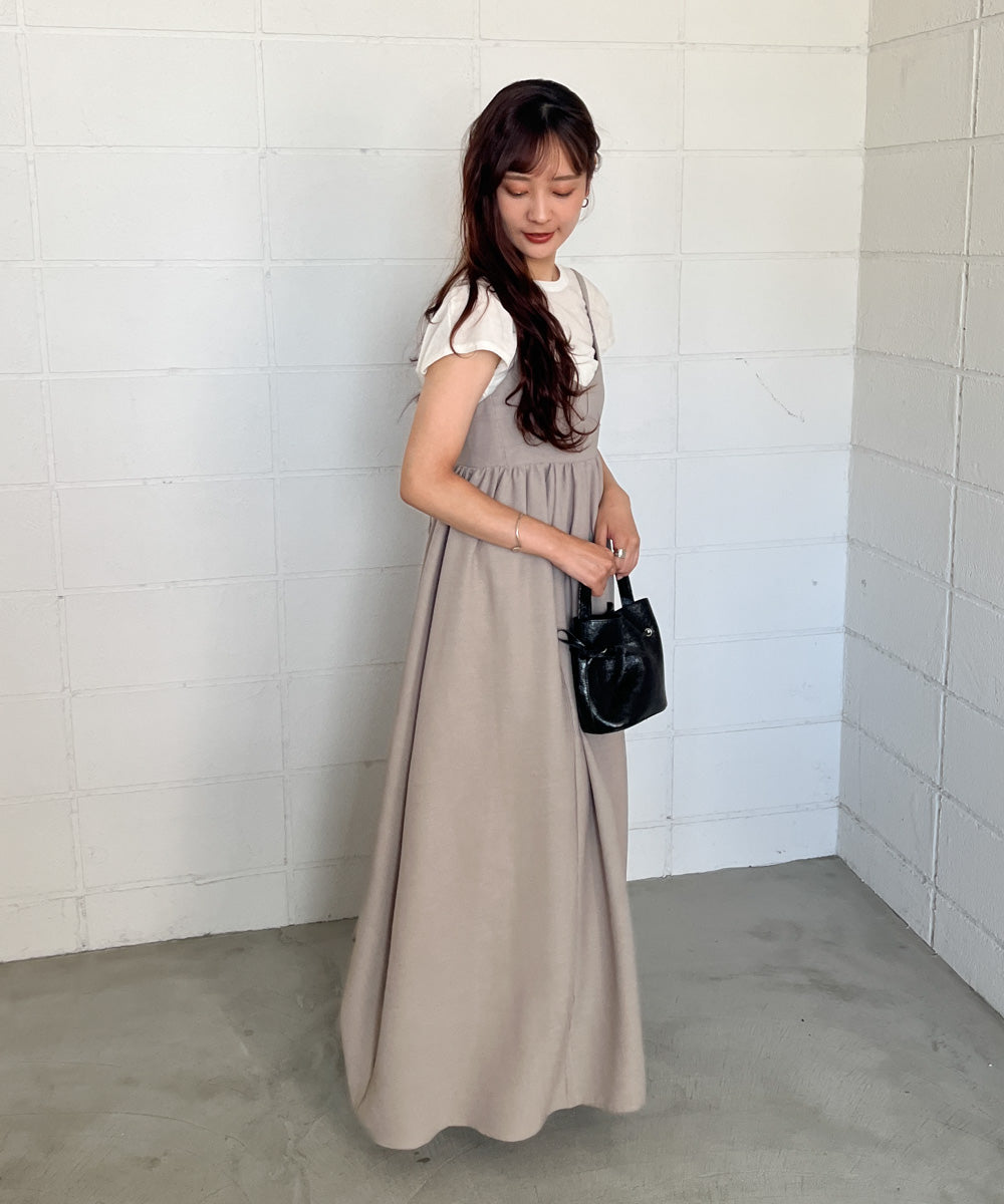 胸元部分からふわっと柔らかく広がるフレアキャミワンピが登場!まるでビスチェとフレアスカートが一枚になったようなフェミニン感あふれるワンピースです。夏から秋にかけてぴったりな硬すぎず薄すぎずな生地感に仕上がっています。上身頃後ろの部分はゴムになっているので着心地よくなっています。長袖のシアーカーディガンと合わせると夏から秋にかけての気温にぴったりなコーデが完成します。
