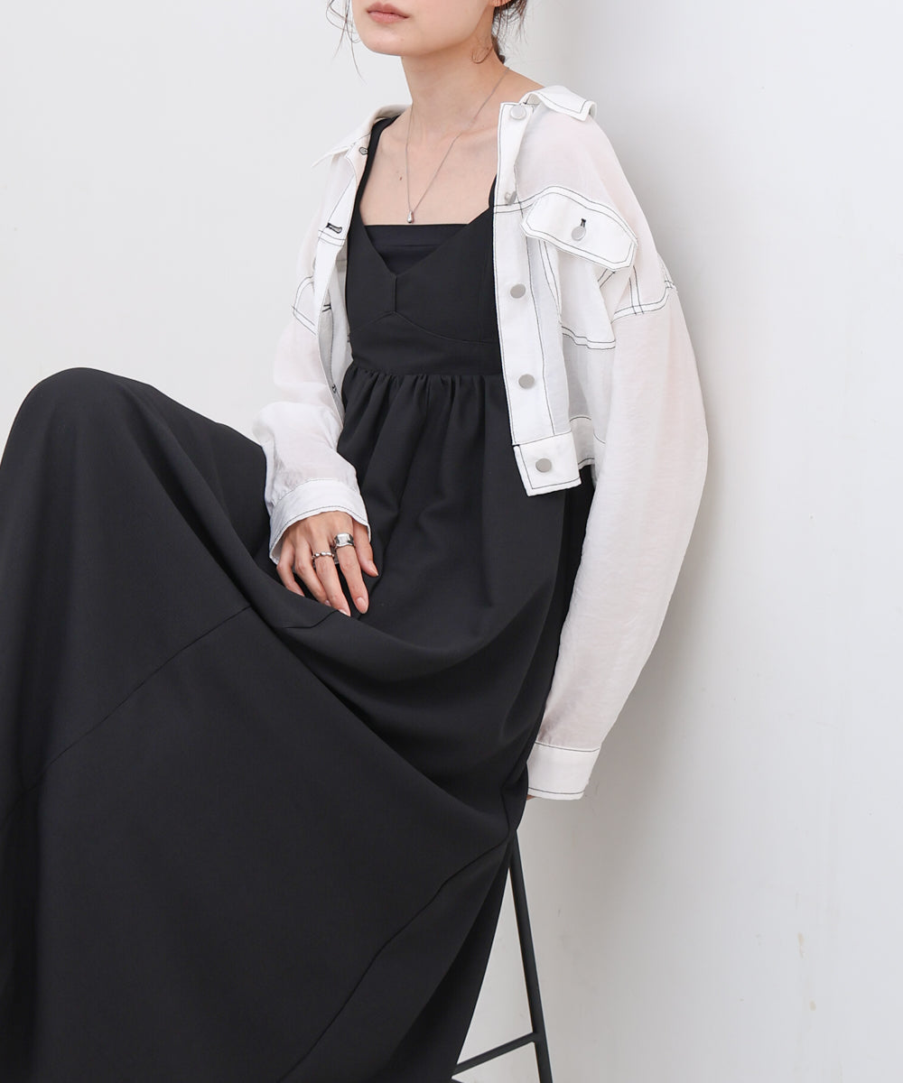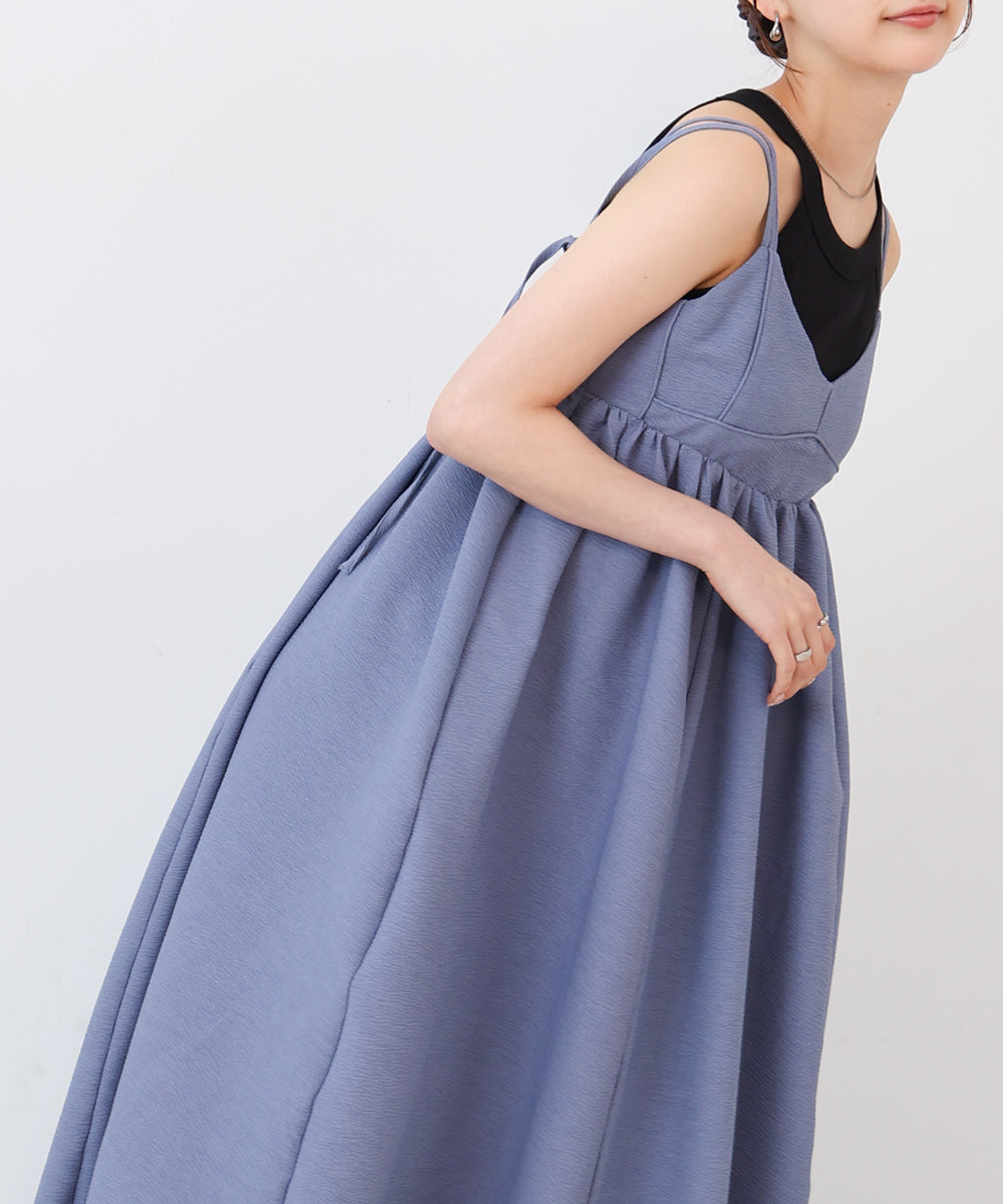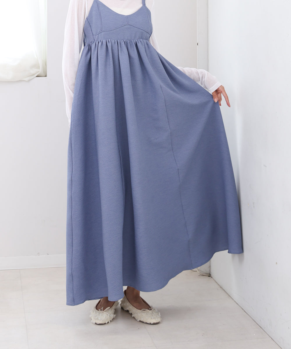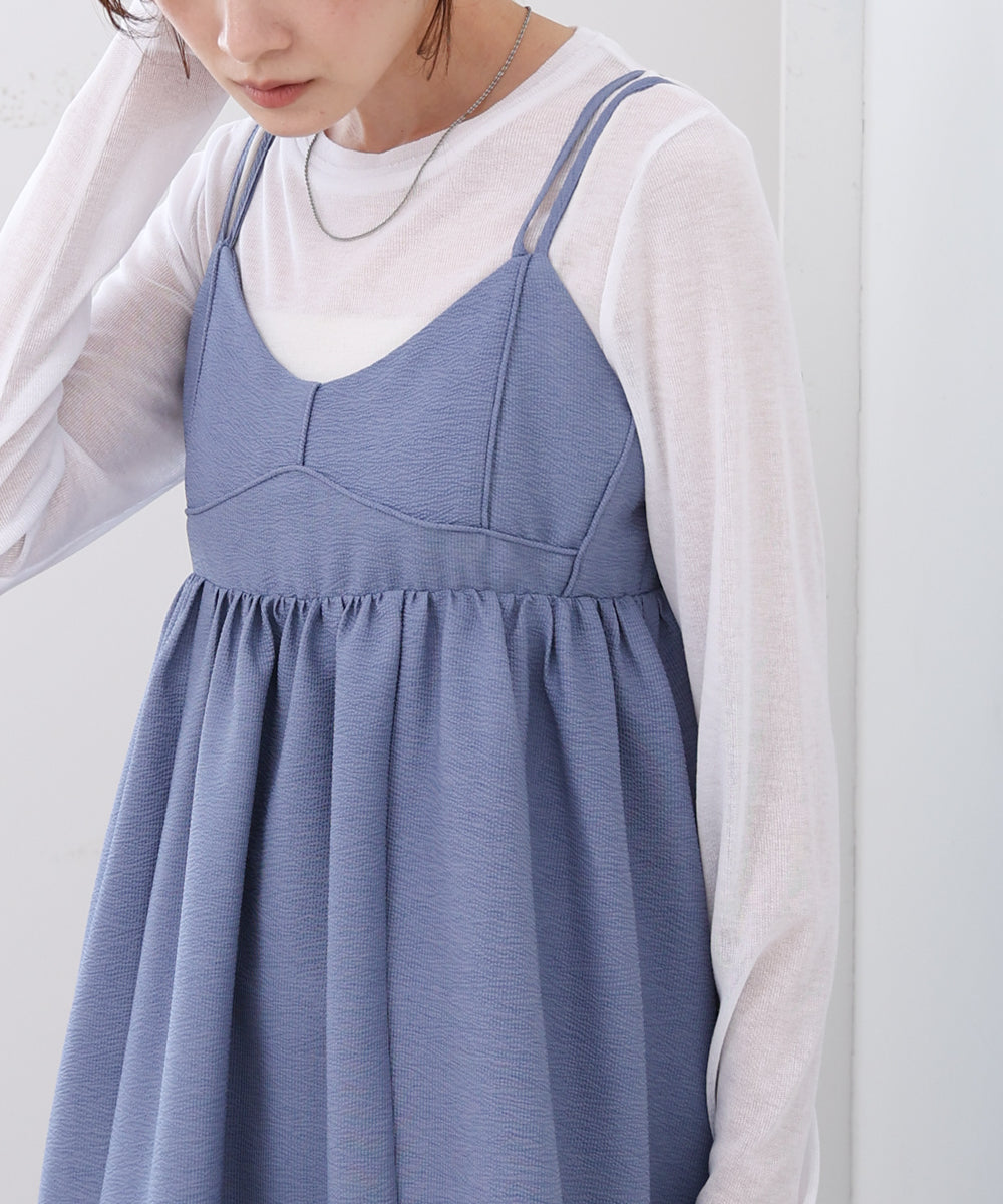 胸元部分からふわっと柔らかく広がるフレアキャミワンピが登場!まるでビスチェとフレアスカートが一枚になったようなフェミニン感あふれるワンピースです。夏から秋にかけてぴったりな硬すぎず薄すぎずな生地感に仕上がっています。上身頃後ろの部分はゴムになっているので着心地よくなっています。長袖のシアーカーディガンと合わせると夏から秋にかけての気温にぴったりなコーデが完成します。