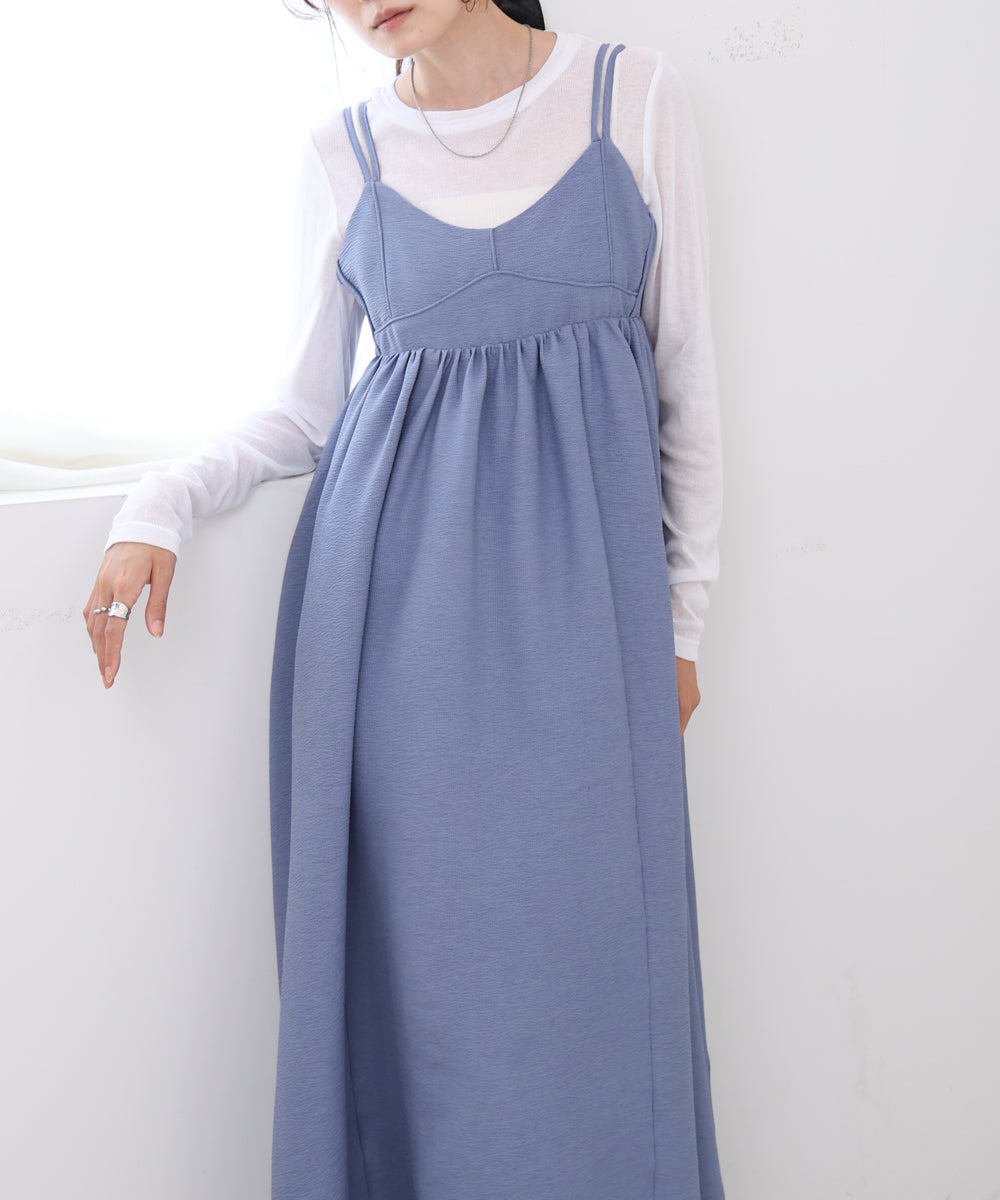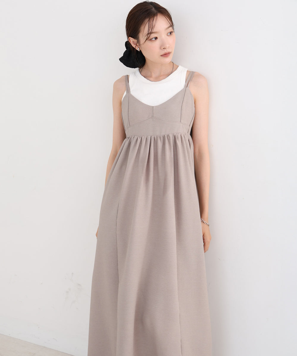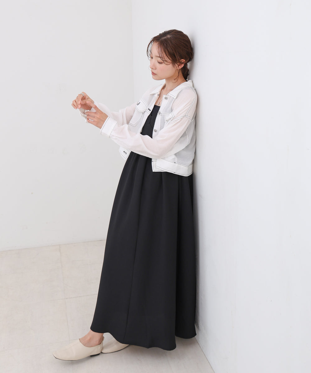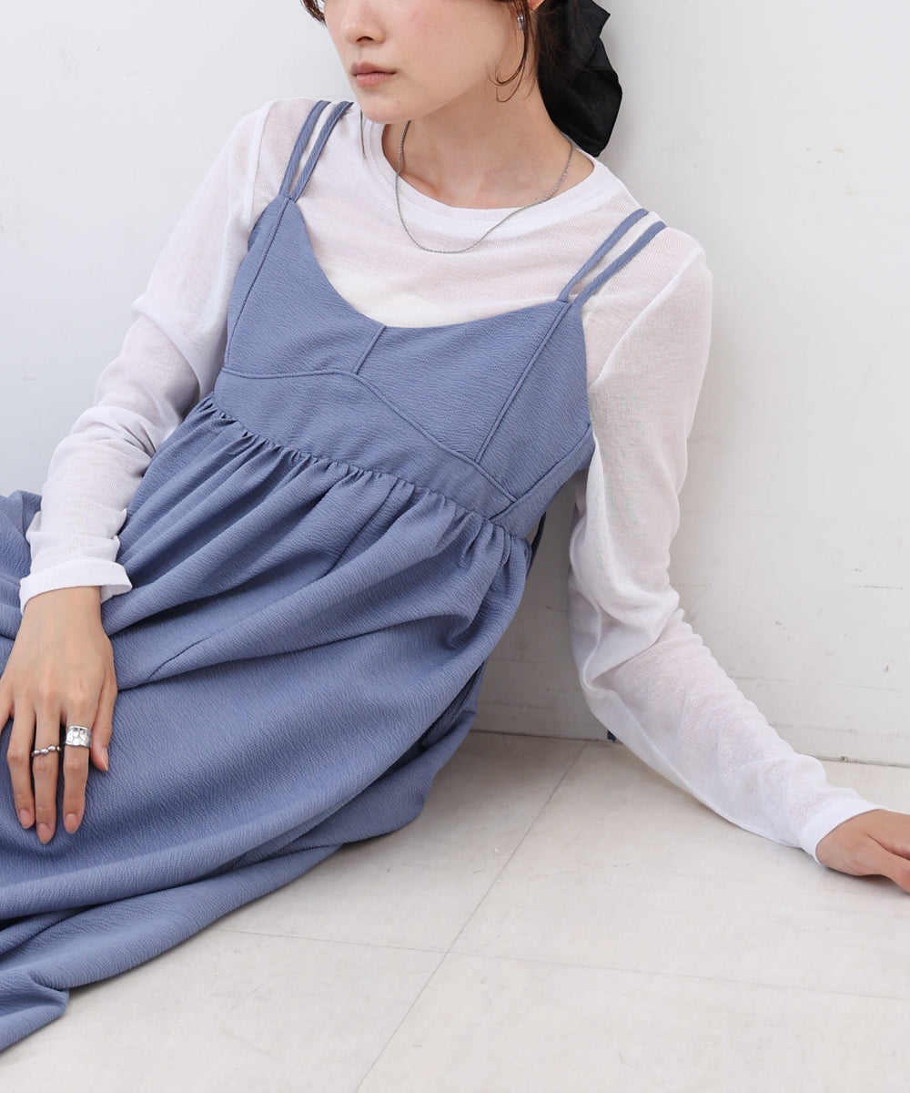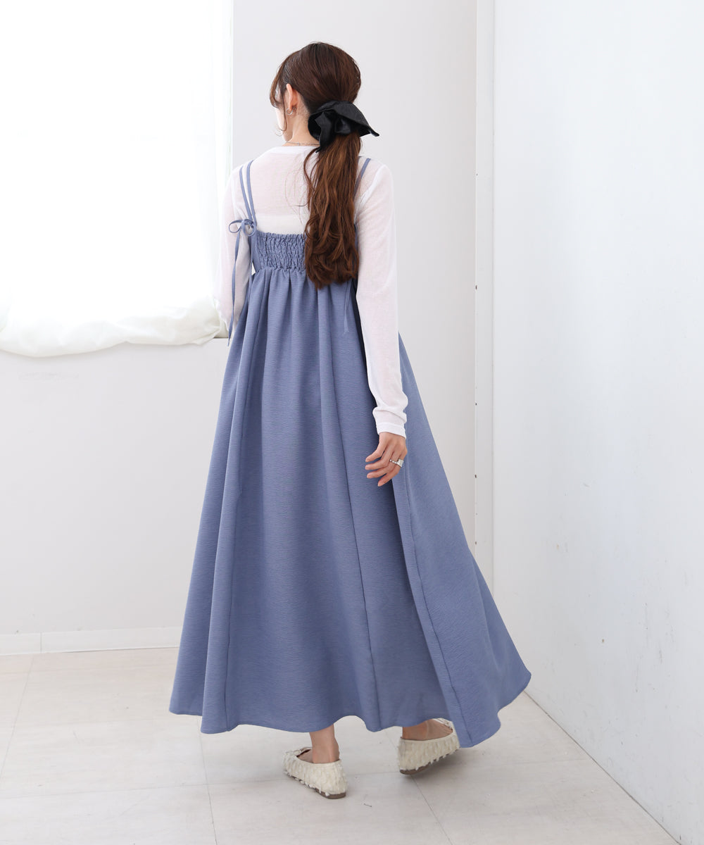 胸元部分からふわっと柔らかく広がるフレアキャミワンピが登場!まるでビスチェとフレアスカートが一枚になったようなフェミニン感あふれるワンピースです。夏から秋にかけてぴったりな硬すぎず薄すぎずな生地感に仕上がっています。上身頃後ろの部分はゴムになっているので着心地よくなっています。長袖のシアーカーディガンと合わせると夏から秋にかけての気温にぴったりなコーデが完成します。